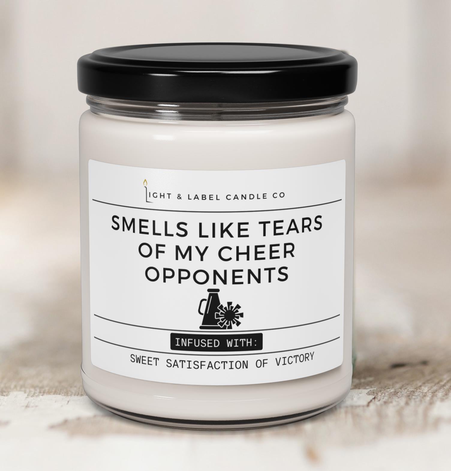 Celebrate every win with this bold soy wax candle that says “Smells Like Tears of My Cheer Opponents. Infused with: the sweet satisfaction of victory.” Perfect for cheerleaders, coaches, and cheer squads who love a little sass with their sparkle. This funny yet motivational candle makes a unique gift that captures the spirit of competition—and the joy of coming out on top.