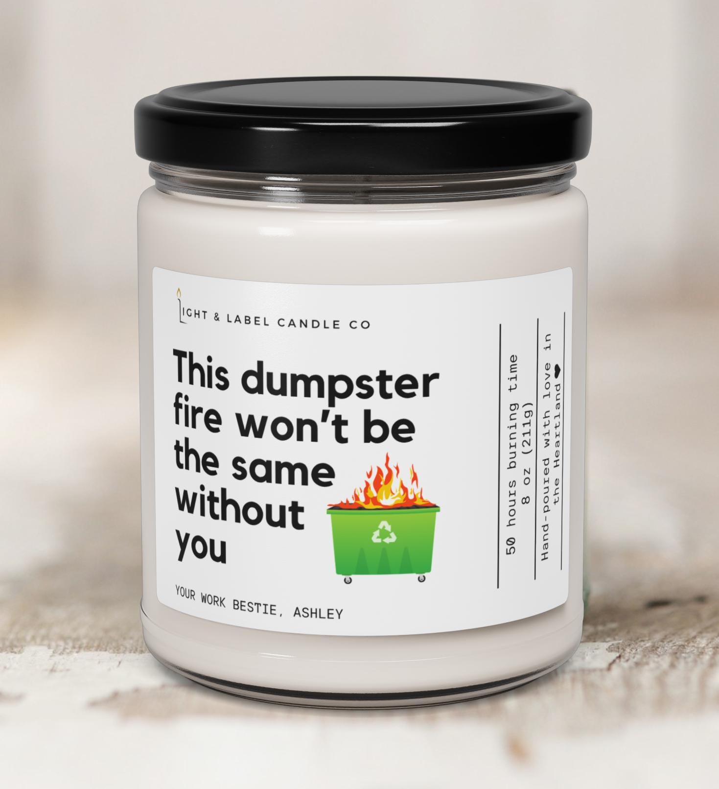 The perfect send-off gift for your favorite co-worker who’s braving greener pastures (or just escaping the office chaos). This cheeky soy wax candle is a mix of humor and heart—because let’s be honest, every workplace has its dumpster fire moments, and it just won’t be the same without them.