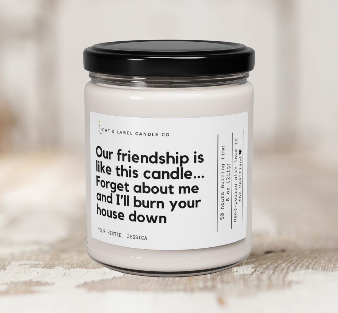 Celebrate your loyal friendship with this funny candle gift that your BFF will love! "Our Friendship Is Like This Candle: Forget About Me and I’ll Burn Your House Down" soy wax candle is here to add a spark of humor and warmth to any room—plus a hint of friendly warning. Hand-poured with 100% natural soy wax, this candle offers a clean, long-lasting burn