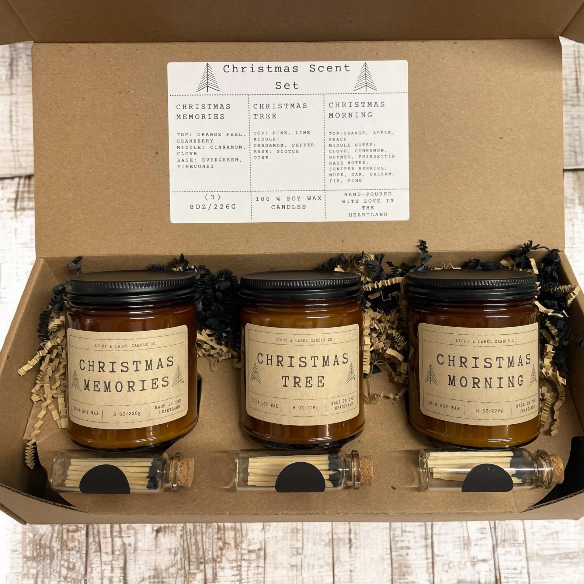 Set includes - (3) - 8 oz Soy Wax Candles & (2) Jars of Matches
