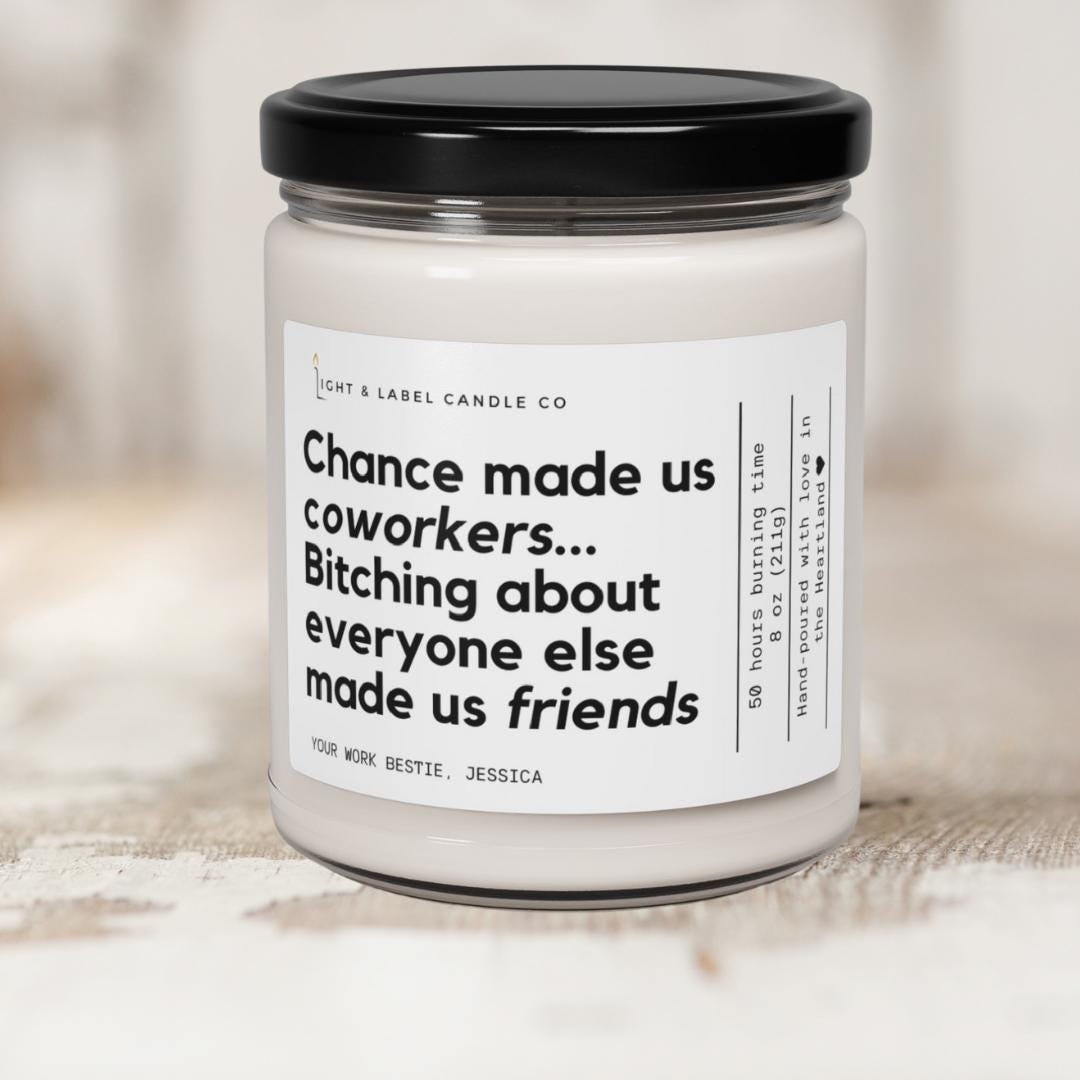 Light up the bond that only true coworkers-turned-friends can understand! Our "Chance Made Us Coworkers, Bitching About Everyone Else Made Us Friends" soy wax candle is the perfect tribute to your work bestie—the one who always gets it, no matter how rough the day. This hand-poured candle is crafted from 100% natural soy wax, providing a clean and long-lasting burn that fills any room with a comforting aroma