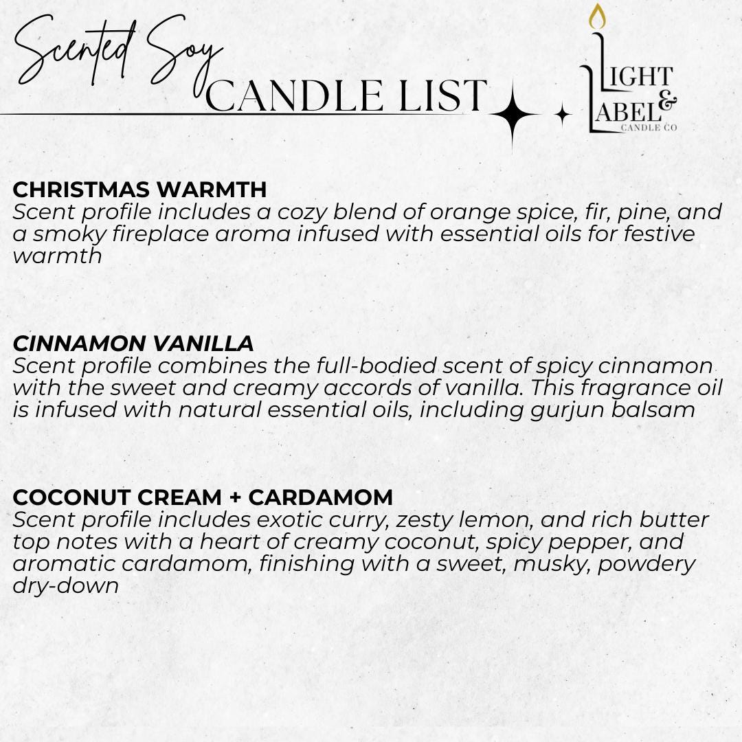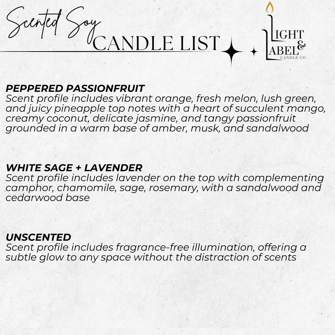 INGREDIENTS & SIZING Our candles are made from soy wax 🕯️—100% natural wax derived from vegetable soybeans—as well as 100% vegan, cruelty-free, and feature a 100% cotton wick 🌿, all natural and non-toxic. 🚫 We use fragrance oils that are 100% free from phthalates, toxins, carcinogens, and other hazardous chemicals commonly found in fragrance oils. 🚫🔬 Standard 9 oz Candle Jar Diameter: 2.75 in Height: 3.5 in
