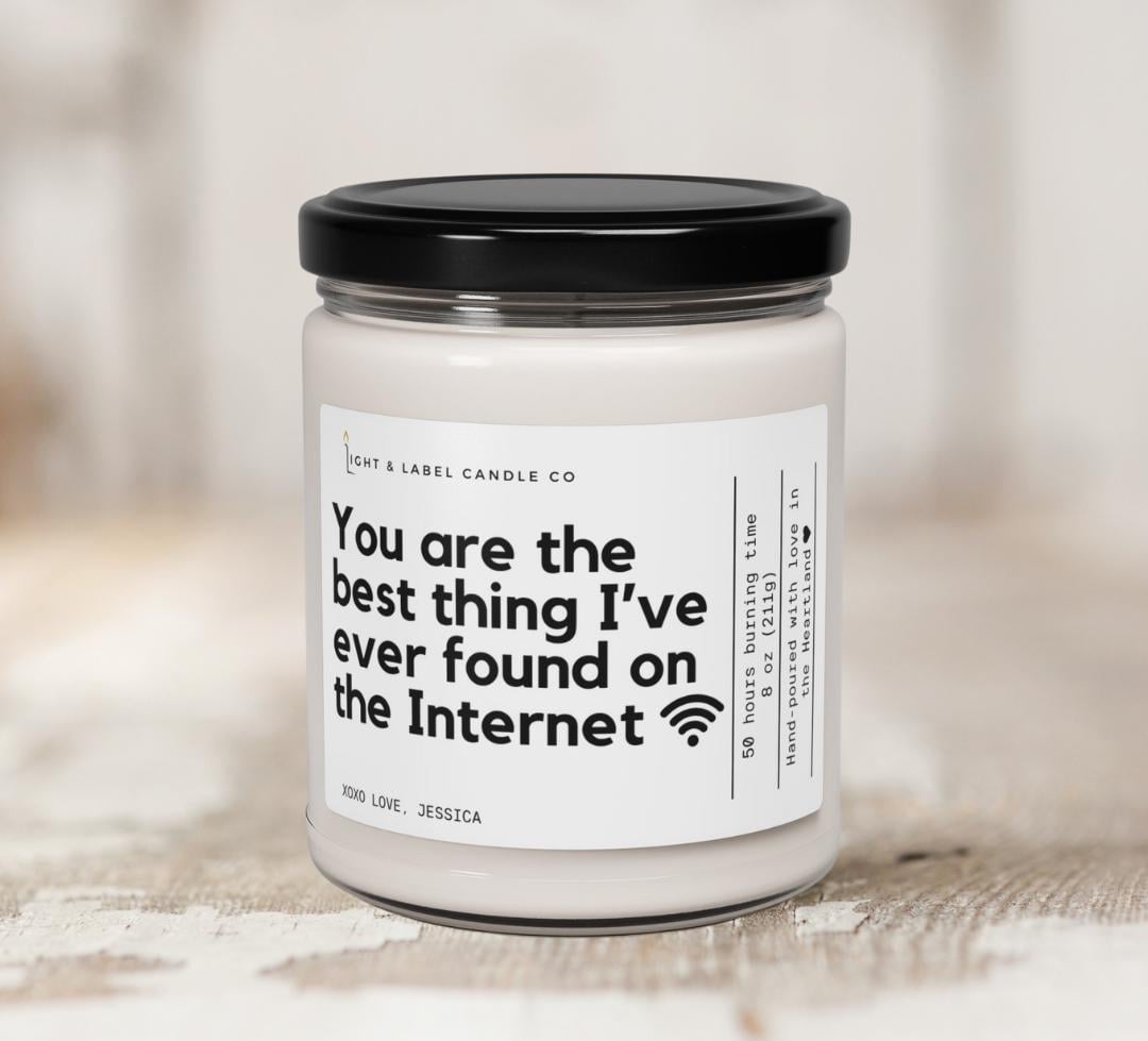 Our Soy Wax Candle is more than just a candle—it's a heartfelt statement. Featuring the playful and romantic message, "You are the best thing I've ever found on the Internet," this candle is the perfect way to express your affection or appreciation for that special someone.