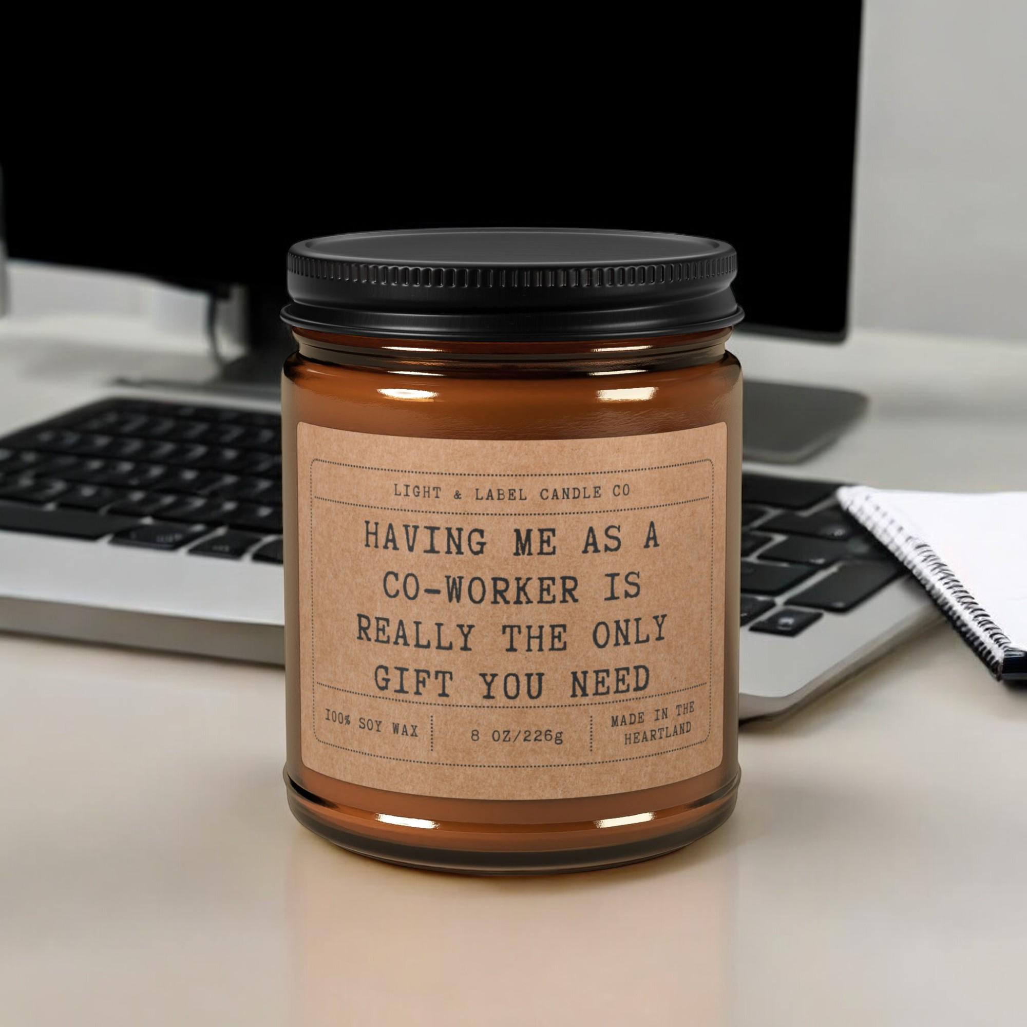 Crafted from 100% natural soy wax, it burns cleanly and evenly, ensuring hours of aromatic bliss. The cheeky message, "Having Me as a Co-Worker is Really the Only Gift You Need," is elegantly printed on the jar, adding a touch of humor and charm to any desk.