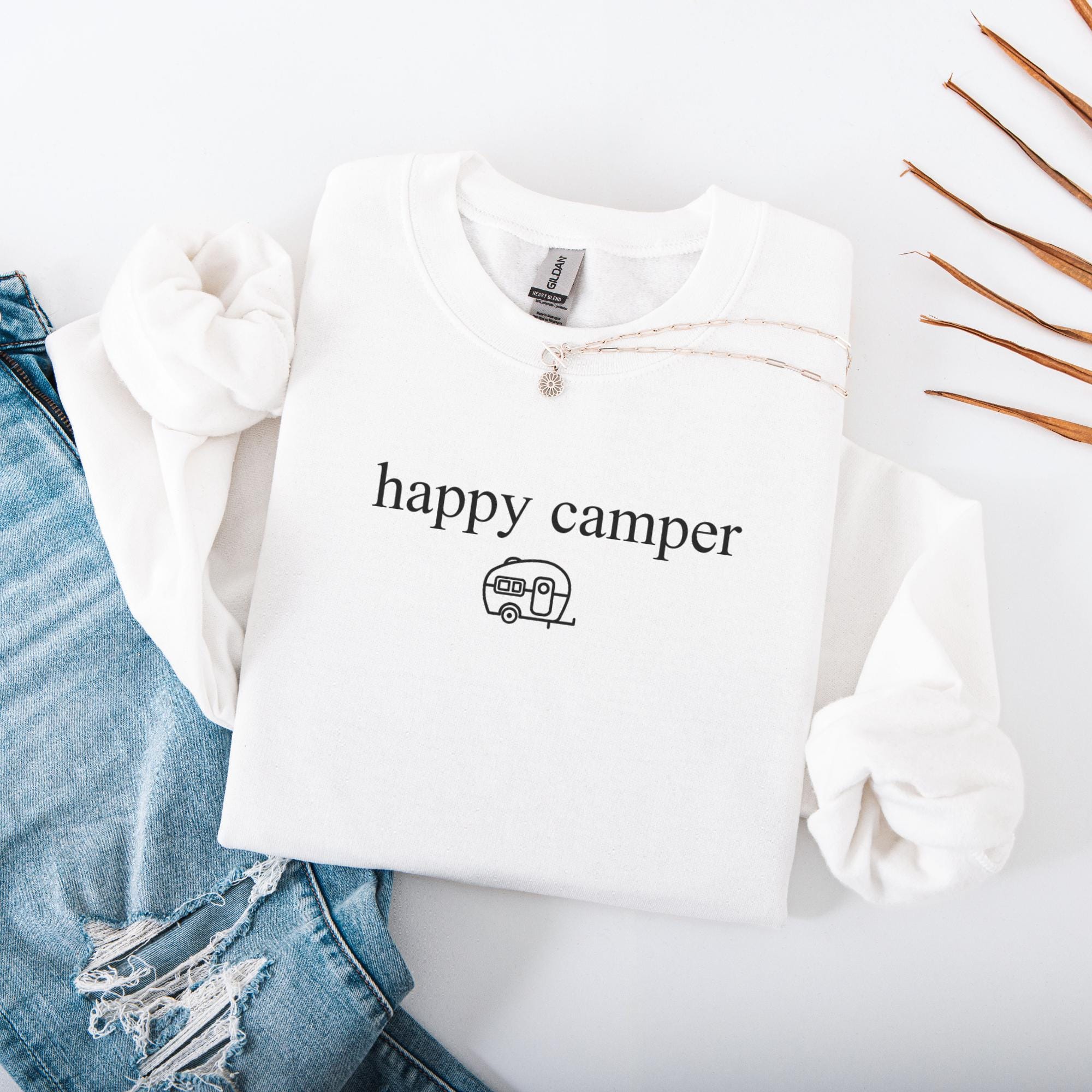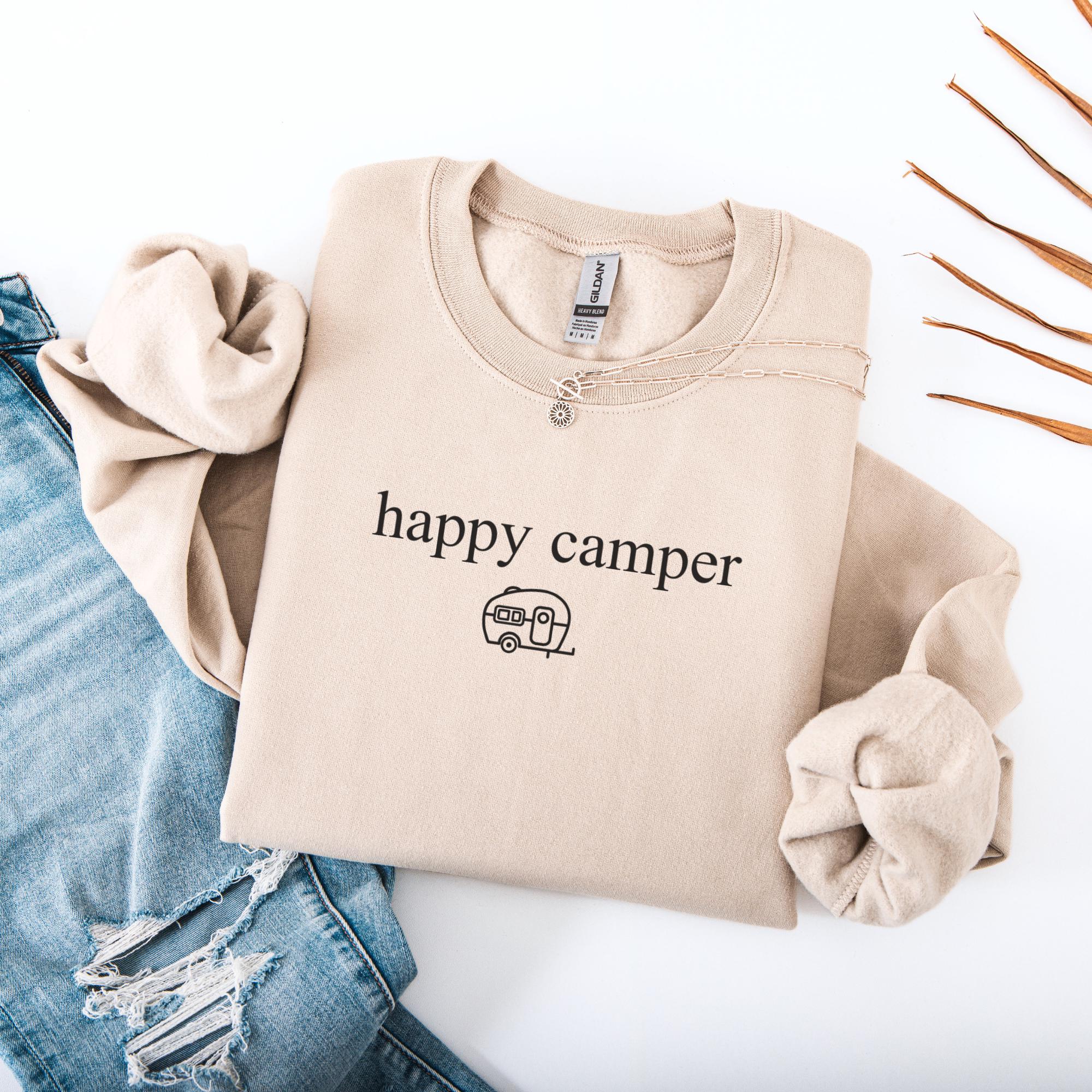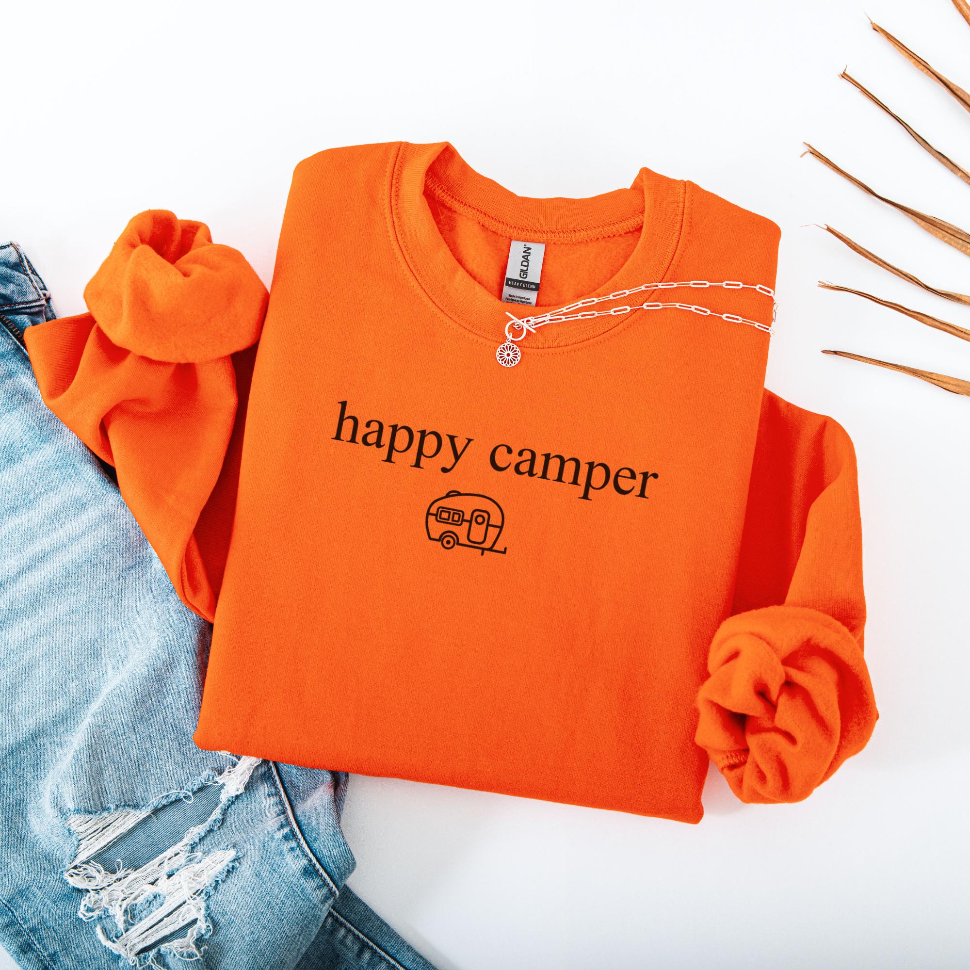 Show off your love for the great outdoors with this cheerful “Happy Camper” sweatshirt. Whether you’re sitting around a campfire, exploring nature trails, or just enjoying cozy nights in, this comfy crewneck is the perfect way to share your adventurous spirit. With its simple, fun design, it’s a must-have for camping trips, road trips, and everyday wear.