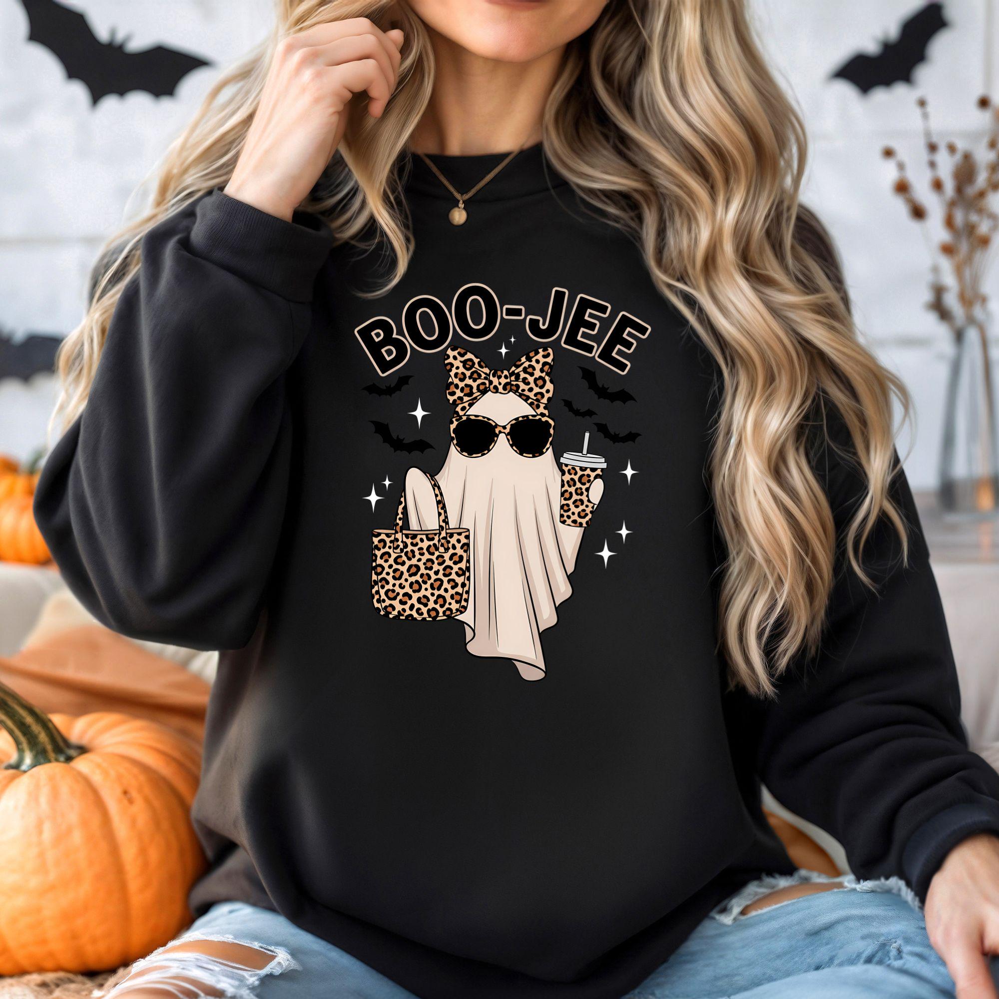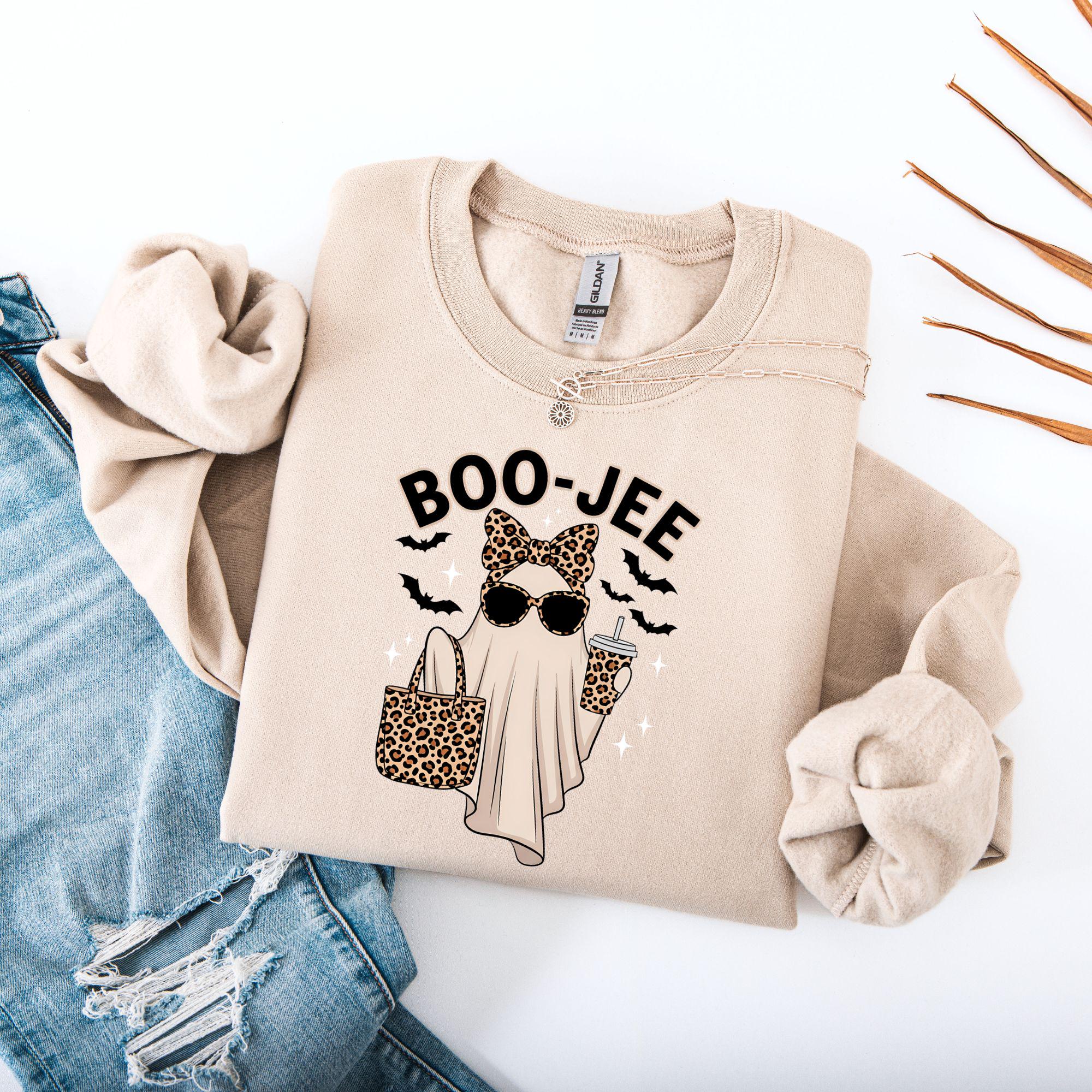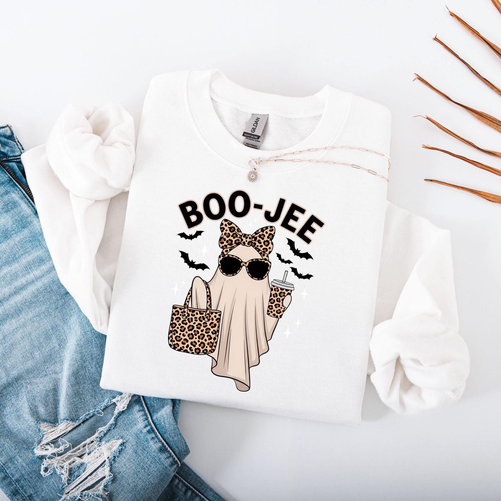 Show off your spooky side with a touch of glam in this BOO-JEE Halloween Sweatshirt! Featuring a chic ghost decked out with leopard print accessories, sunglasses, and a stylish iced coffee in hand, this sweatshirt is the perfect mix of spooky and boujee. Surrounded by flying bats and sparkle details, it’s a festive must-have for Halloween season.
