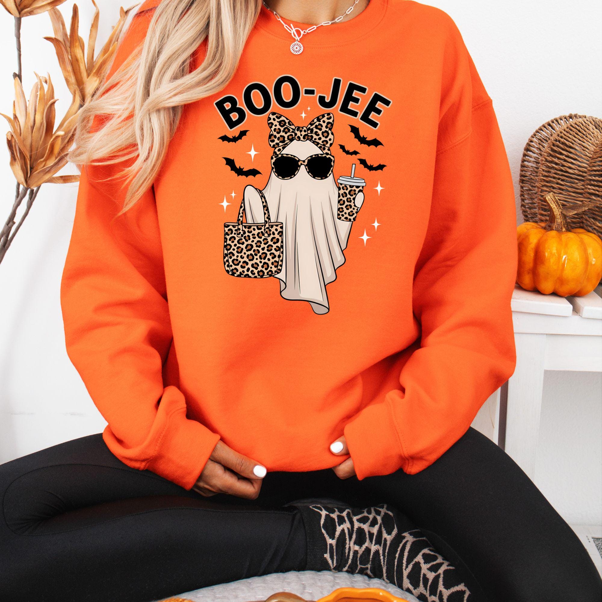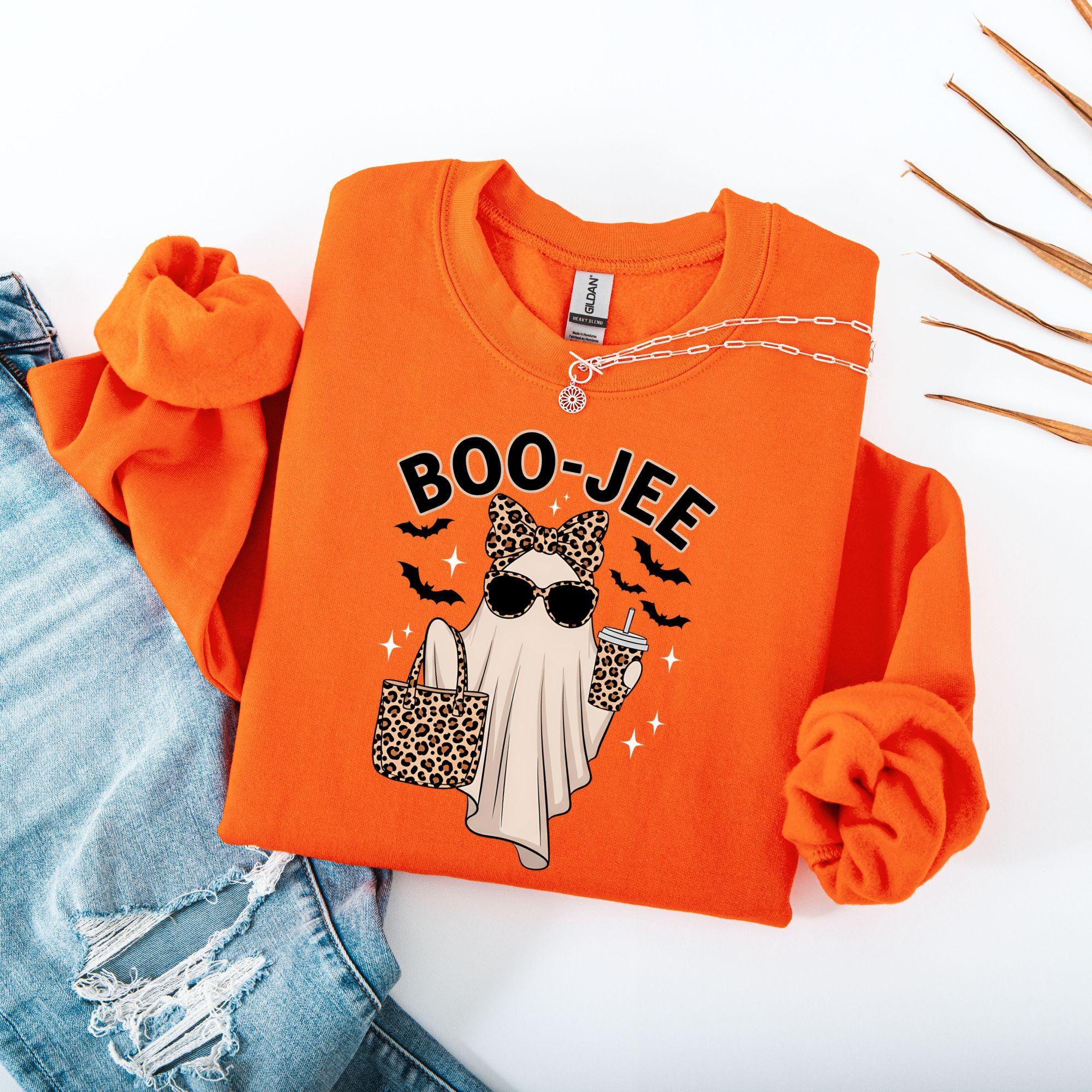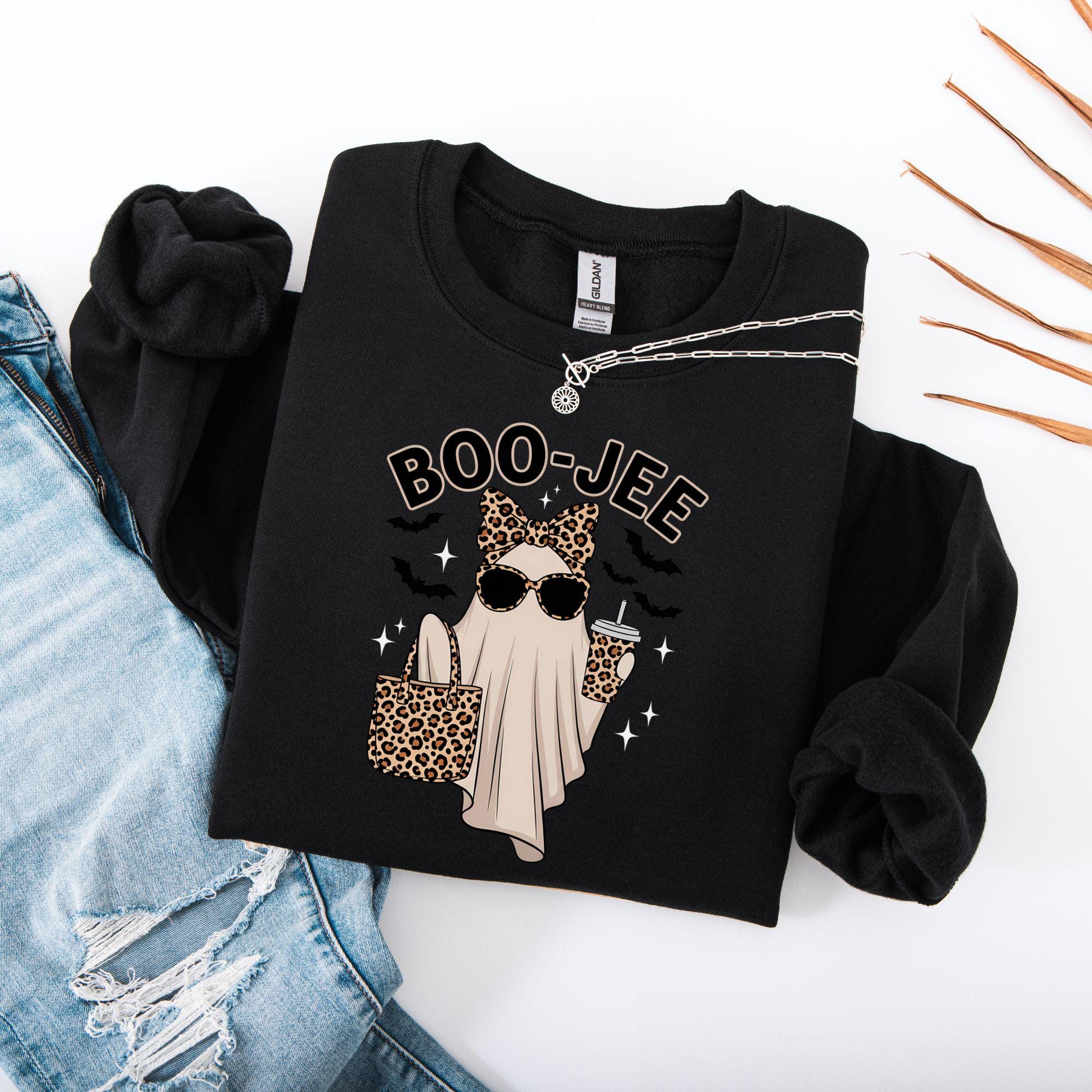 Show off your spooky side with a touch of glam in this BOO-JEE Halloween Sweatshirt! Featuring a chic ghost decked out with leopard print accessories, sunglasses, and a stylish iced coffee in hand, this sweatshirt is the perfect mix of spooky and boujee. Surrounded by flying bats and sparkle details, it’s a festive must-have for Halloween season.