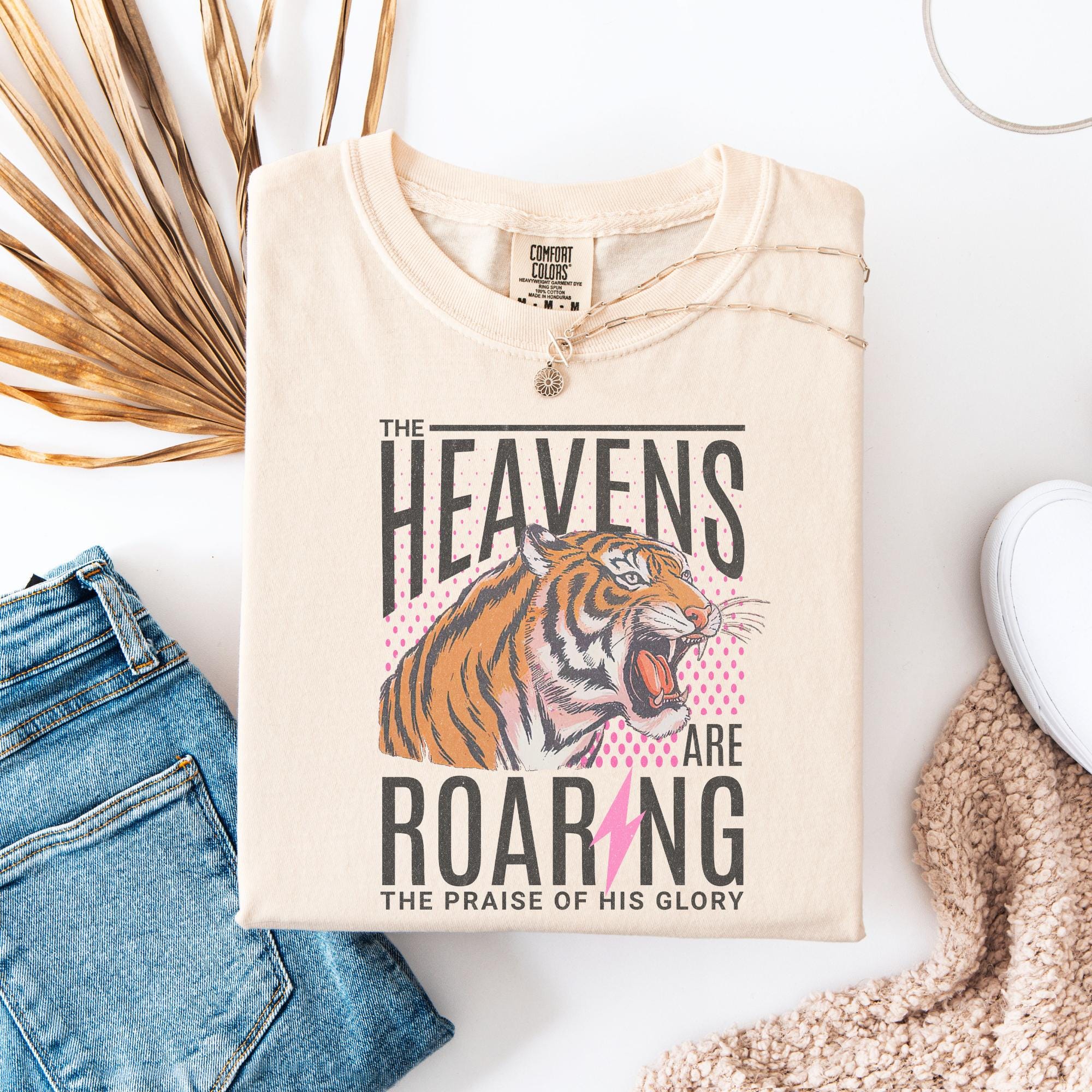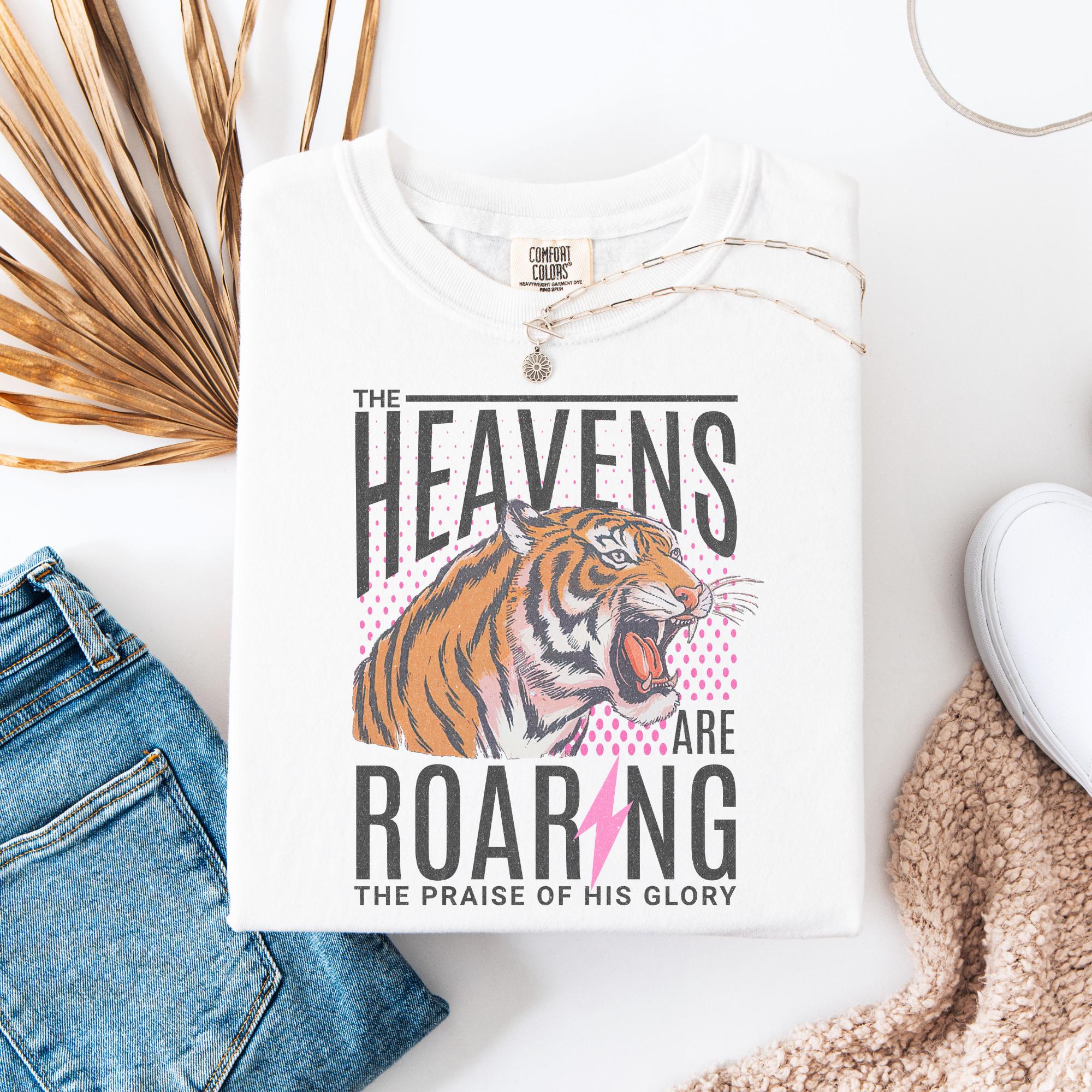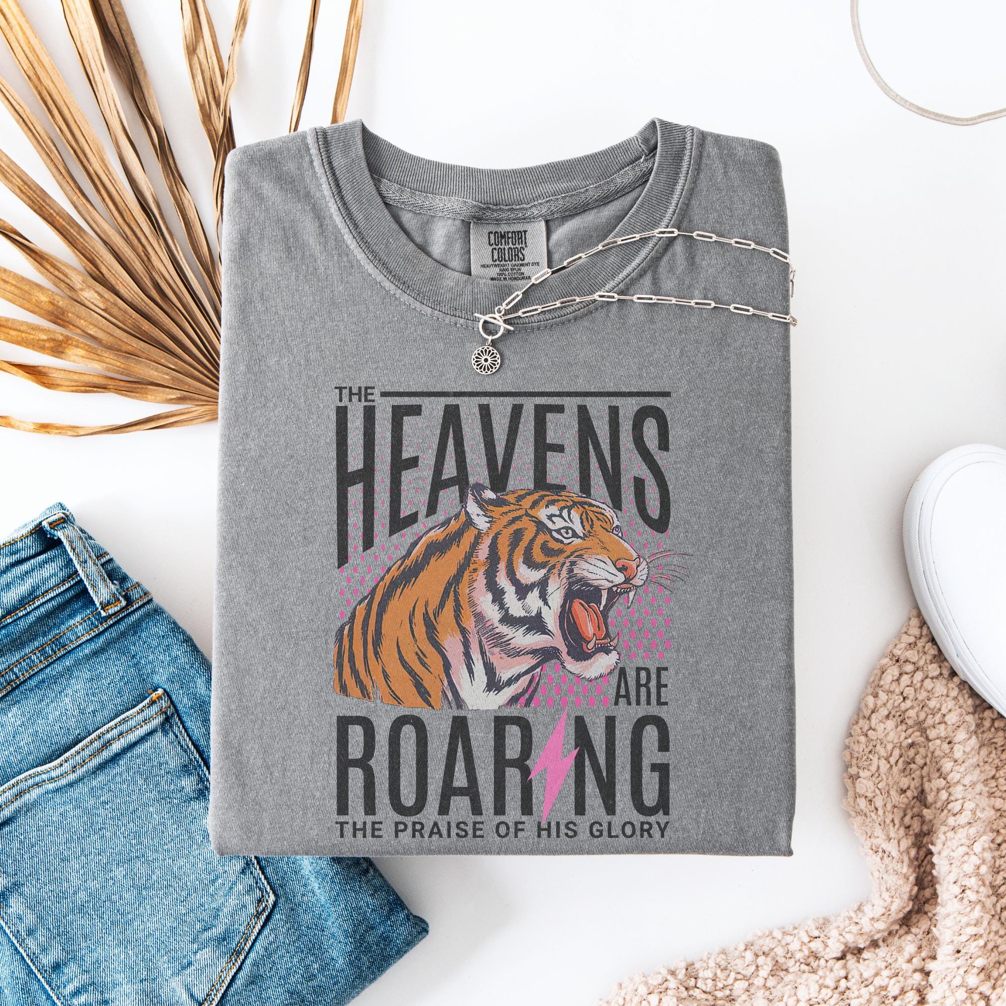 Make a bold statement of faith and style with this vintage-inspired Comfort Colors® t-shirt featuring a fierce roaring tiger and the words: “The Heavens Are Roaring, The Praise of His Glory.” With its retro design and powerful message, this Christian graphic tee is perfect for everyday wear, worship nights, or gifting to someone who loves to wear their faith proudly.