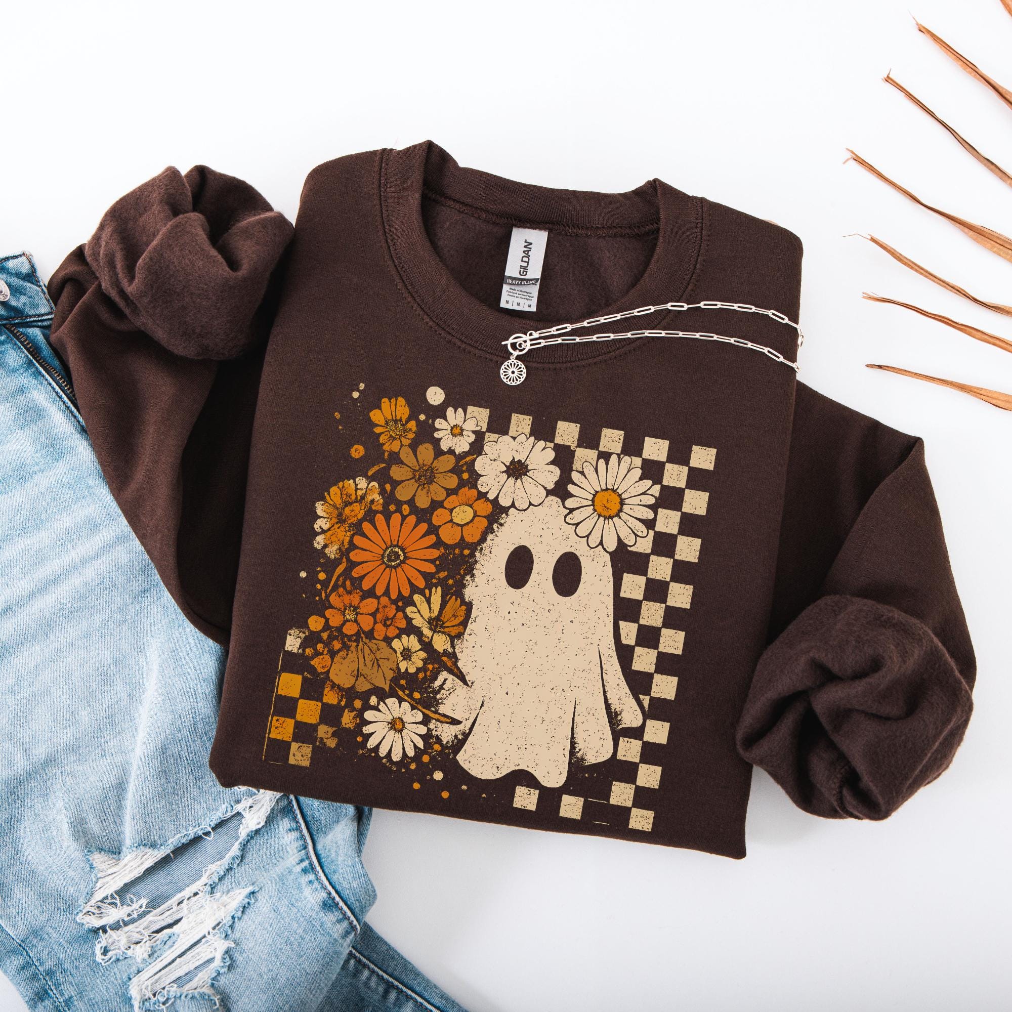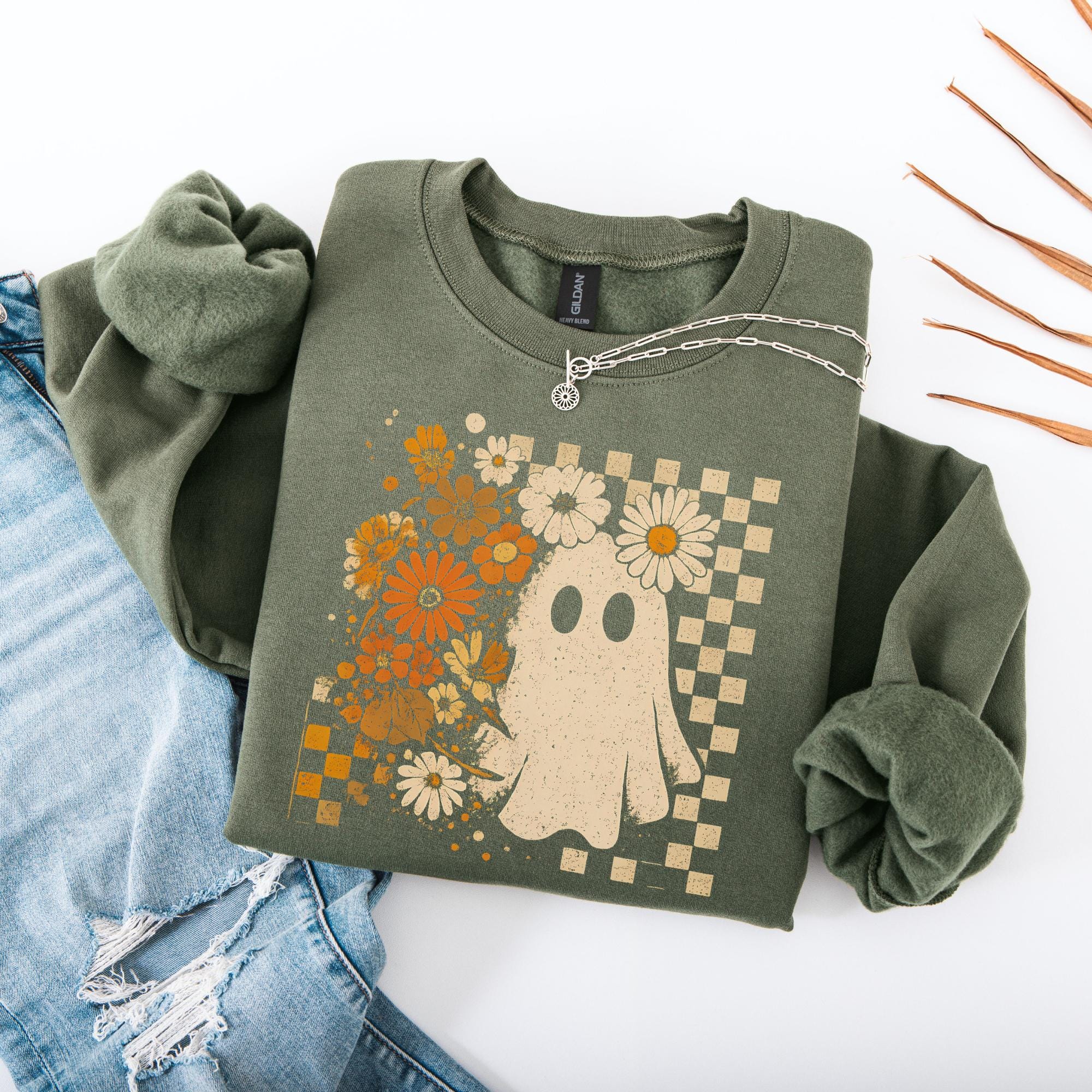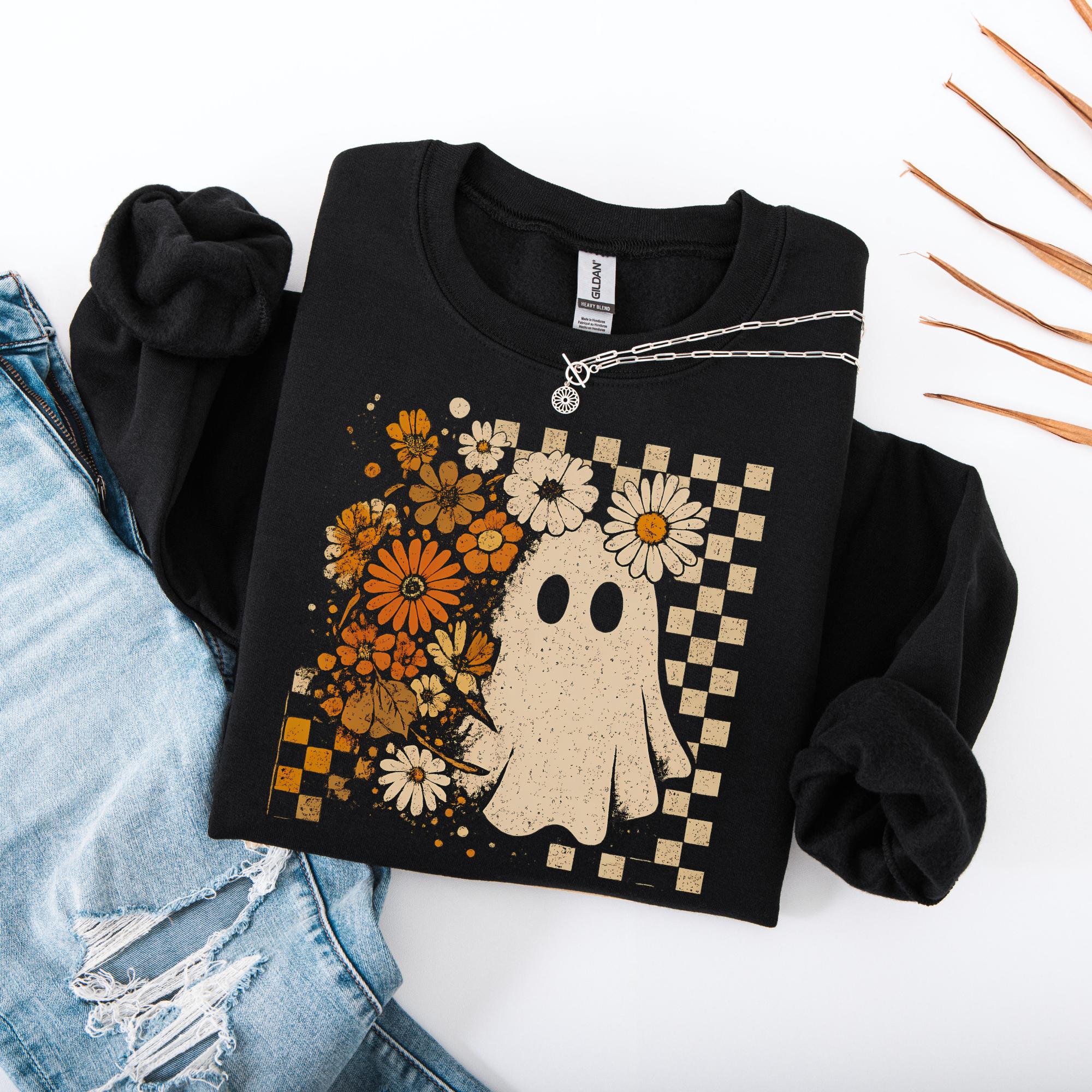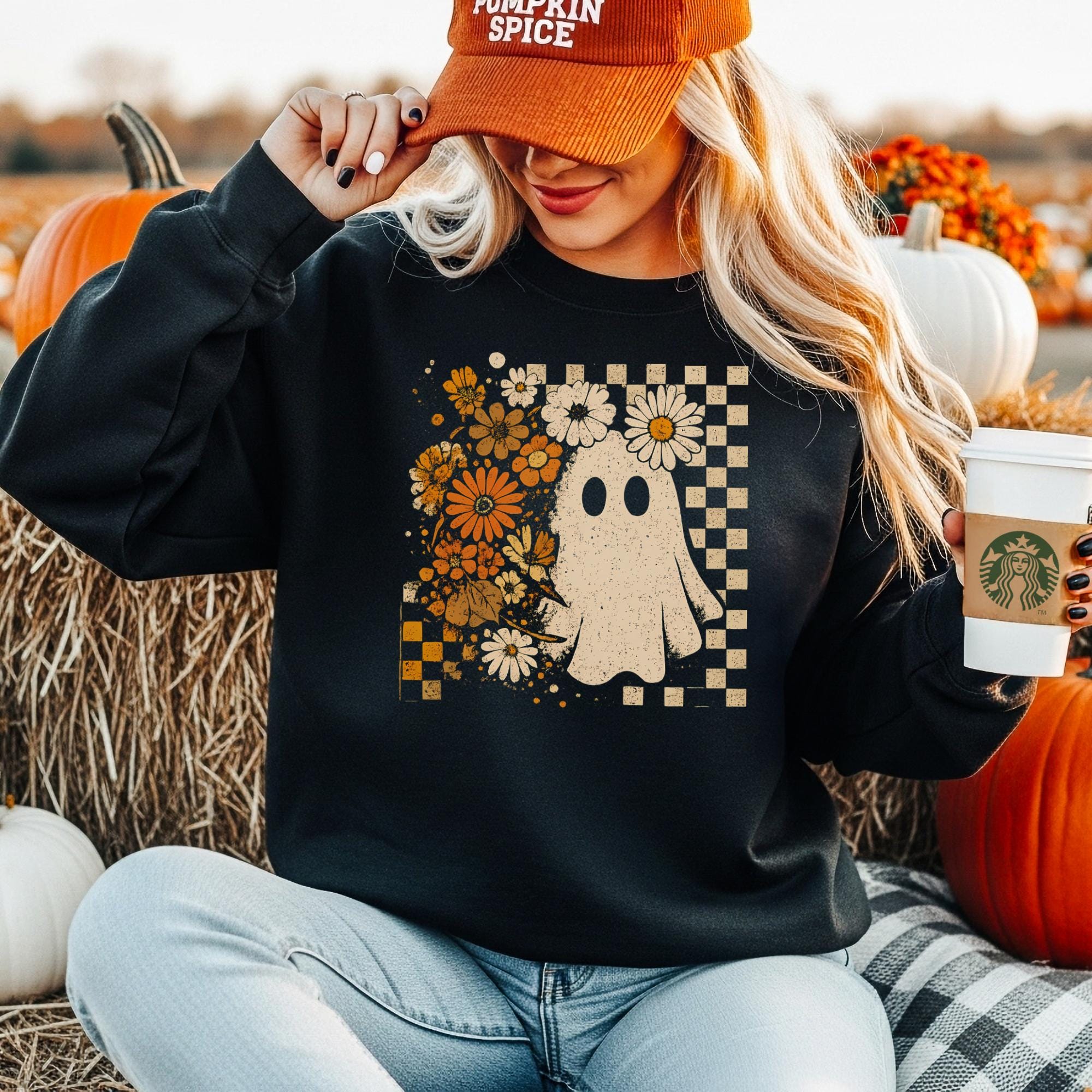 Spooky meets stylish in this cozy retro-inspired sweatshirt! Featuring a playful ghost design surrounded by vintage checkered patterns and whimsical floral accents, this sweatshirt adds a fresh twist to classic Halloween vibes. It’s perfect for pumpkin patch strolls, haunted hayrides, or simply sipping cider on a crisp fall evening.