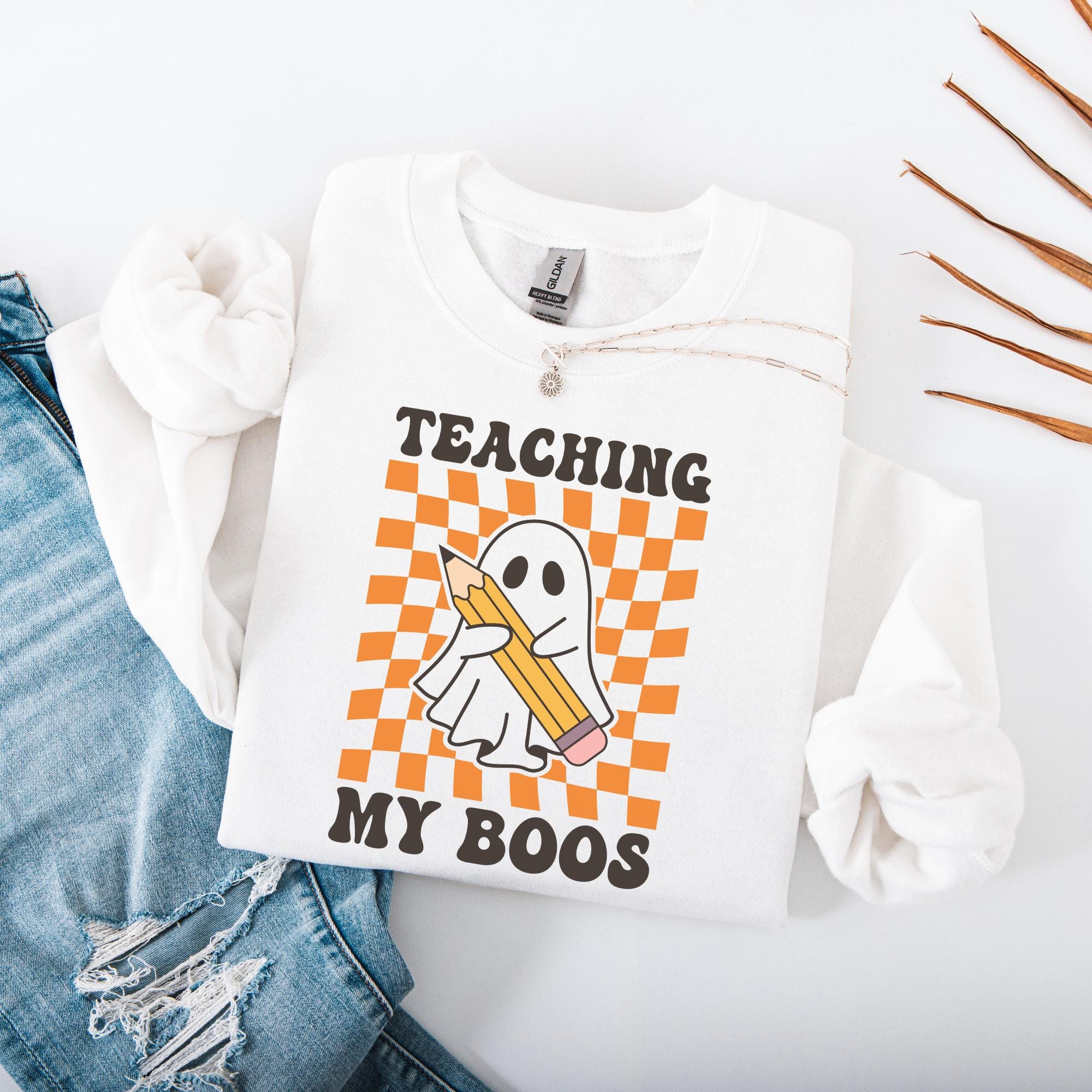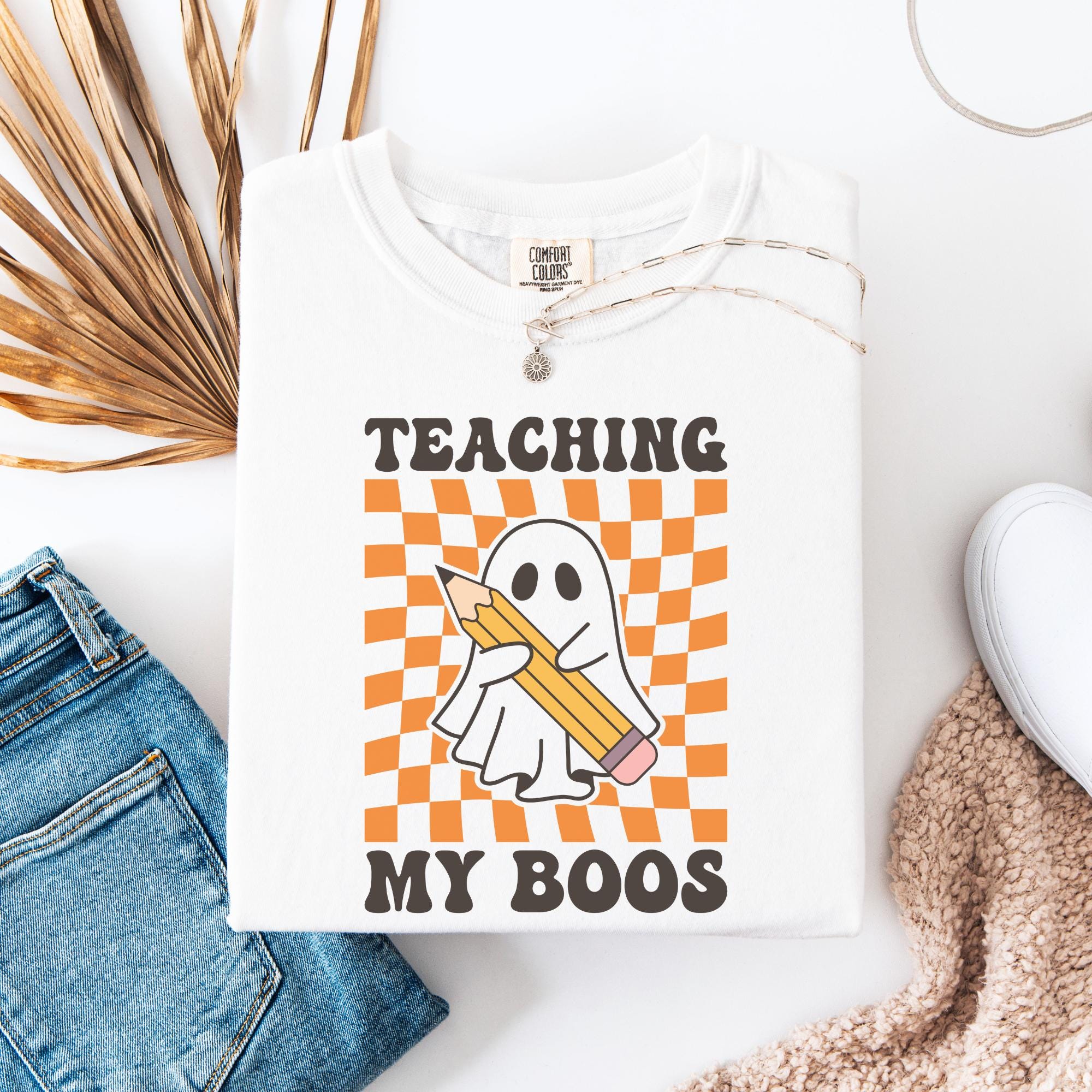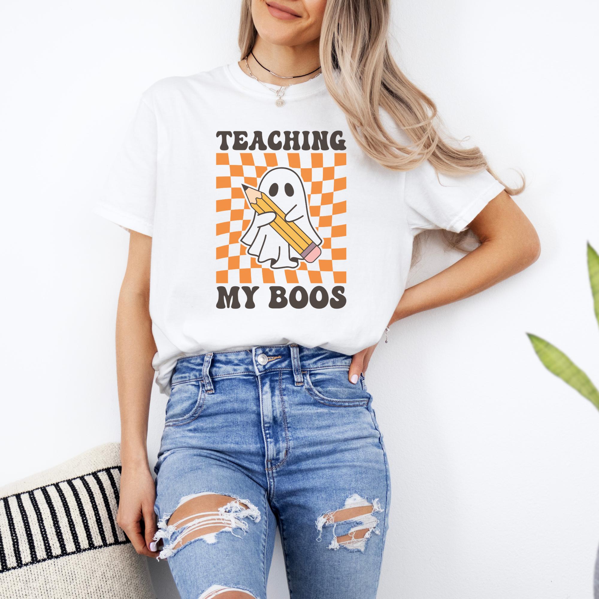 Description: Bring spooky season straight into the classroom with our “Teaching My Boos” shirt — a must-have for teachers who love Halloween! This retro-inspired tee features a playful ghost holding a pencil, checkered background accents, and groovy lettering for that perfect mix of festive and fun.