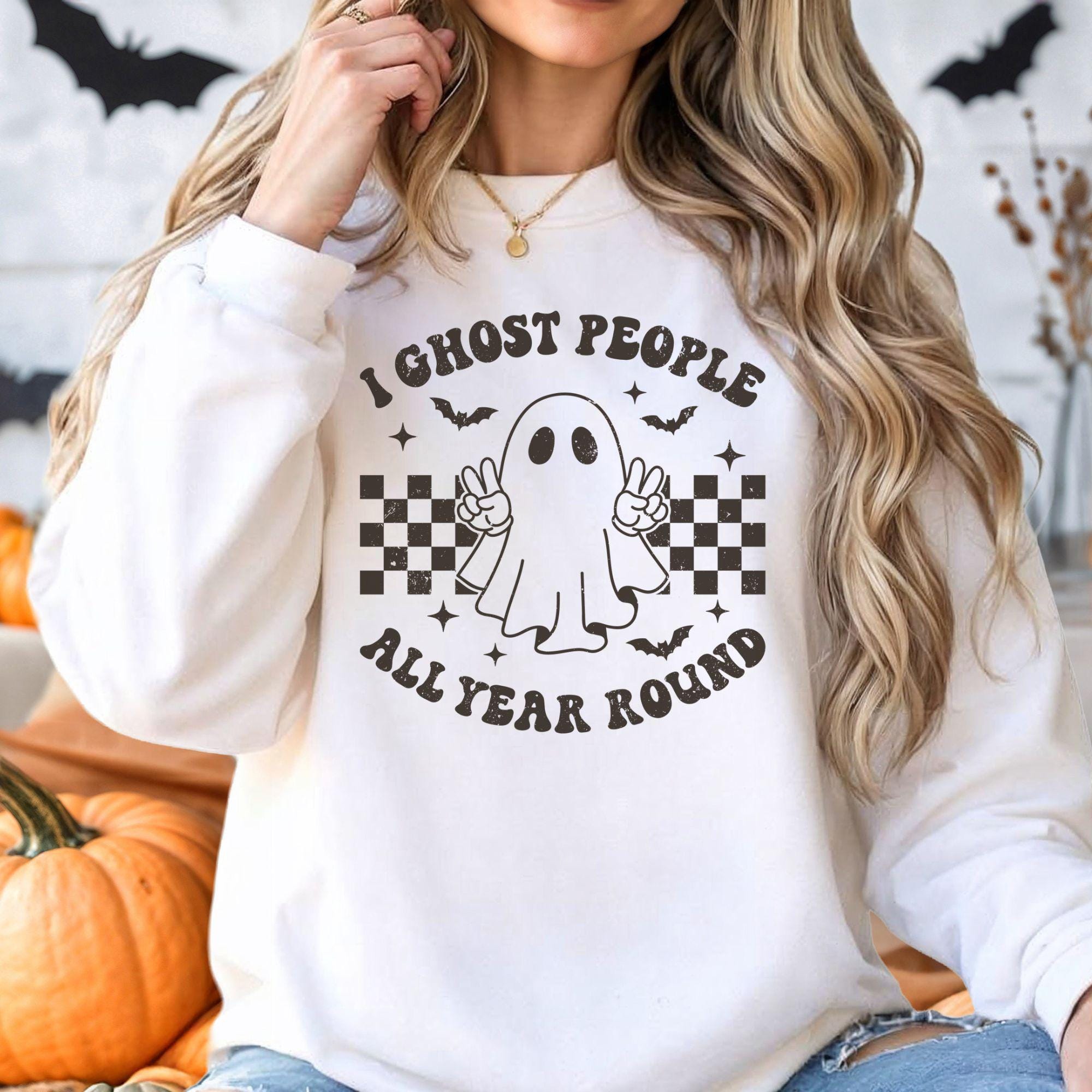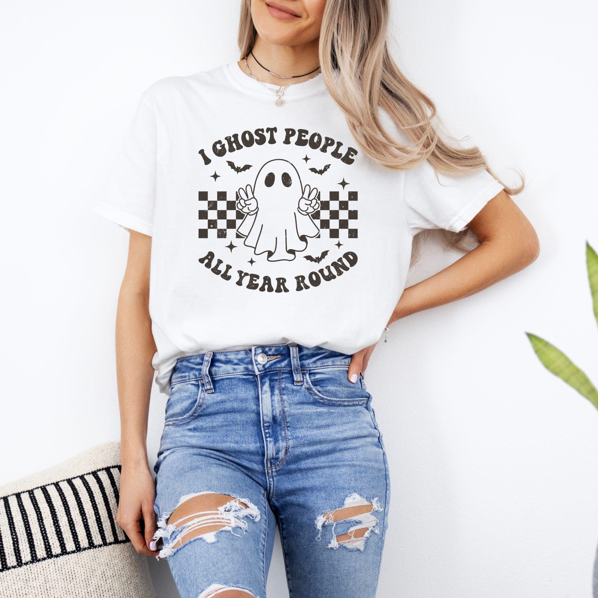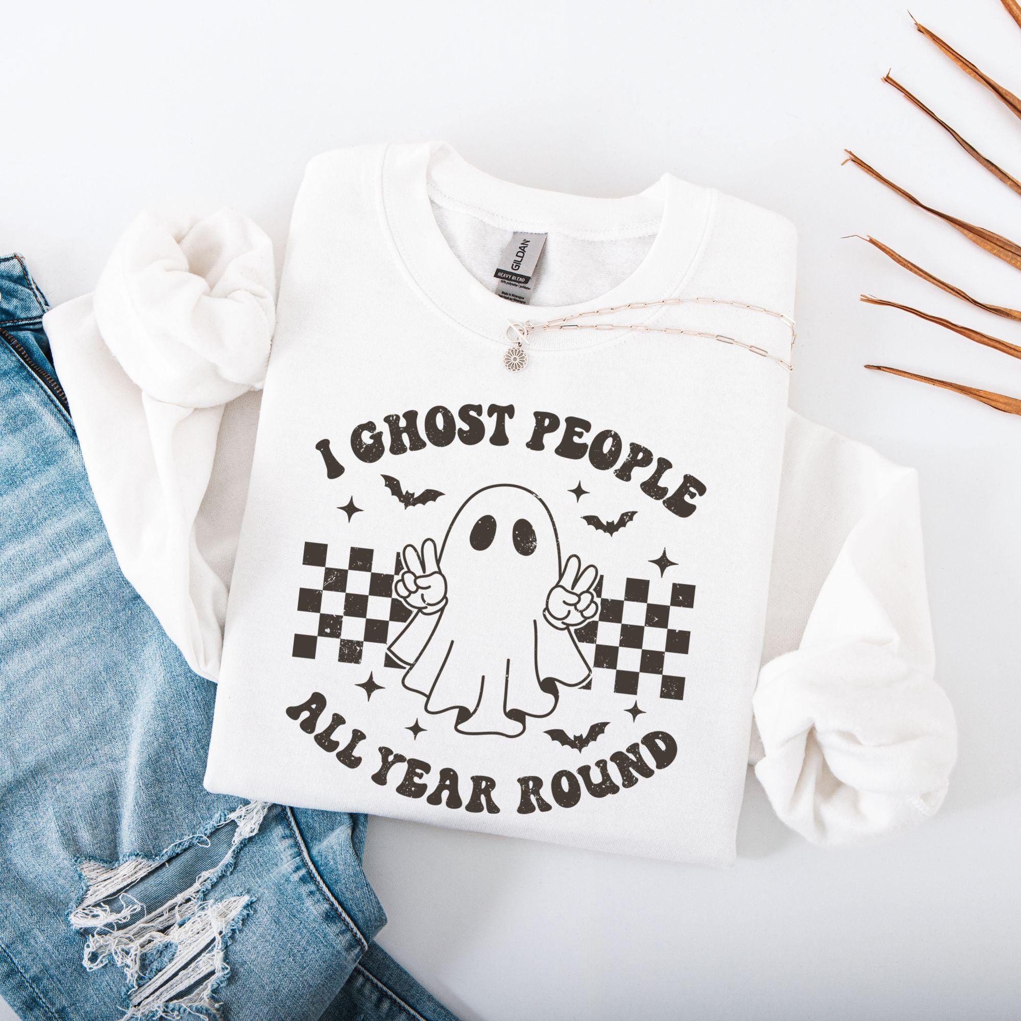 Description: Spooky season doesn’t end in October — and this “I Ghost People All Year Round” shirt is here to prove it! Featuring a playful retro-style ghost with checkered accents, this tee is perfect for anyone who loves a good laugh and a touch of vintage Halloween vibes all year long.