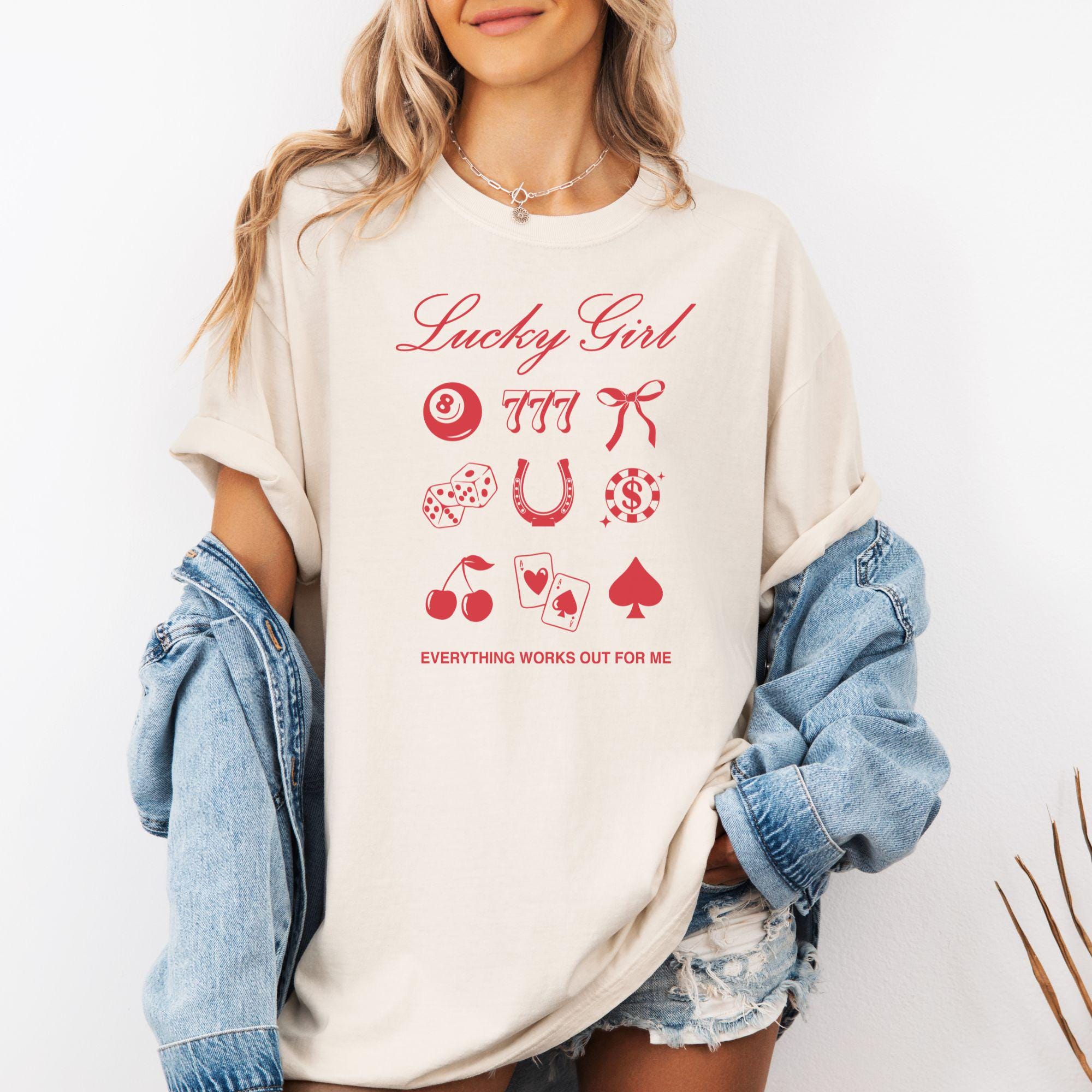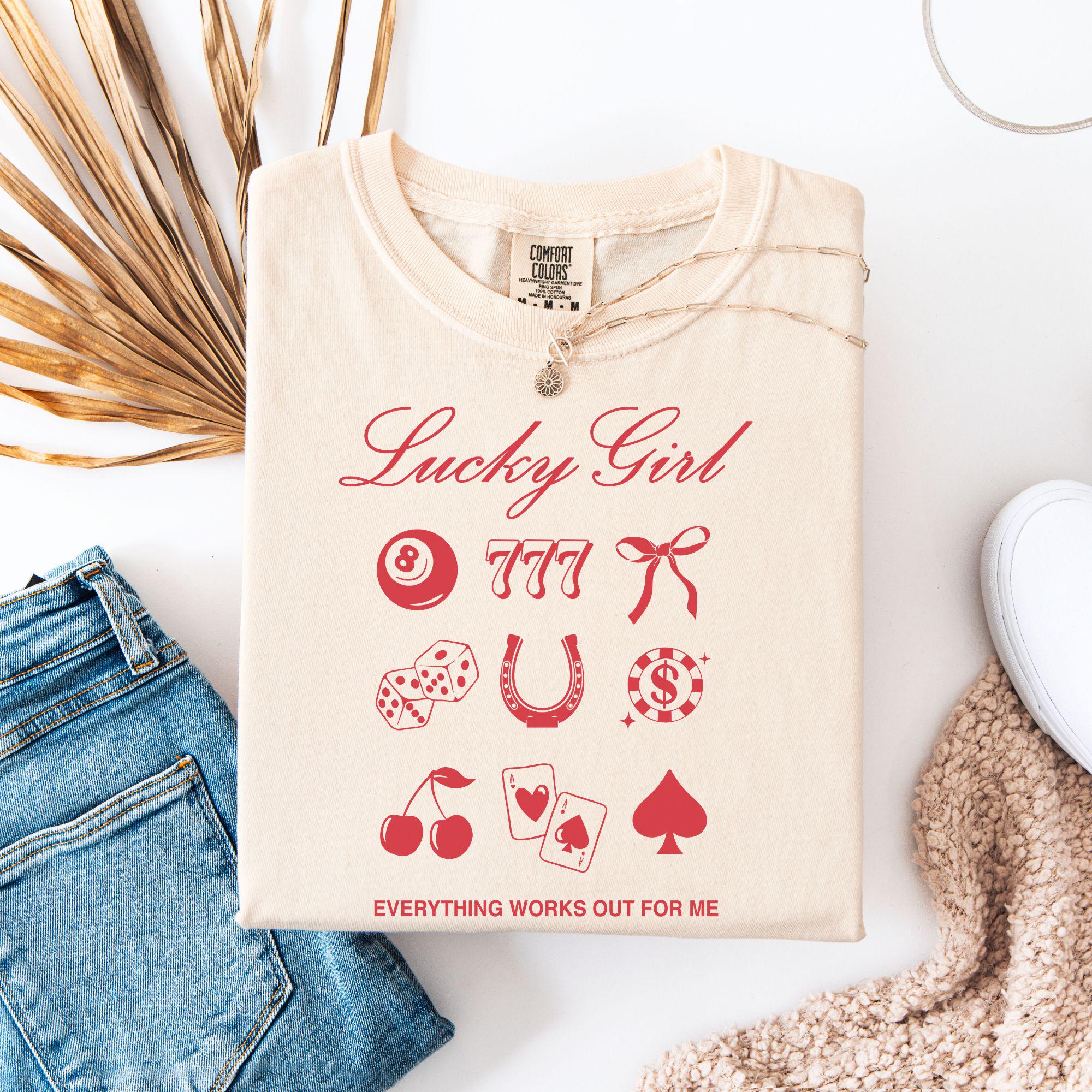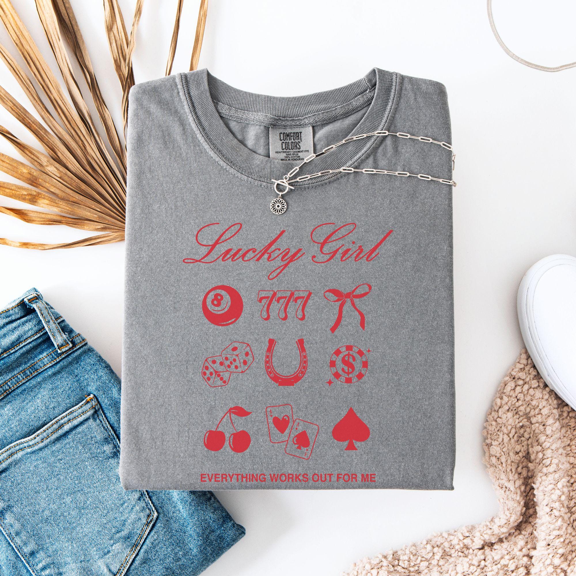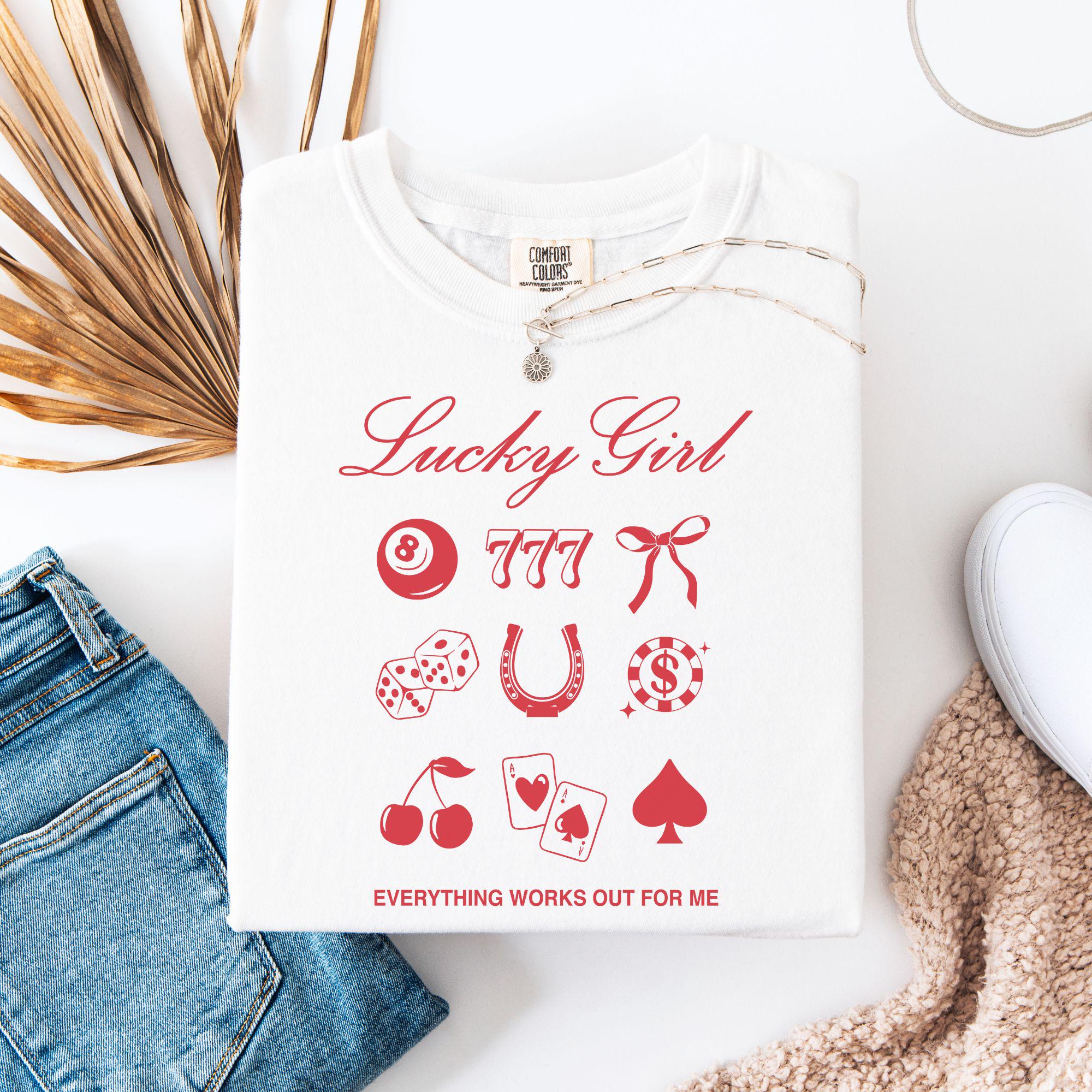 Manifest good vibes and effortless style with our Lucky Girl graphic tee! Featuring bold red icons like cherries, dice, horseshoe, 777s, and more, this shirt captures all the charm of the Lucky Girl Syndrome mindset: “Everything works out for me.” Paired with the soft, vintage feel of a Comfort Colors® tee, it’s the perfect mix of cozy and confident.
