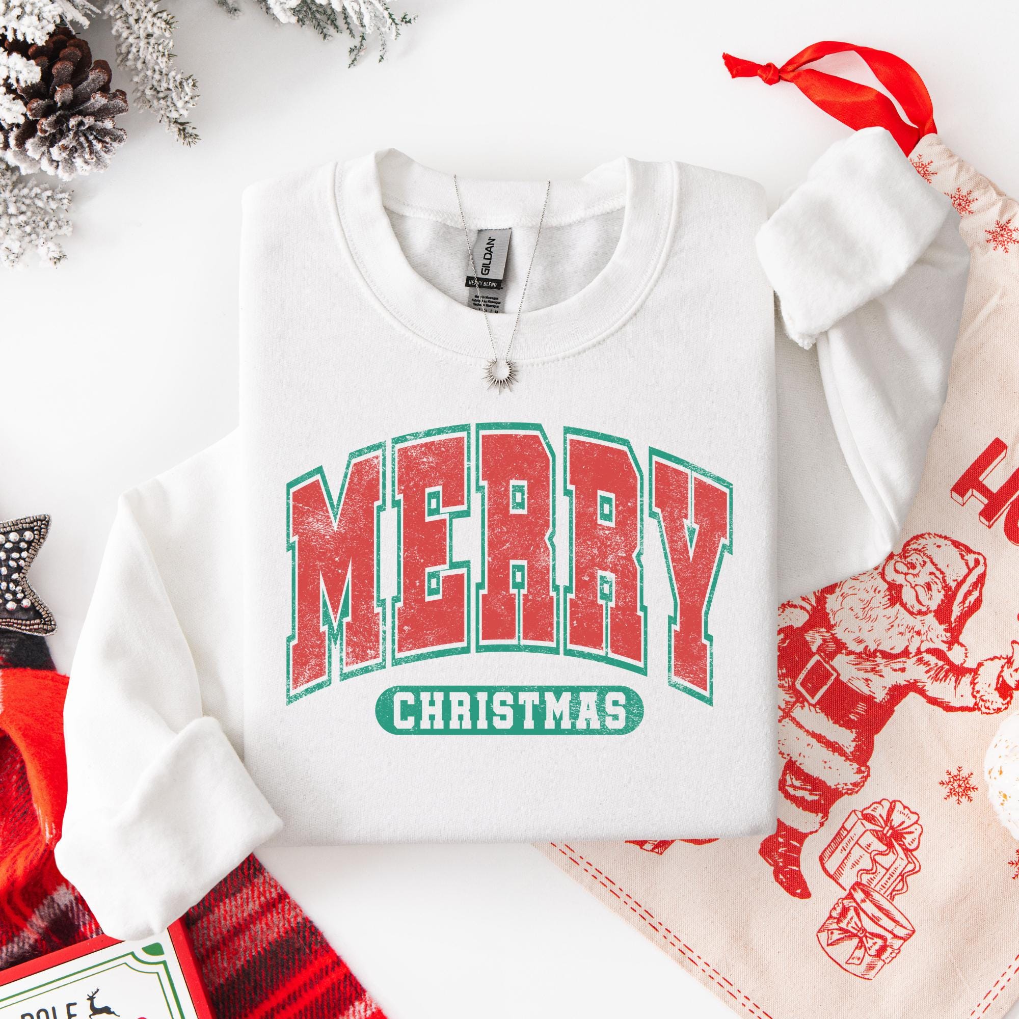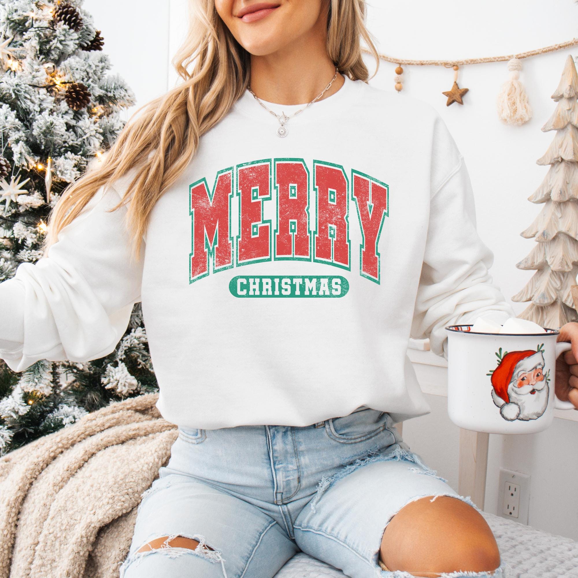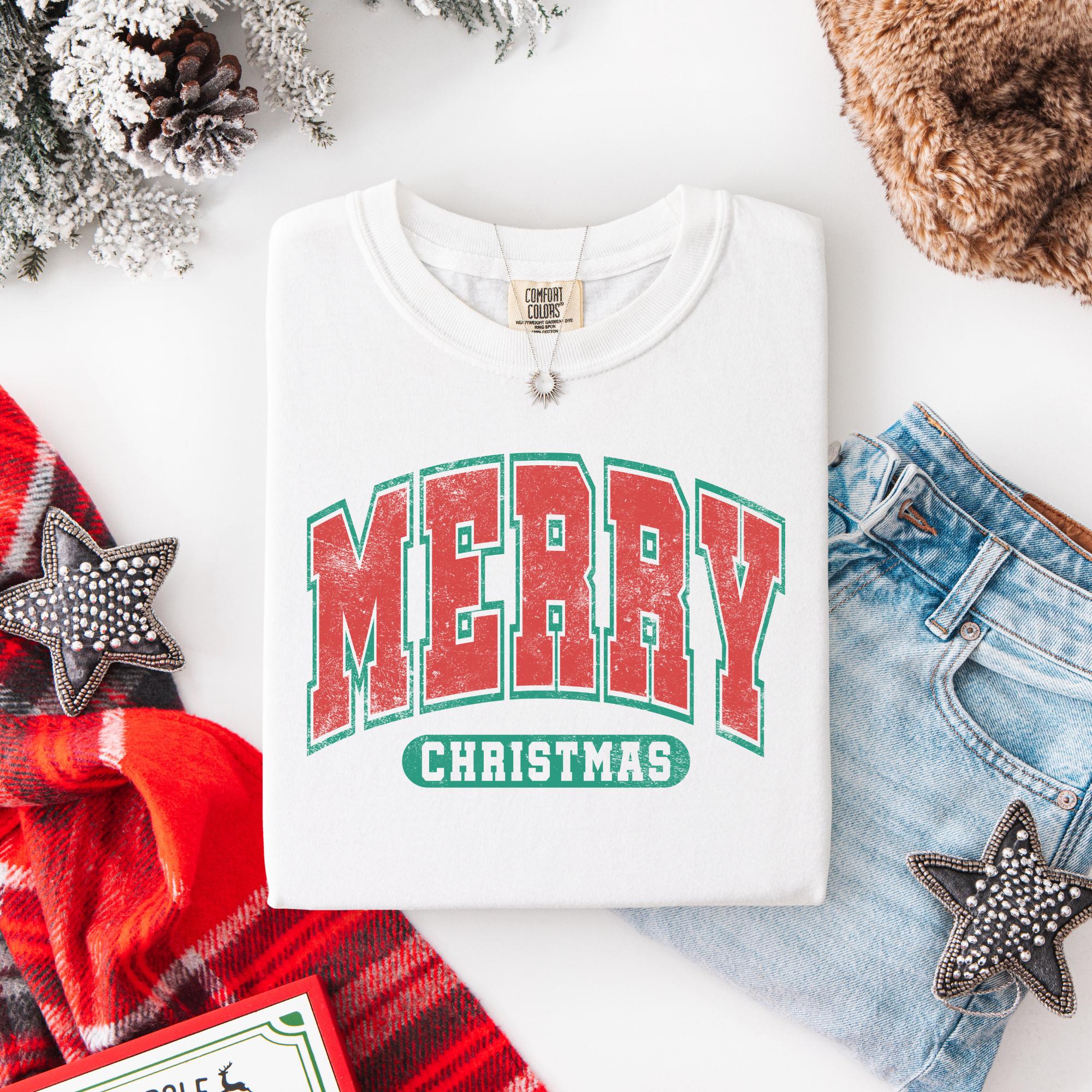Bring holiday cheer wherever you go with this festive Merry Christmas sweatshirt! Featuring a bold red and green vintage collegiate-style design, this cozy crewneck is the perfect mix of classic Christmas spirit and trendy retro vibes. Whether you’re decorating the tree, sipping hot cocoa, or heading to a holiday party, this sweatshirt will keep you warm and merry all season long.