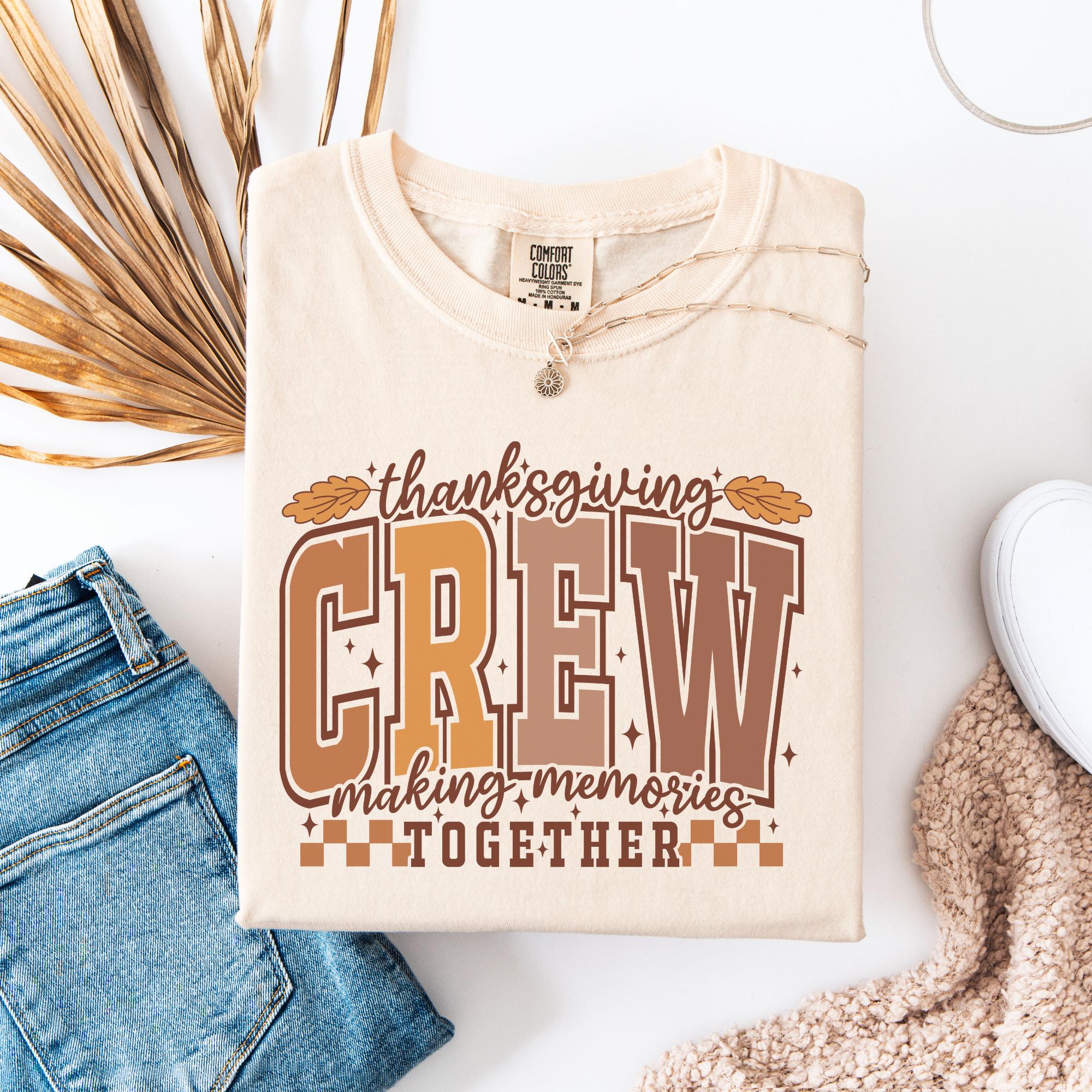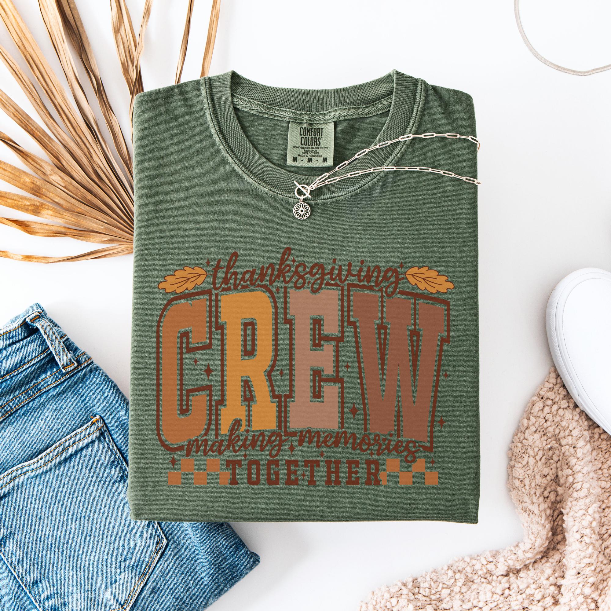 Celebrate togetherness this season with our Thanksgiving Crew Comfort Colors shirt! Featuring a warm autumn-inspired design with the phrase “Thanksgiving Crew – Making Memories Together”, this cozy tee is perfect for family gatherings, Friendsgiving celebrations, and festive holiday fun. Its retro-style lettering and earthy tones make it a standout piece you’ll love to wear year after year.