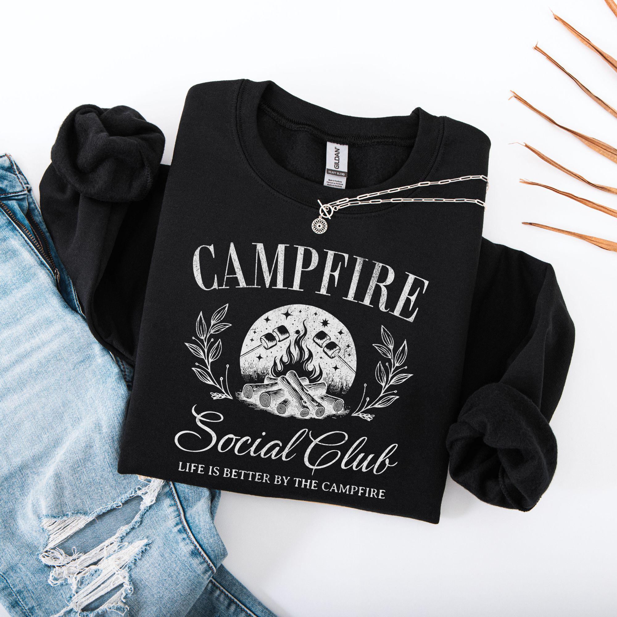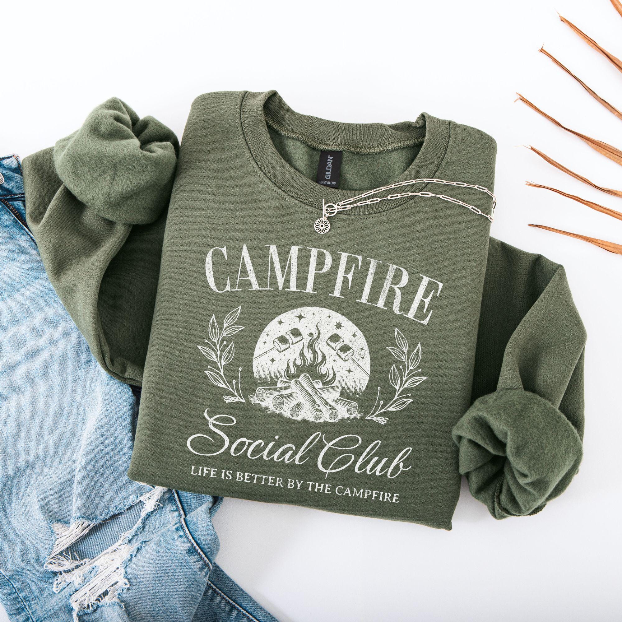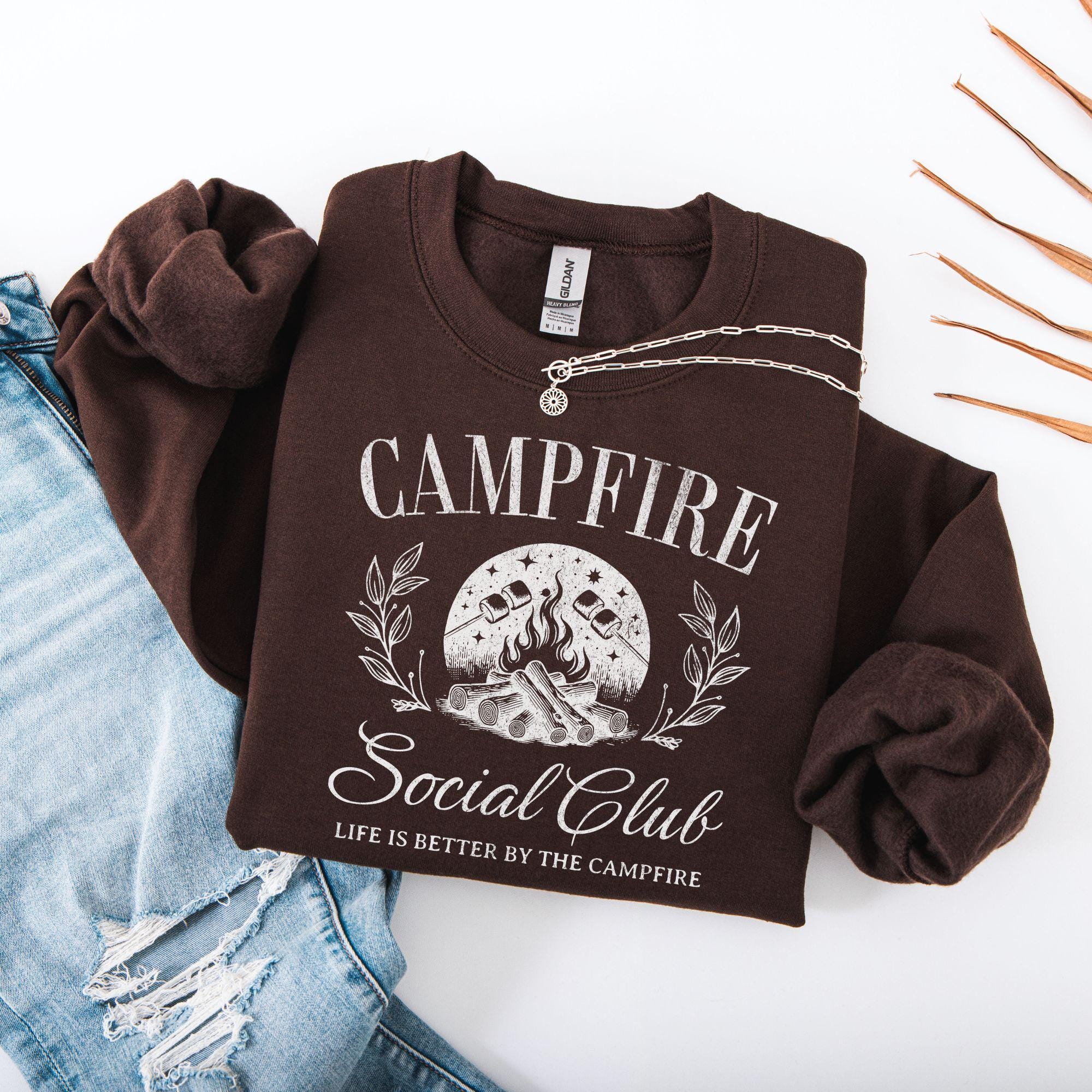 Warm nights, crackling fires, and good company — that’s what this Campfire Social Club sweatshirt is all about. Featuring a rustic campfire graphic with roasting marshmallows, leafy details, and the phrase “Life is better by the campfire,” this sweatshirt is perfect for anyone who loves the outdoors, camping trips, and cozy nights under the stars.