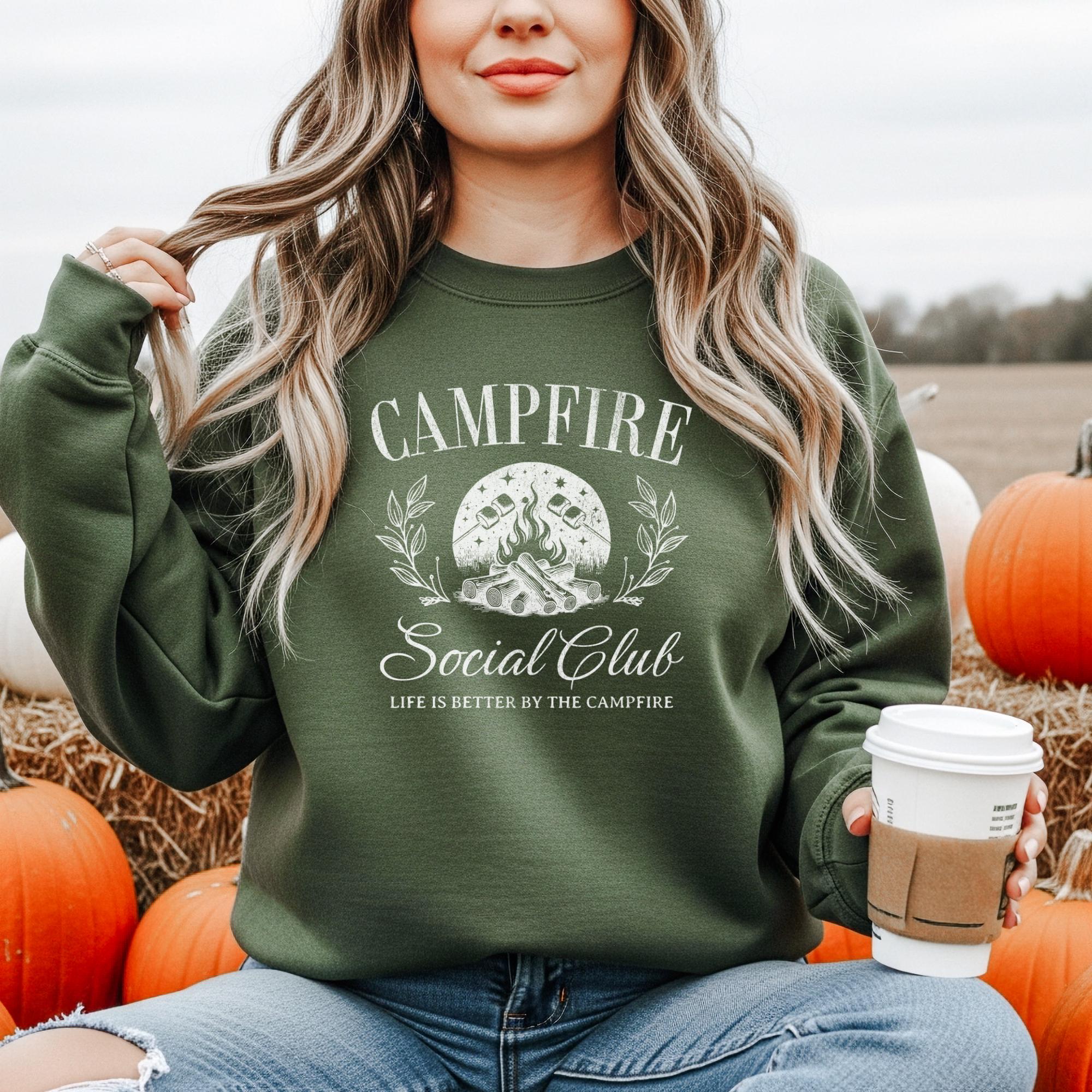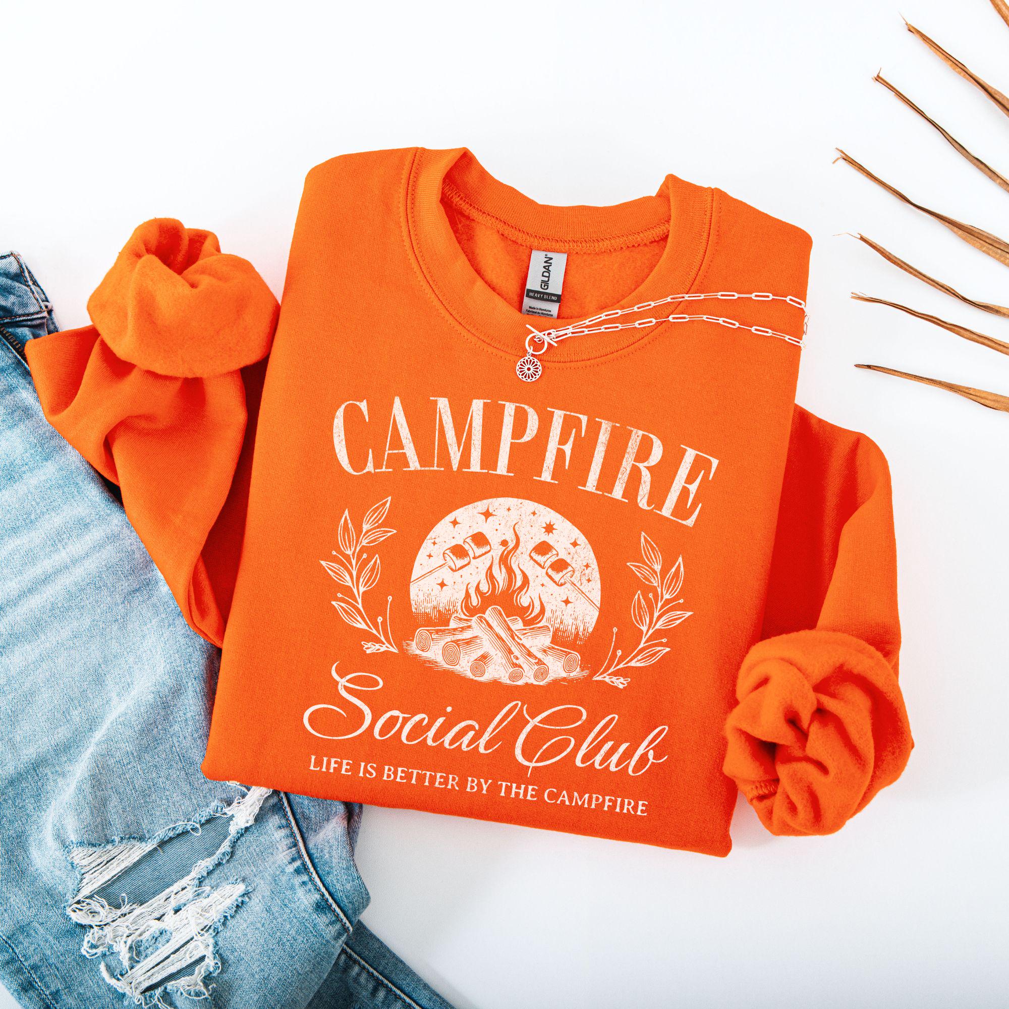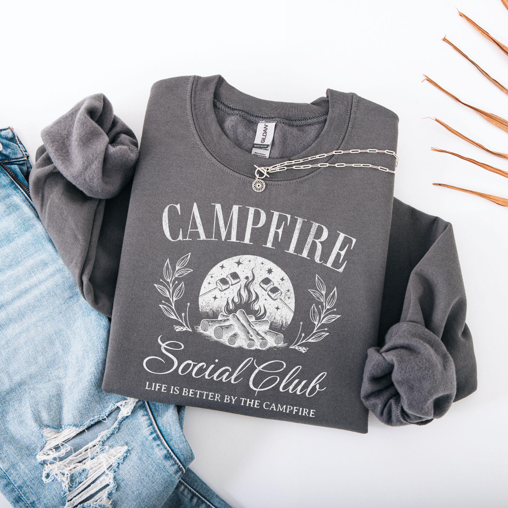 Warm nights, crackling fires, and good company — that’s what this Campfire Social Club sweatshirt is all about. Featuring a rustic campfire graphic with roasting marshmallows, leafy details, and the phrase “Life is better by the campfire,” this sweatshirt is perfect for anyone who loves the outdoors, camping trips, and cozy nights under the stars.
