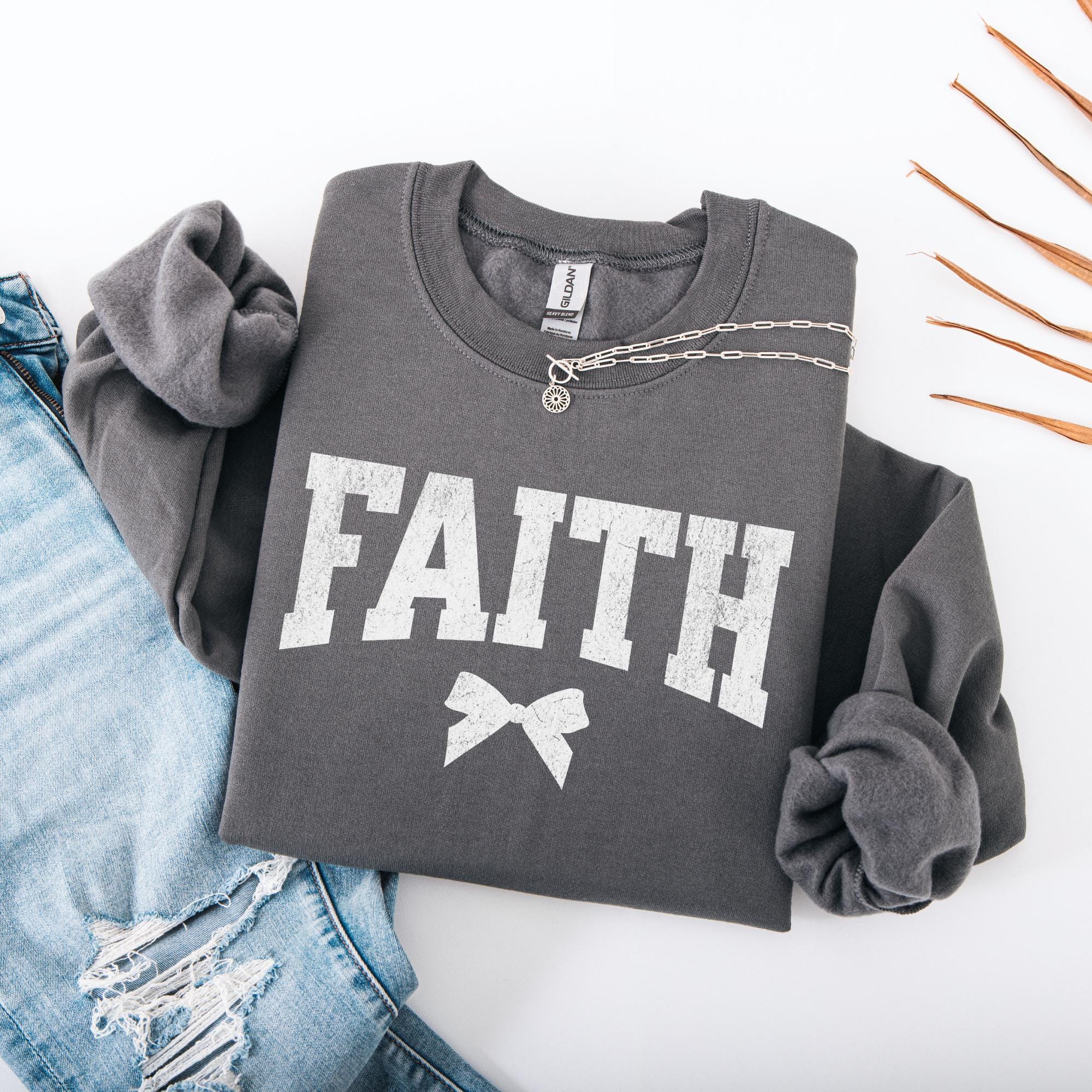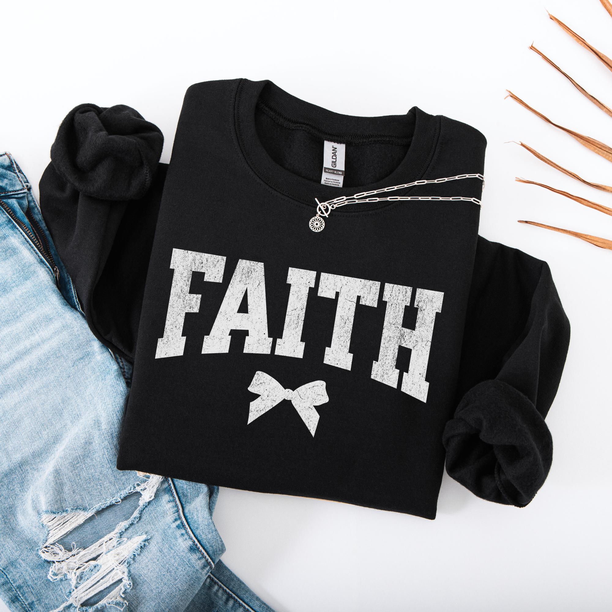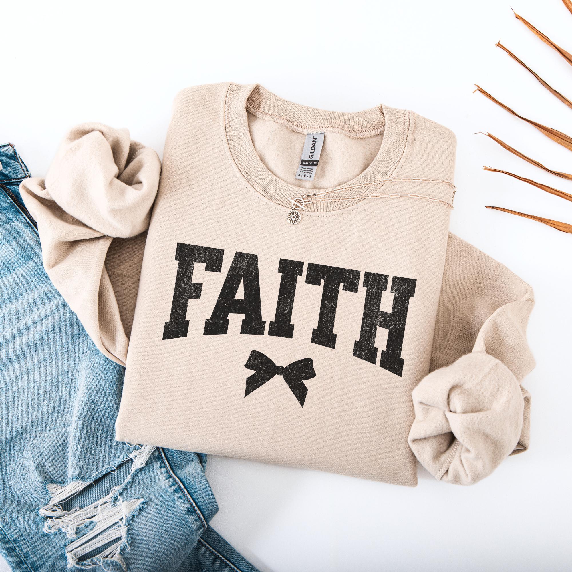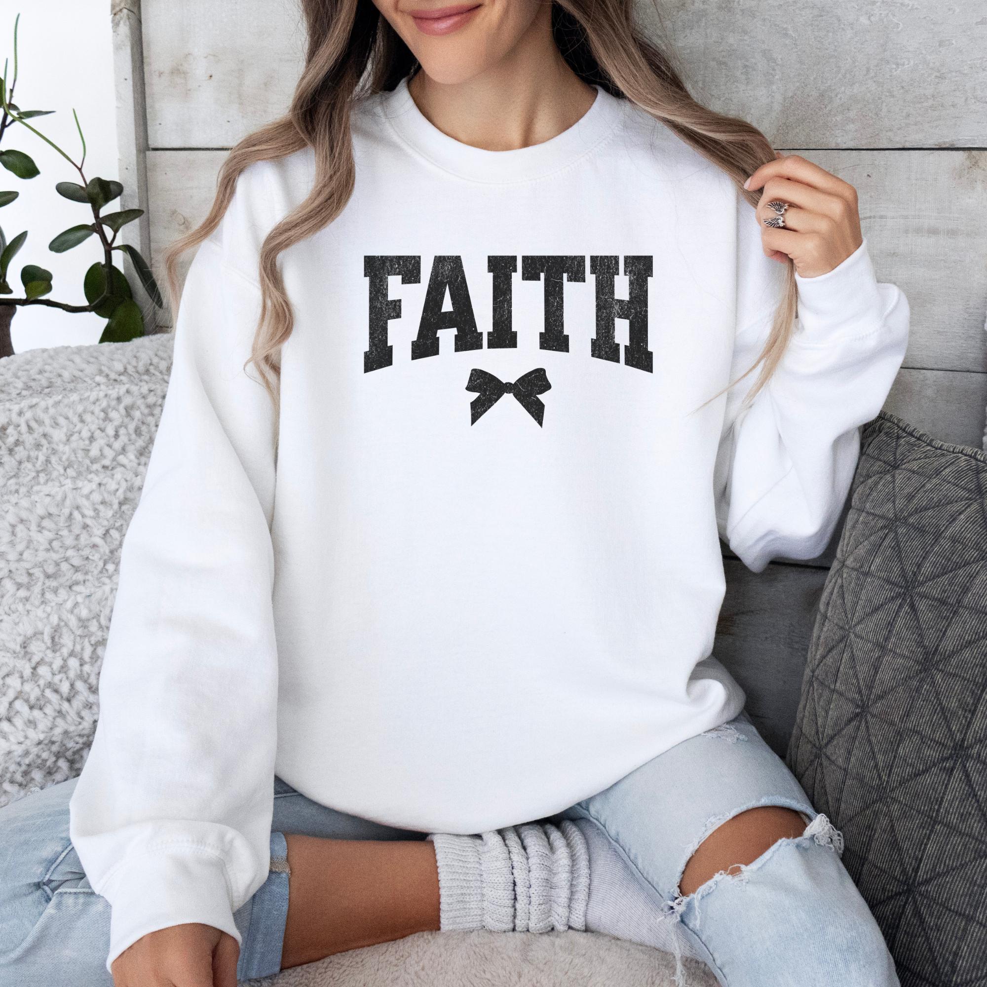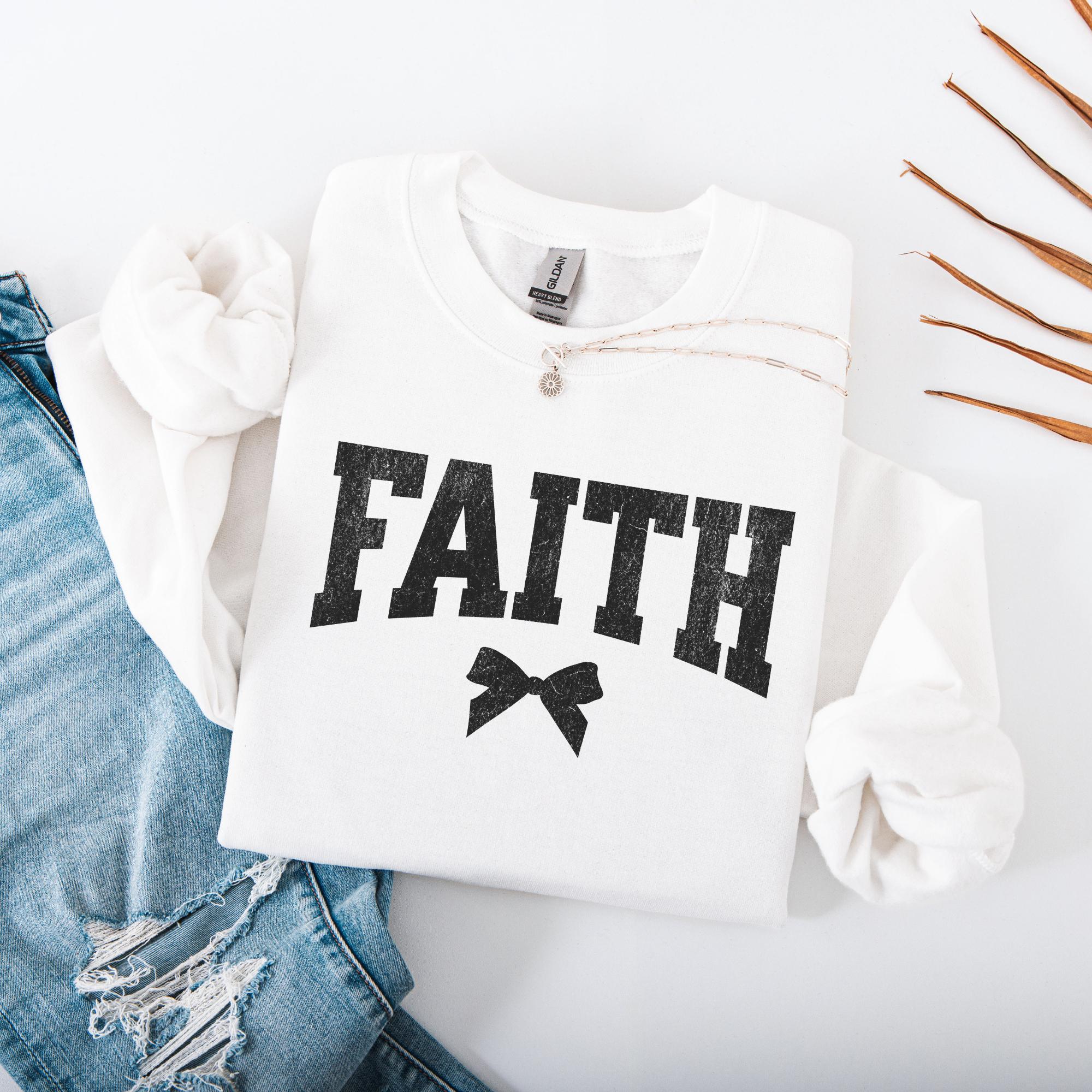 Wrap yourself in cozy comfort while keeping your faith close to your heart. This classic white sweatshirt features bold collegiate-style lettering with the word FAITH and a sweet bow accent underneath for a feminine touch. Perfect for casual days, church events, Bible study, or simply as a daily reminder of what grounds you most.