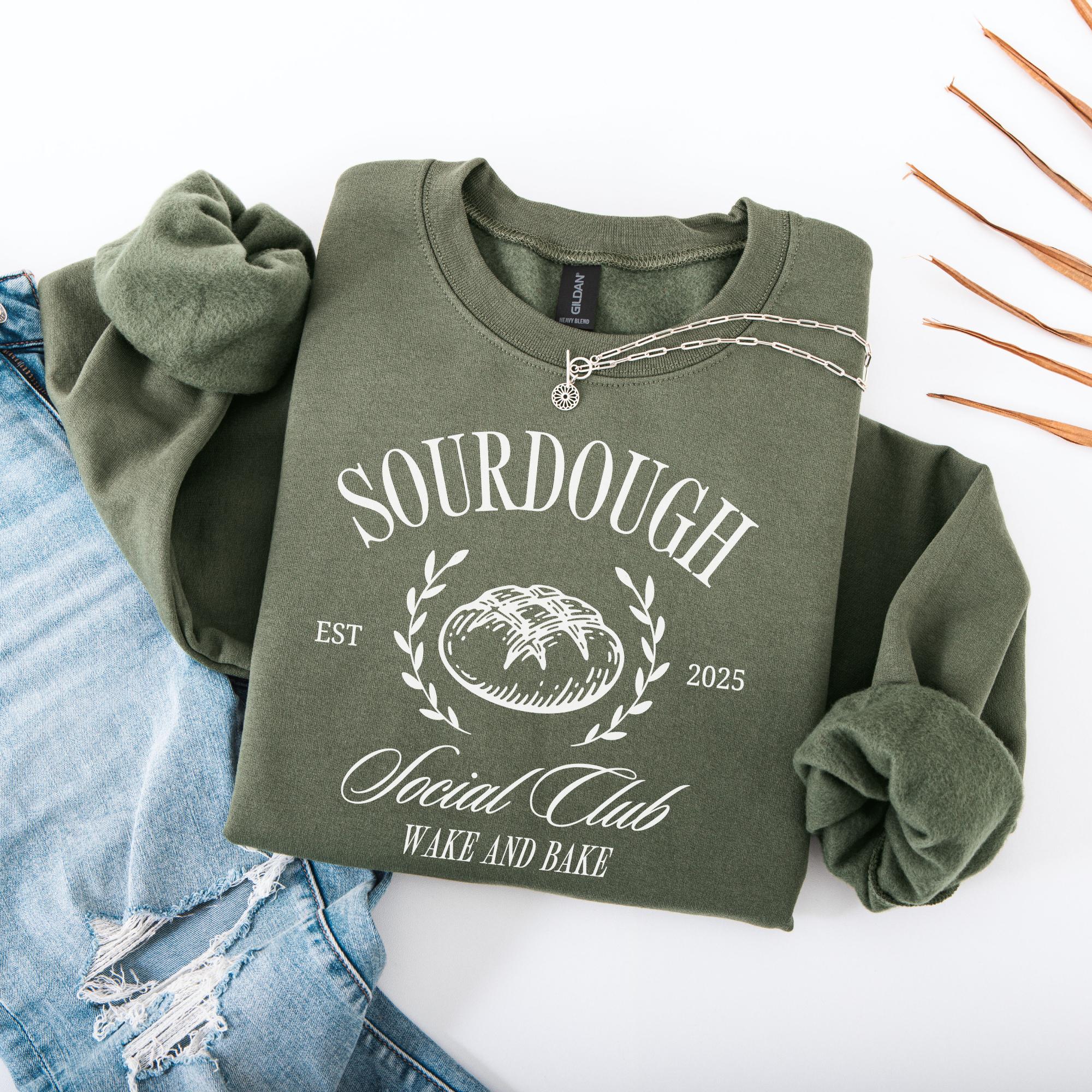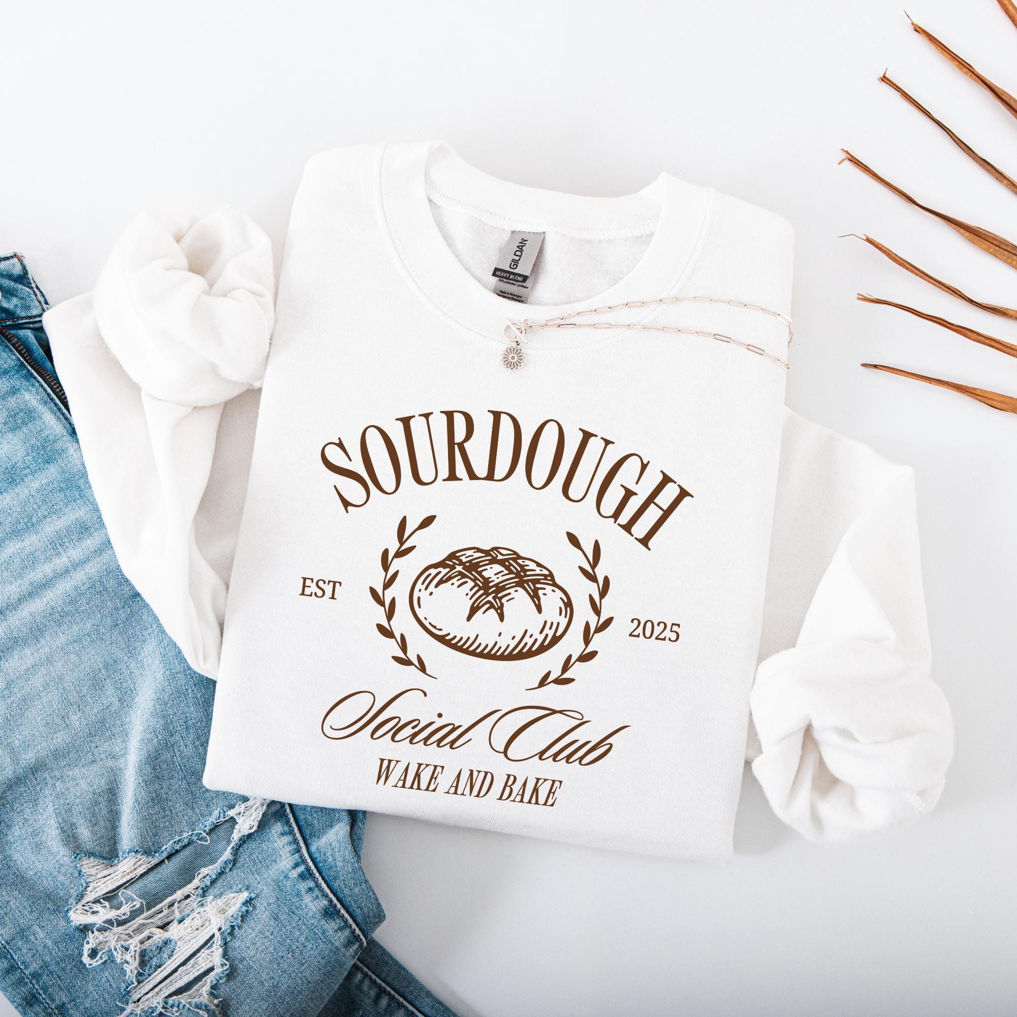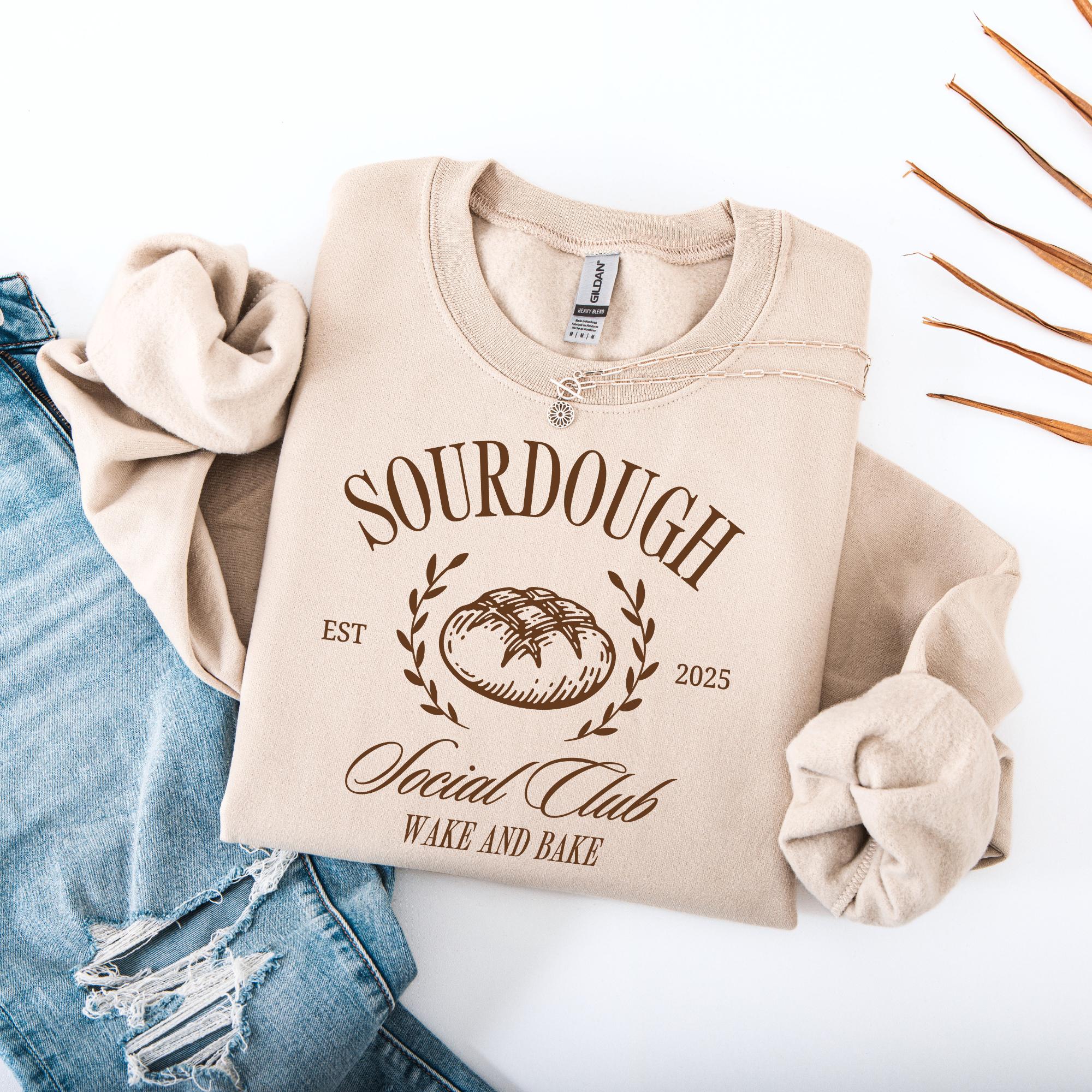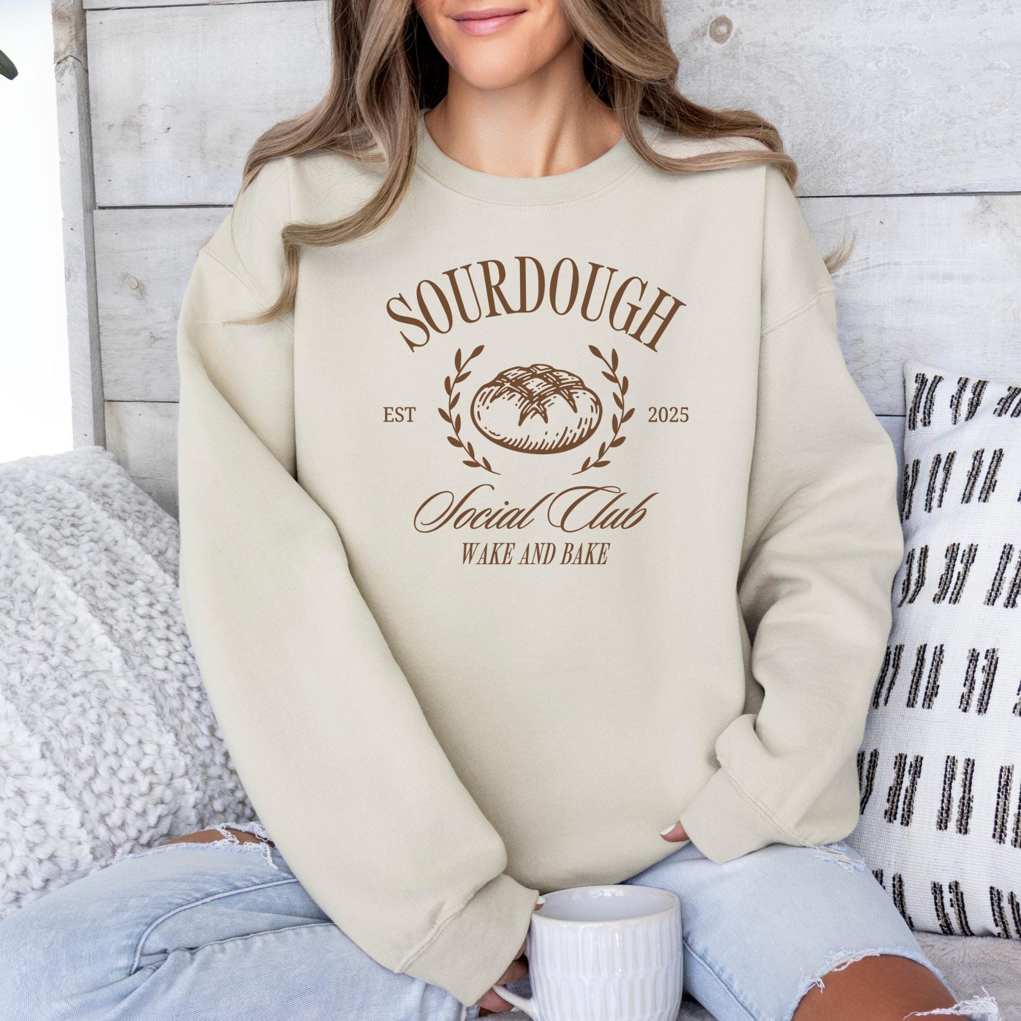 Join the club with our cozy “Sourdough Social Club – Wake and Bake” sweatshirt! Designed for bread lovers and home bakers alike, this sand-colored Gildan sweatshirt features a vintage-style sourdough loaf graphic, leafy wreath accents, and playful typography. It’s the perfect mix of comfort, humor, and foodie pride.