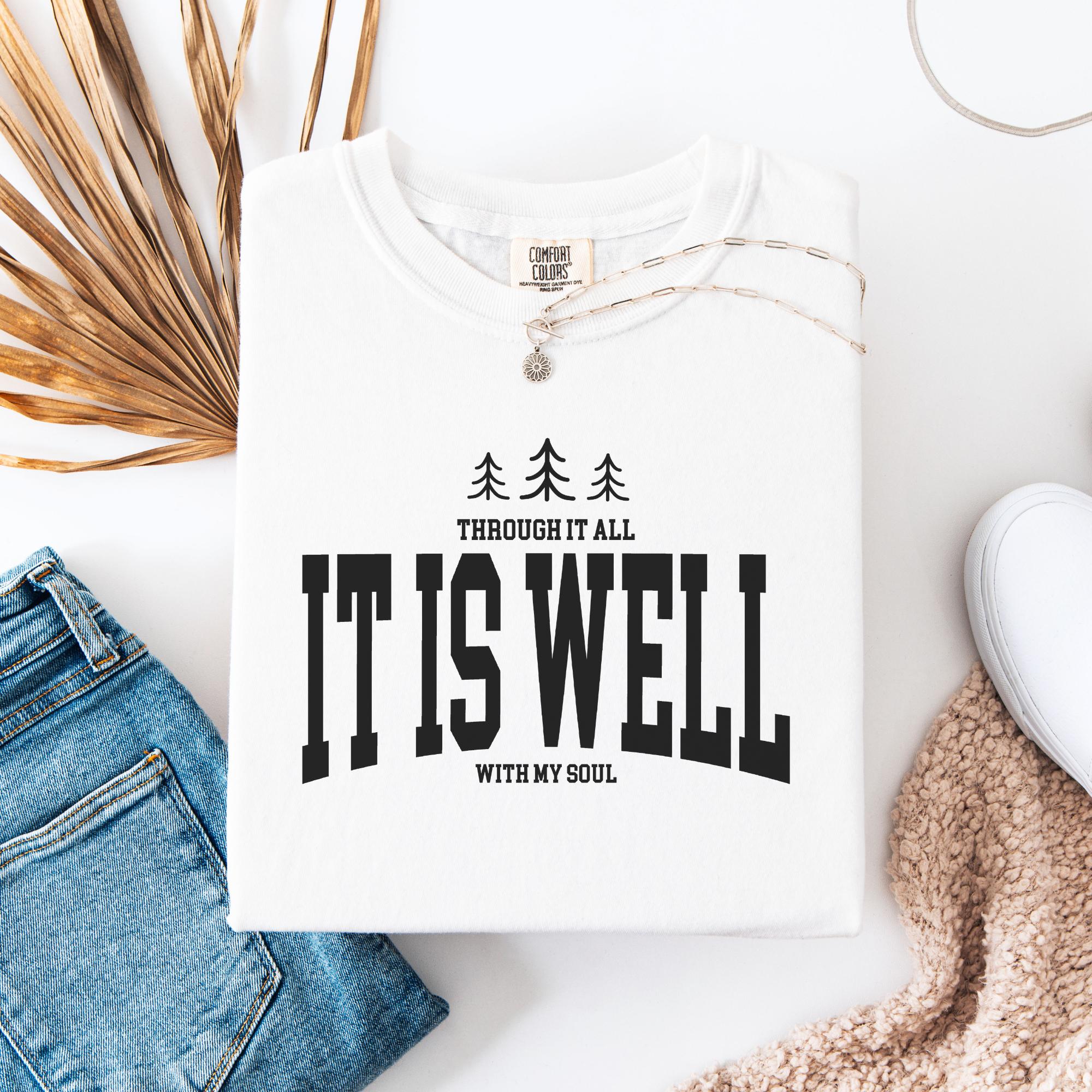 Carry peace and faith wherever you go with our “It Is Well With My Soul” shirt. Featuring bold collegiate lettering, simple tree accents, and the comforting hymn phrase, this timeless design is a perfect reminder of strength through it all. Available in a buttery-soft Comfort Colors tee or a cozy Gildan sweatshirt, it’s a versatile piece you’ll wear year-round.
