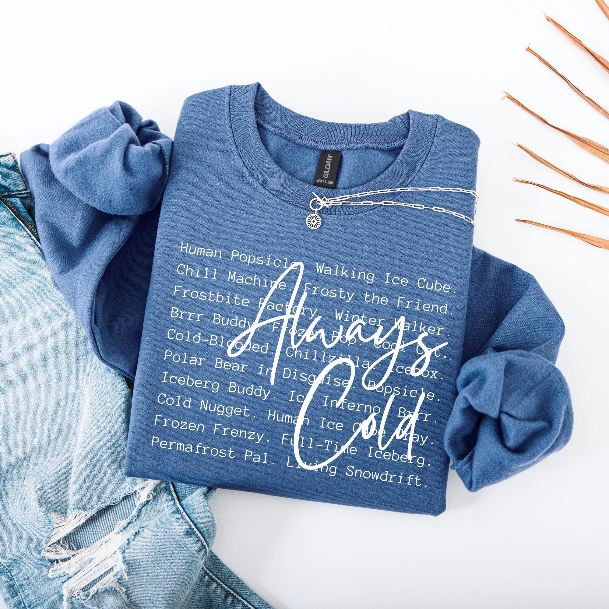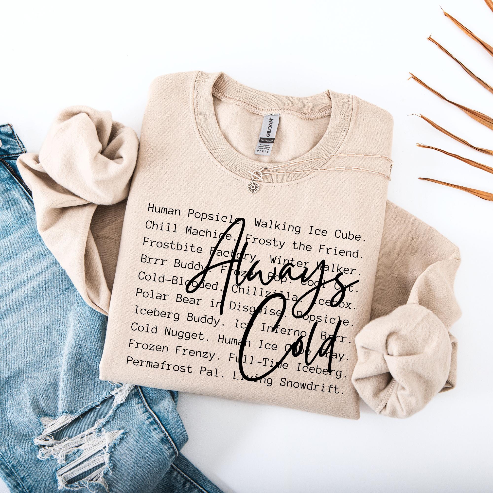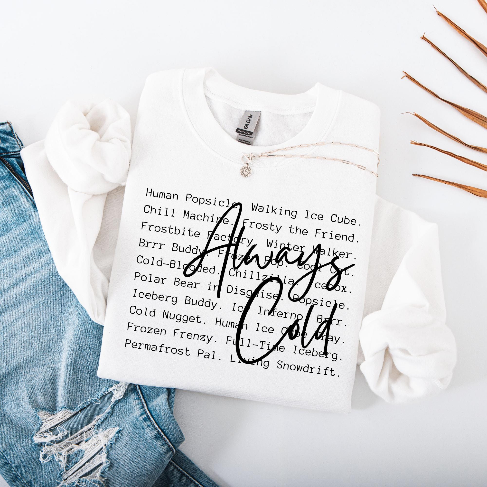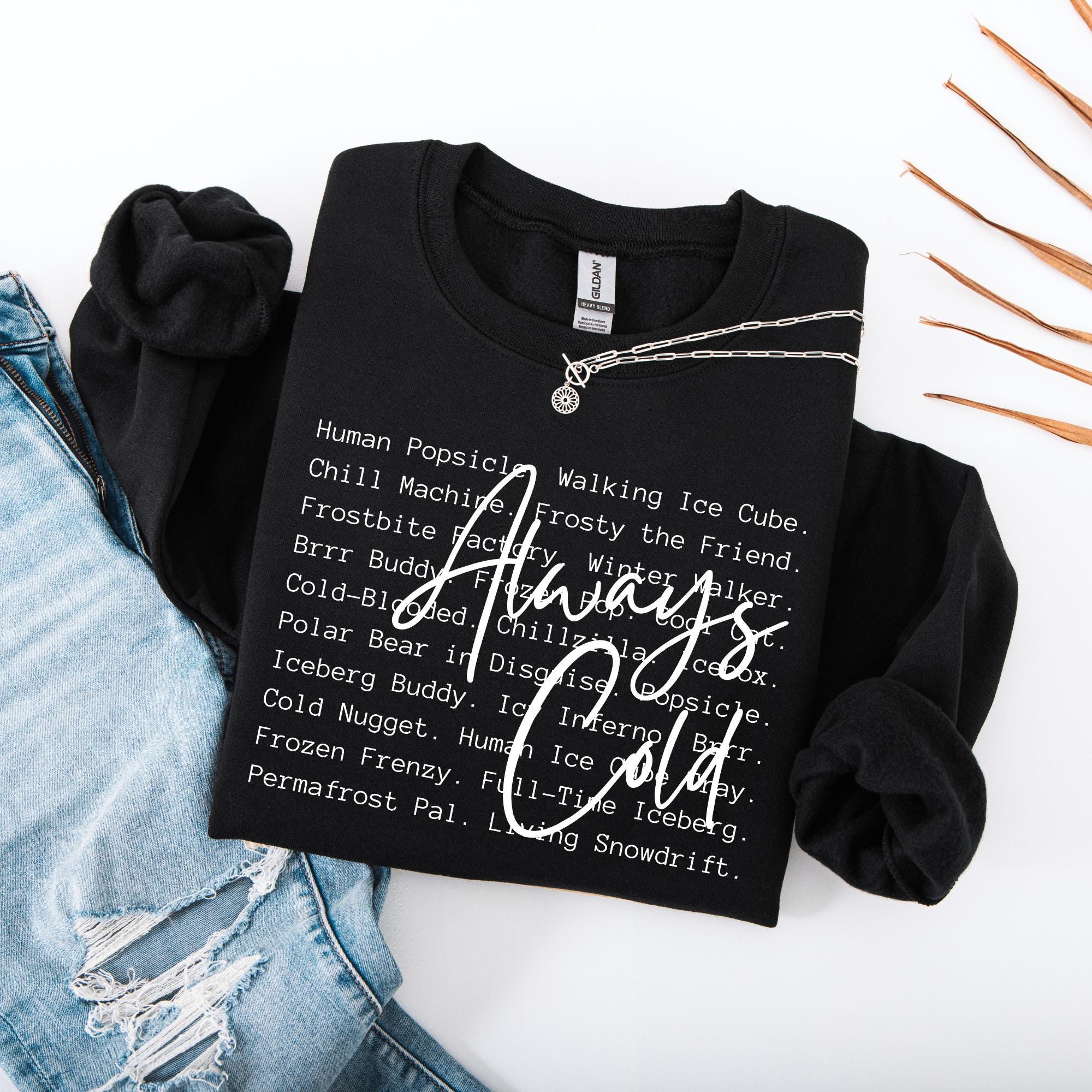 If you’re the one who always brings a blanket to movie night, keeps the thermostat at “tropical,” or constantly hears “how are you cold AGAIN?”—this sweatshirt was made for you. Featuring a playful block text of every chilly nickname (think Human Popsicle, Walking Ice Cube, Frostbite Fairy) layered with a bold handwritten Always Cold, this cozy crewneck is both funny and relatable.