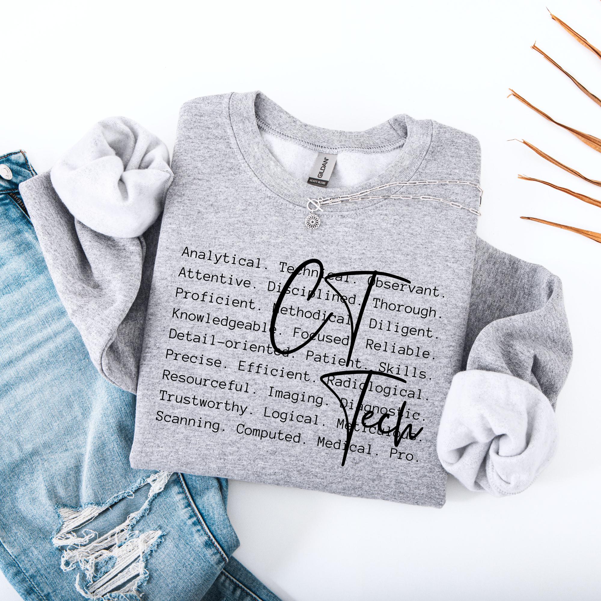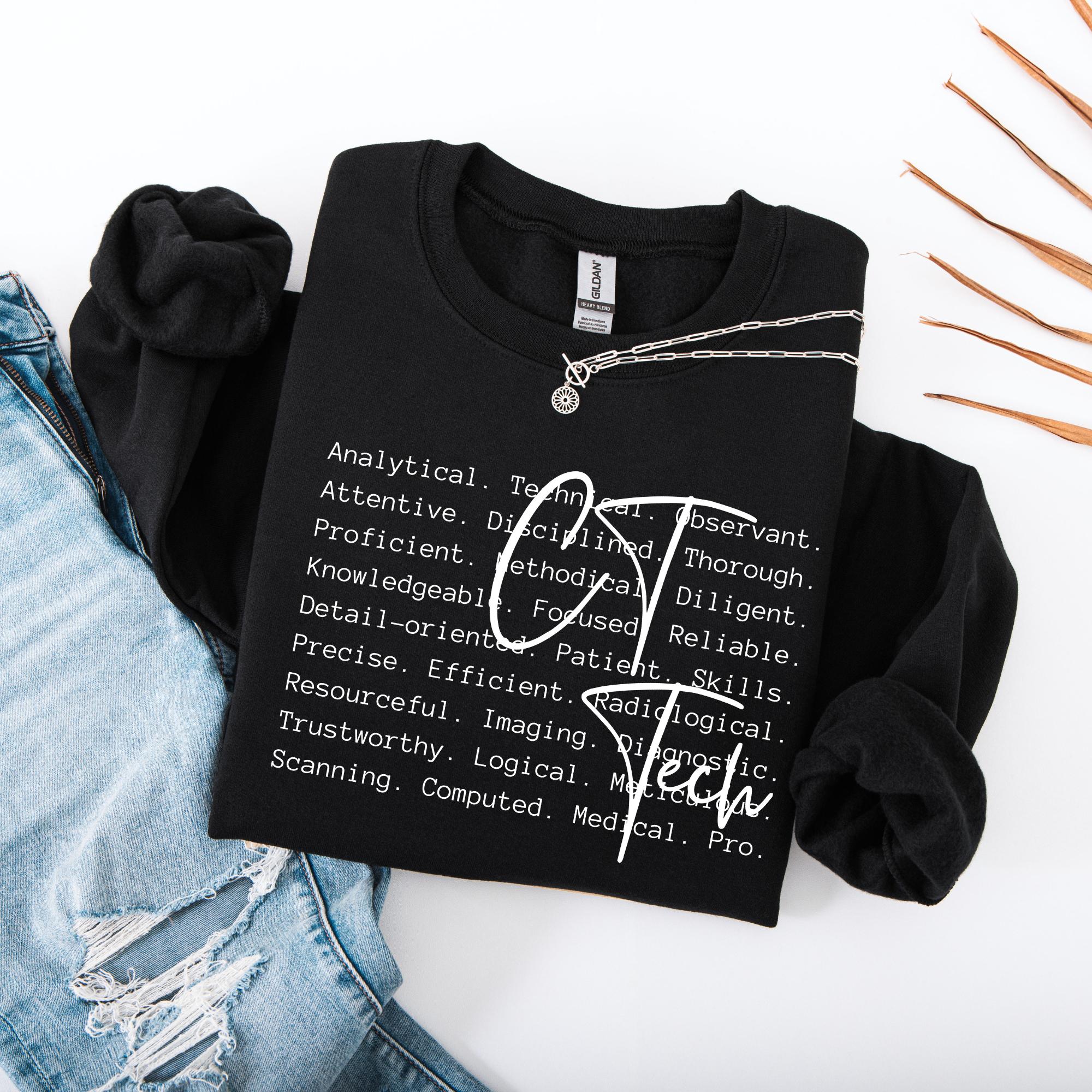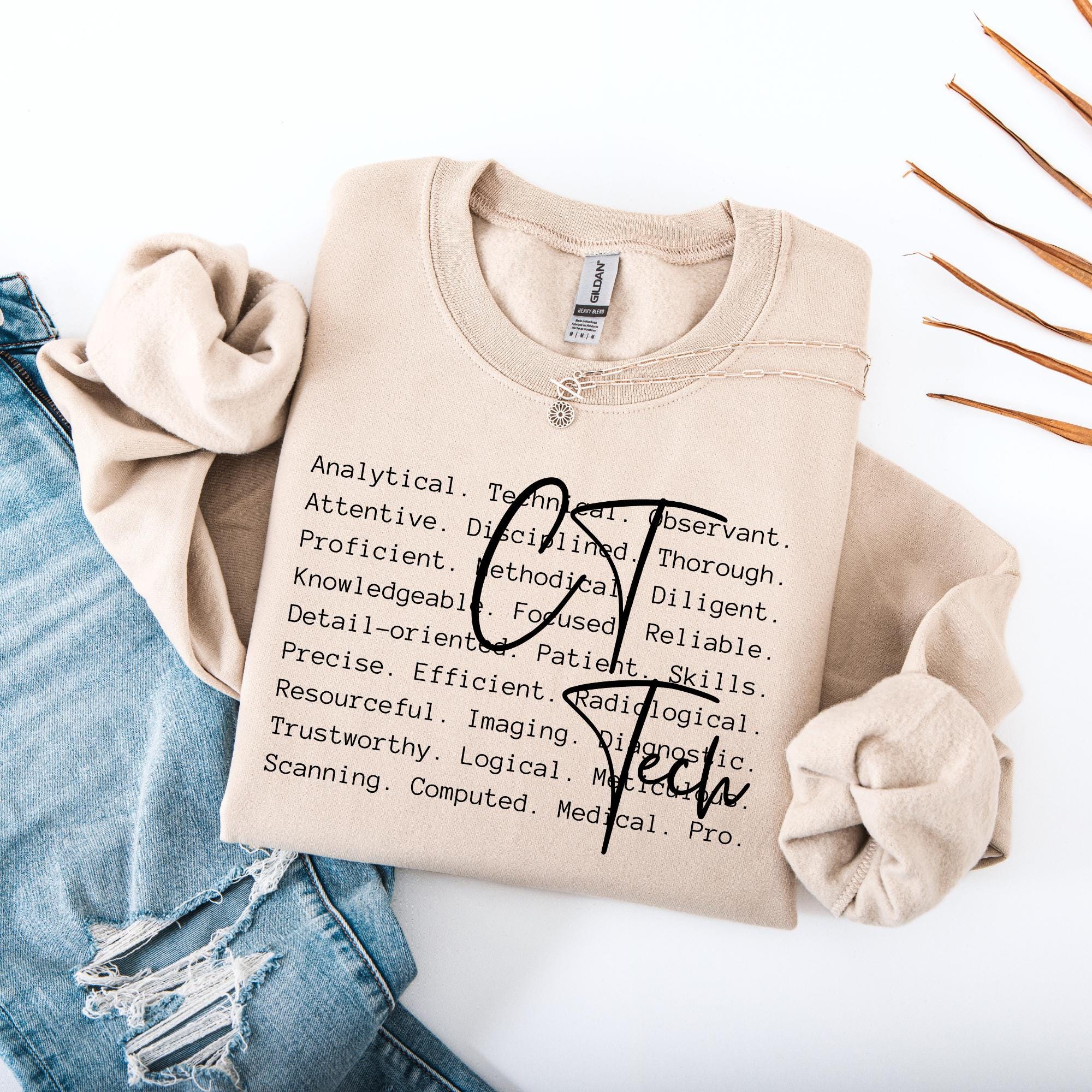 Show pride in your work as a CT Technologist with this cozy and meaningful sweatshirt. Featuring descriptive words like analytical, precise, resourceful, reliable, and more, overlaid with a bold handwritten CT Tech, this design perfectly honors the dedication and skill it takes to excel in the medical imaging field.