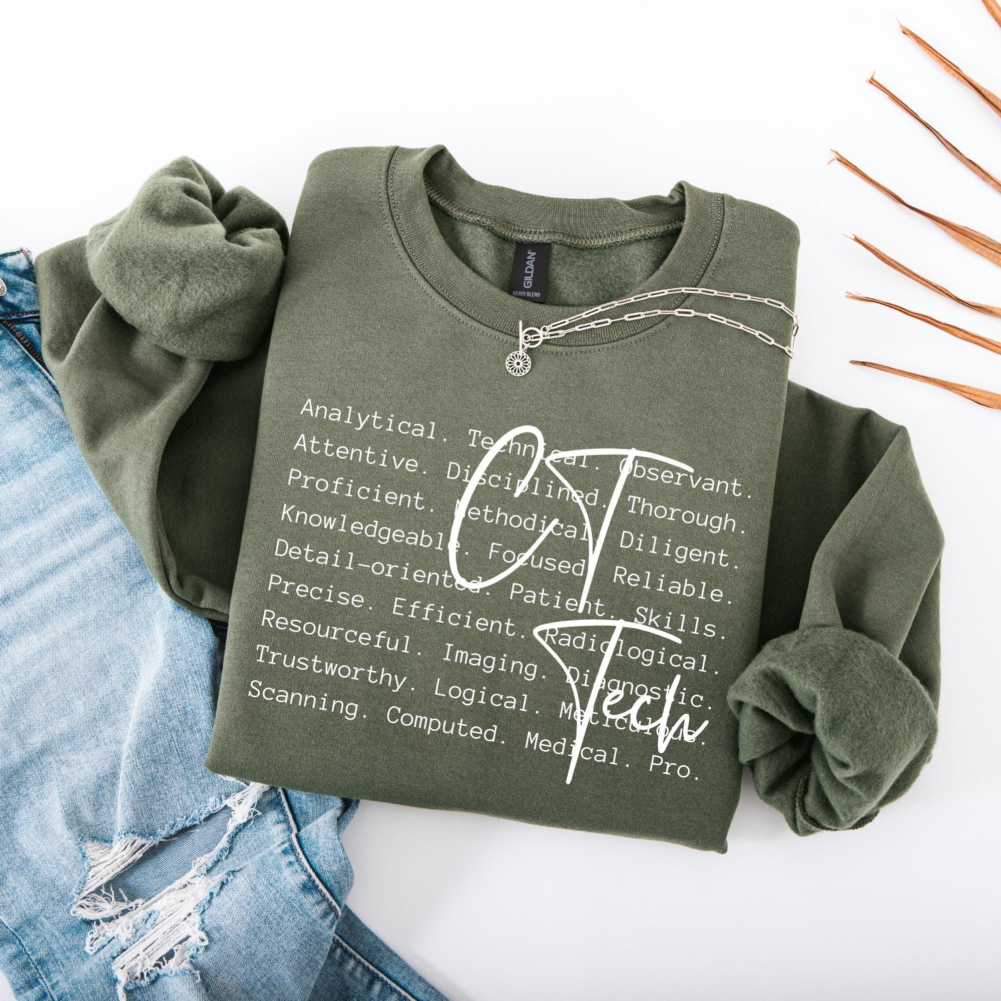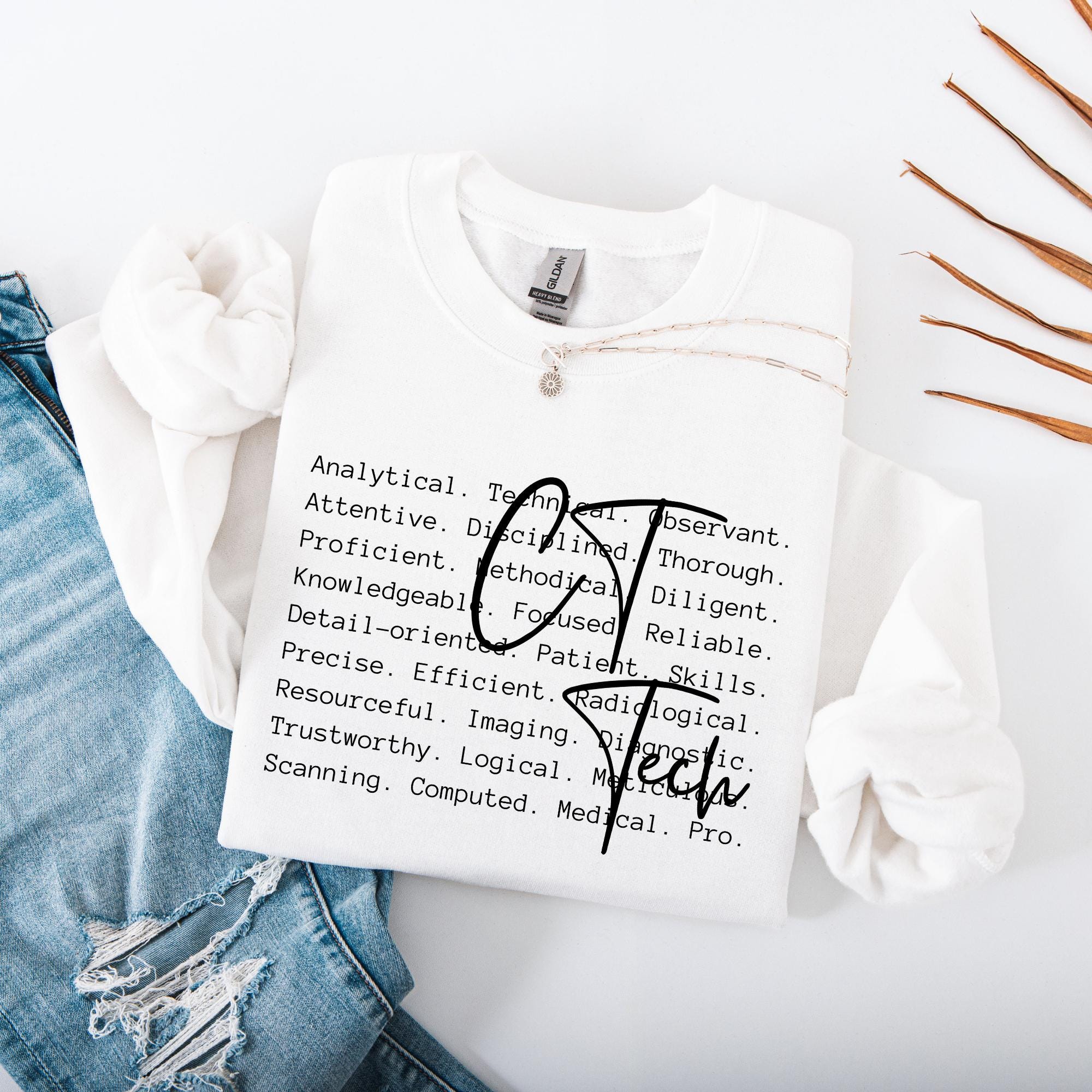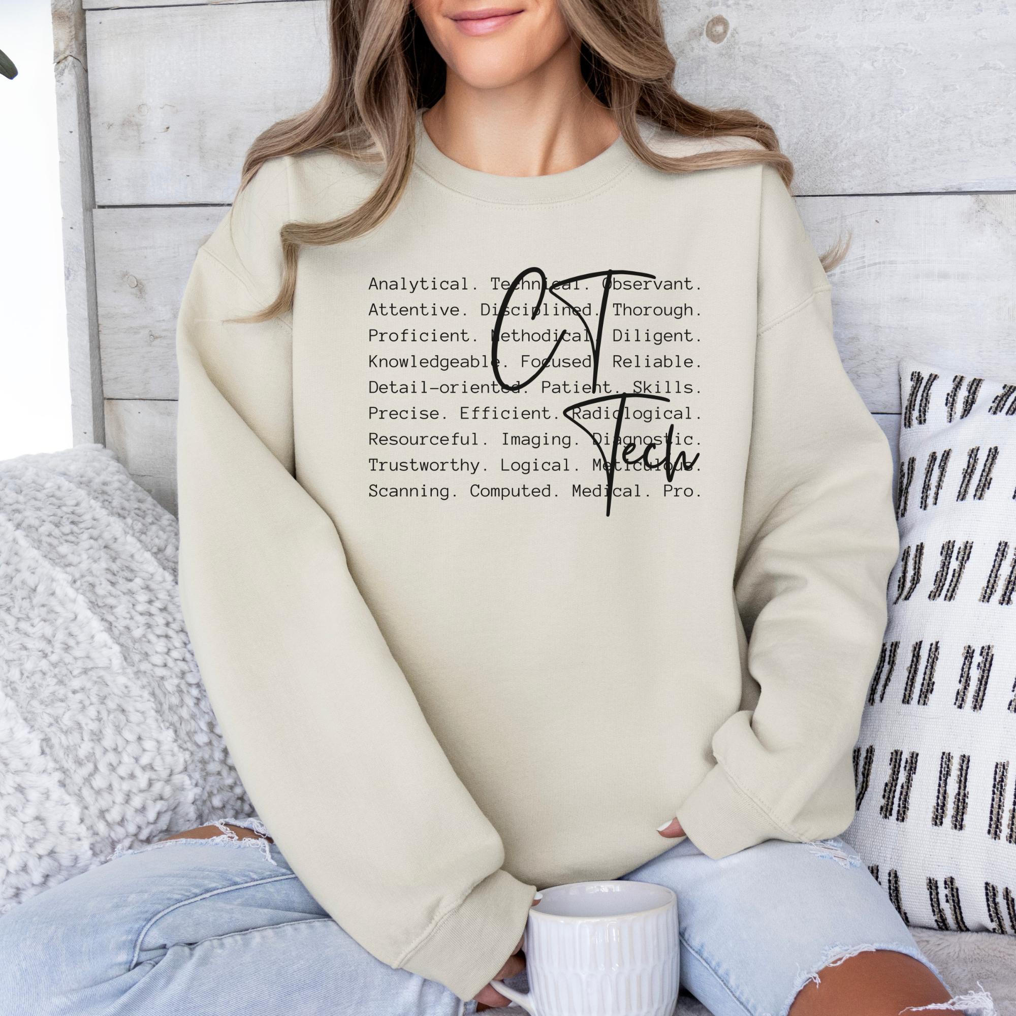 Show pride in your work as a CT Technologist with this cozy and meaningful sweatshirt. Featuring descriptive words like analytical, precise, resourceful, reliable, and more, overlaid with a bold handwritten CT Tech, this design perfectly honors the dedication and skill it takes to excel in the medical imaging field.