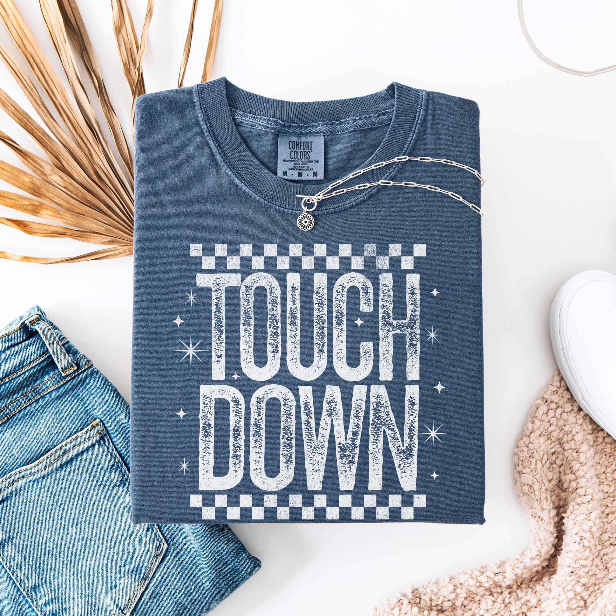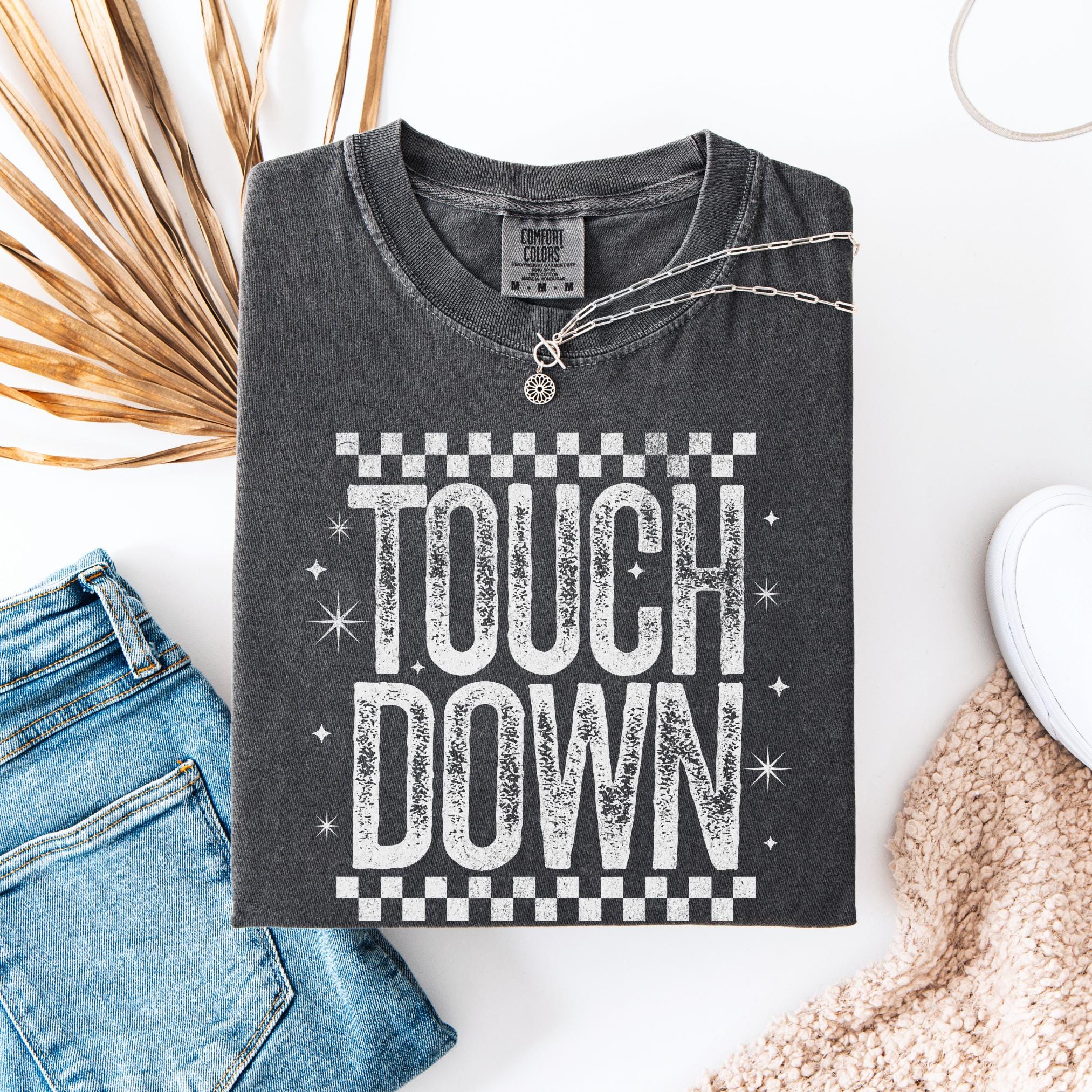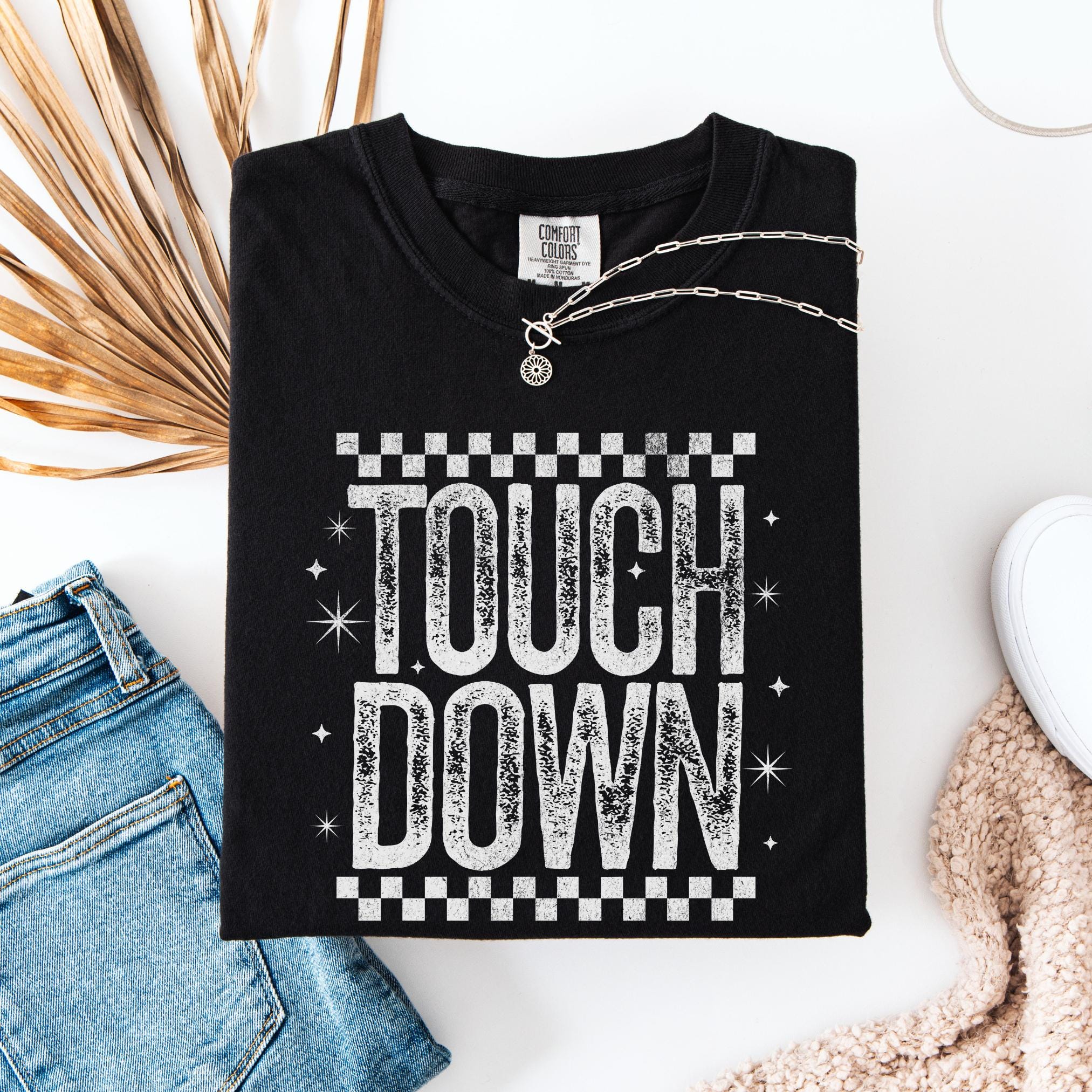 🏈 Score big style points with our Touchdown Comfort Colors® Tee – the perfect game-day shirt for football fans who love a bold, vintage vibe. Featuring a distressed black graphic with checkered accents and retro starbursts, this shirt brings the ultimate sporty aesthetic whether you’re cheering in the stadium, hosting a tailgate, or just repping your team spirit all season long.