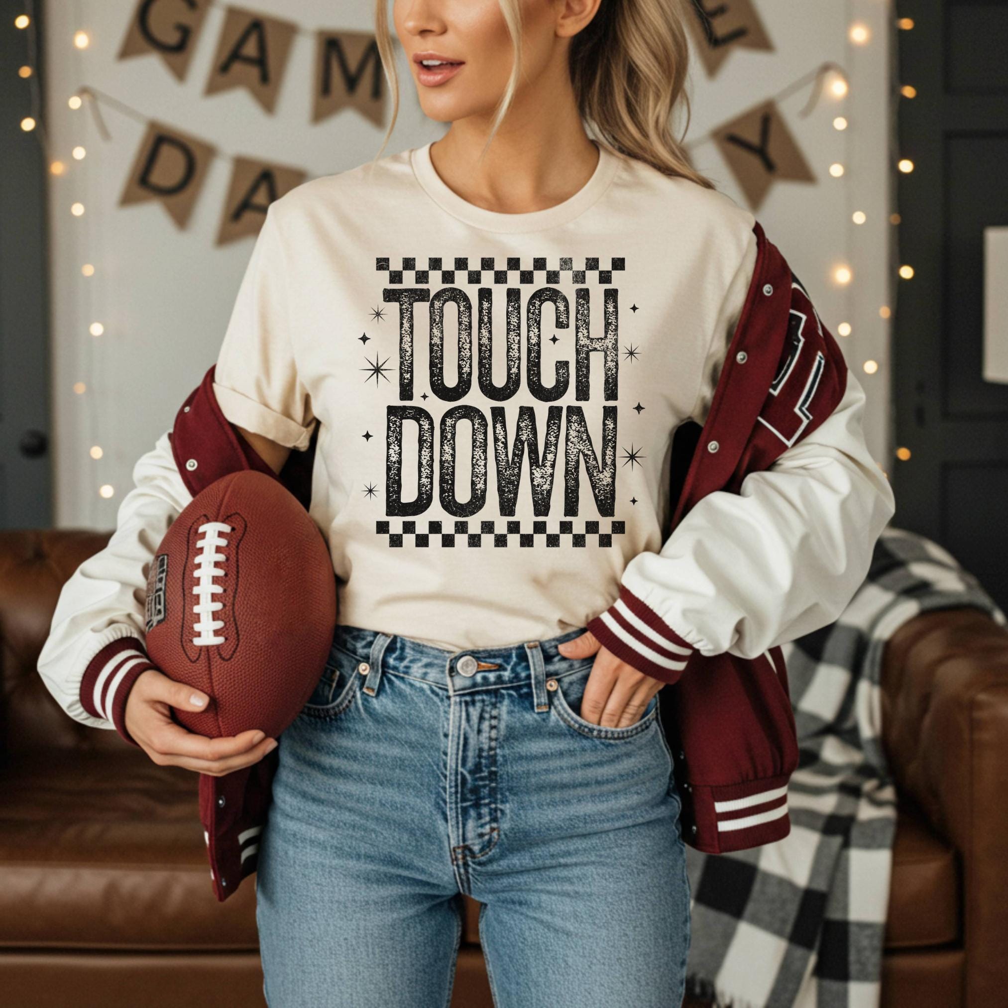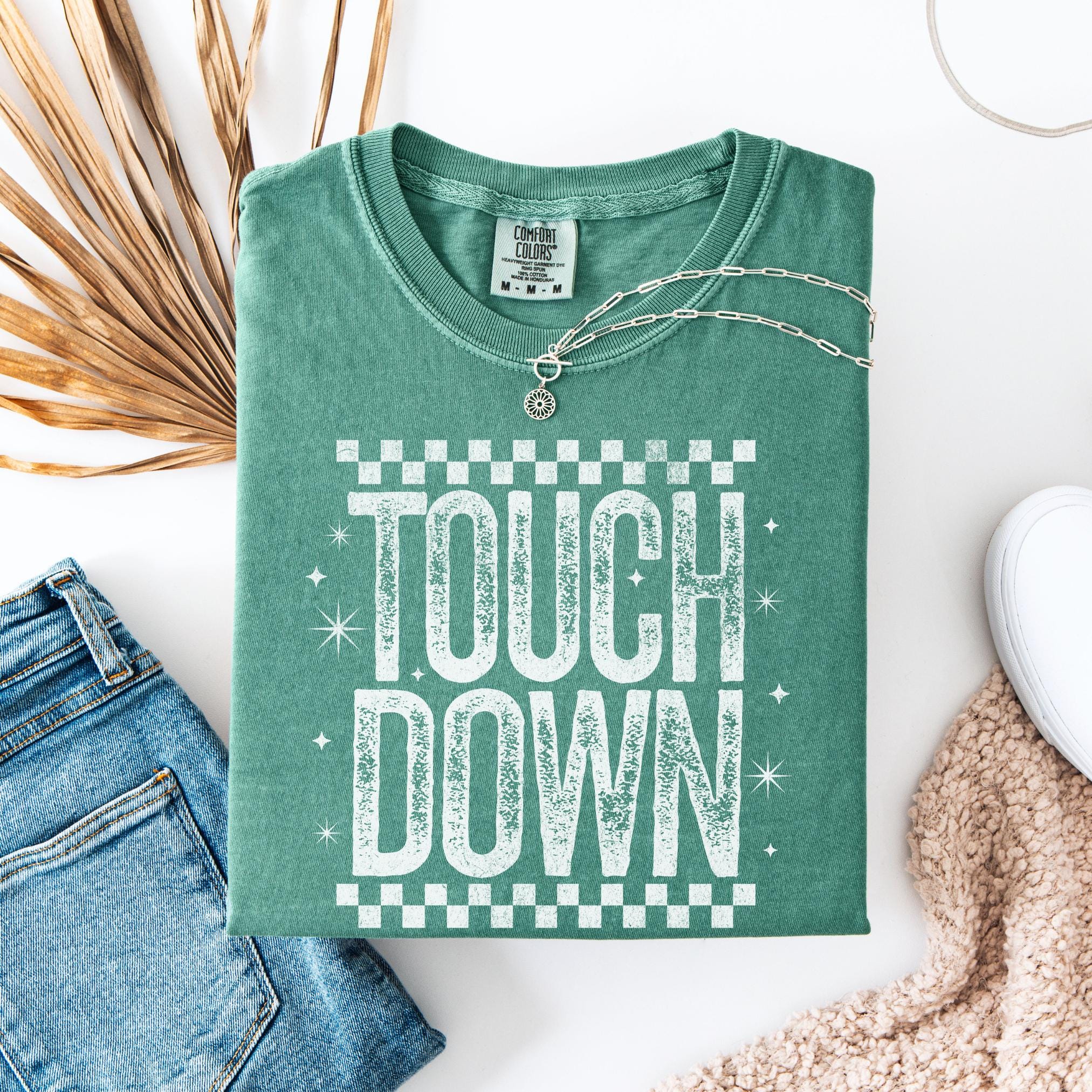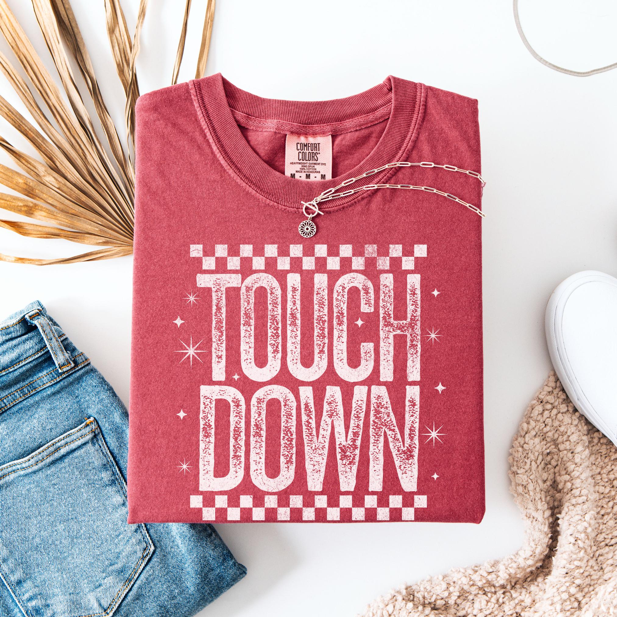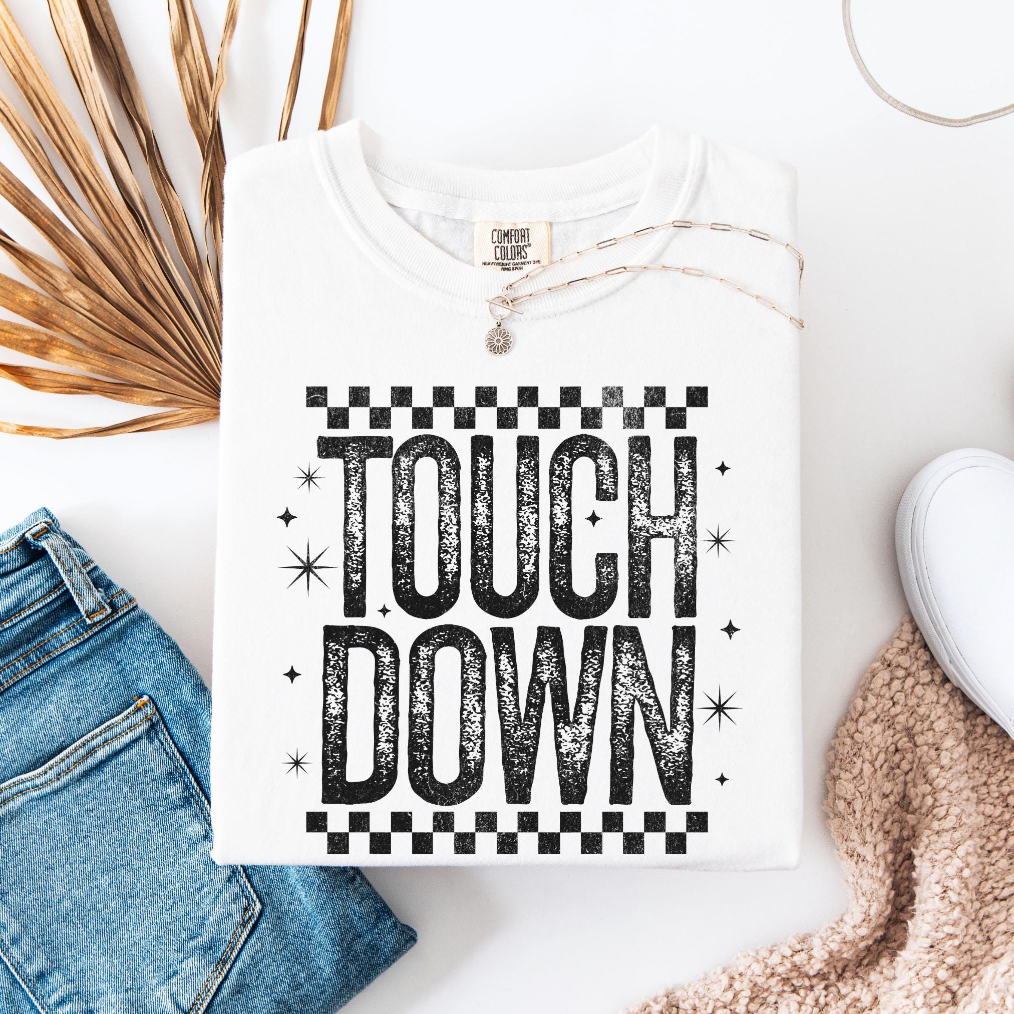 🏈 Score big style points with our Touchdown Comfort Colors® Tee – the perfect game-day shirt for football fans who love a bold, vintage vibe. Featuring a distressed black graphic with checkered accents and retro starbursts, this shirt brings the ultimate sporty aesthetic whether you’re cheering in the stadium, hosting a tailgate, or just repping your team spirit all season long.