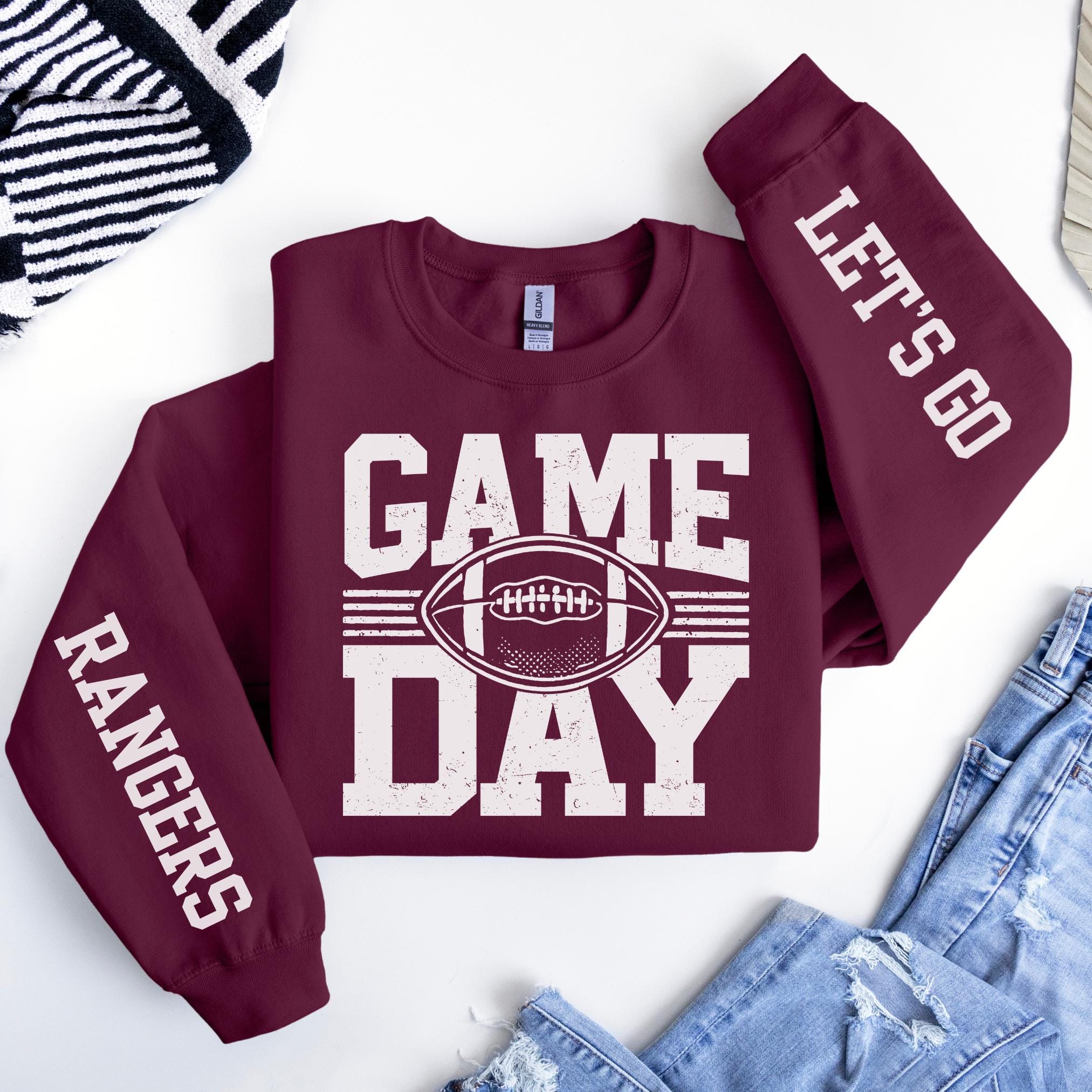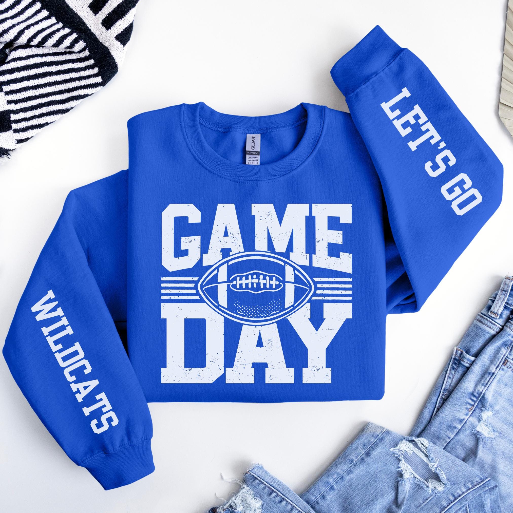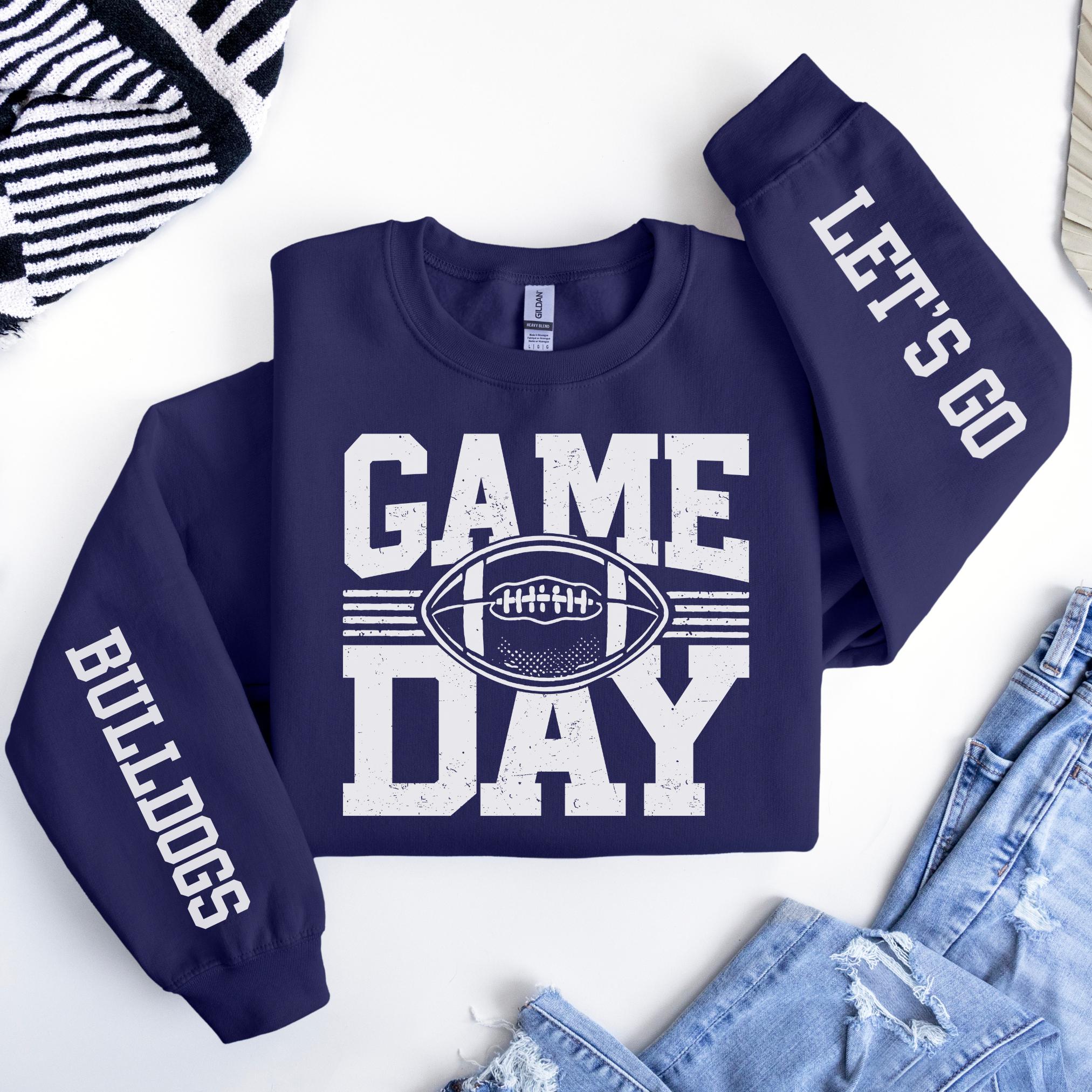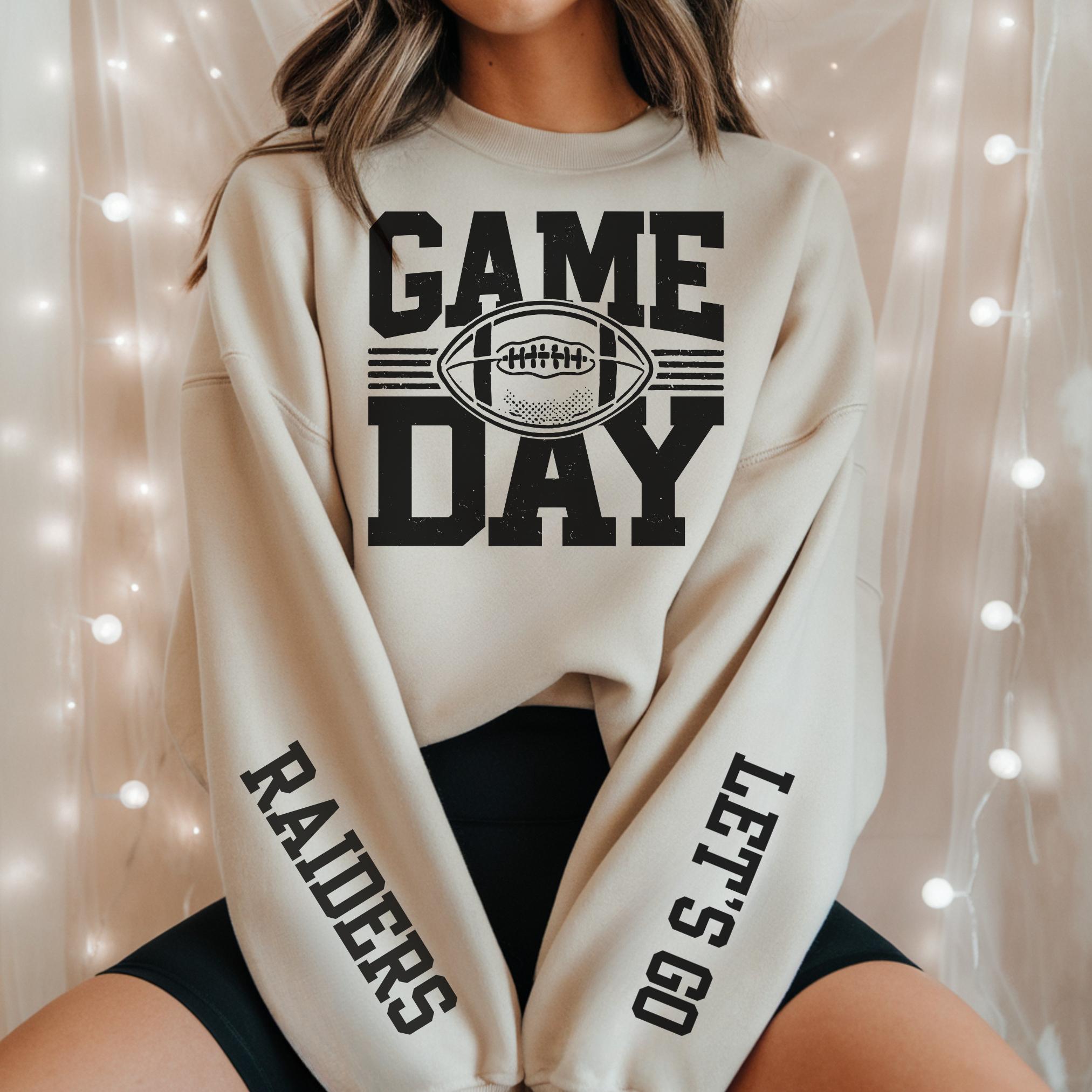 Cheer on your favorite team in style with our Custom Game Day Sweatshirt! Perfect for football season, this cozy unisex crewneck features bold Game Day lettering on the front with a football graphic, plus the option to personalize the sleeves with your team name, mascot, or chant.