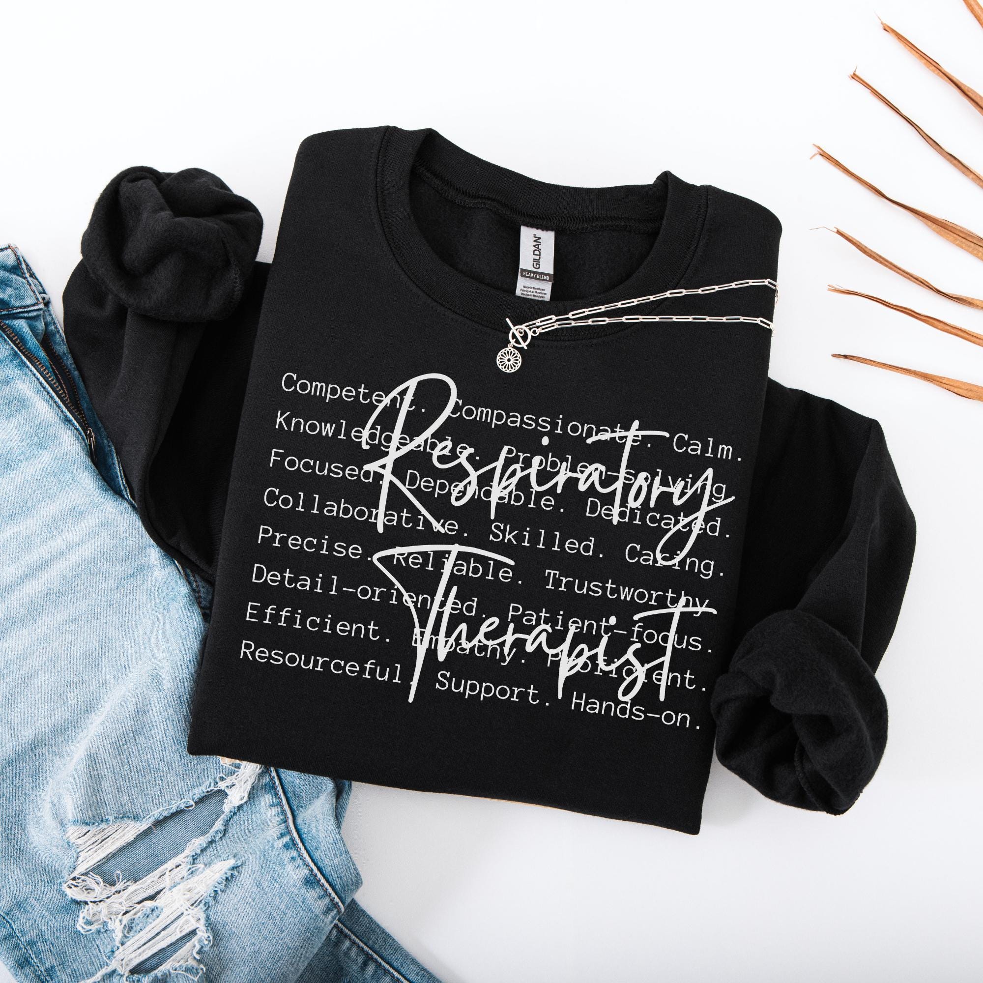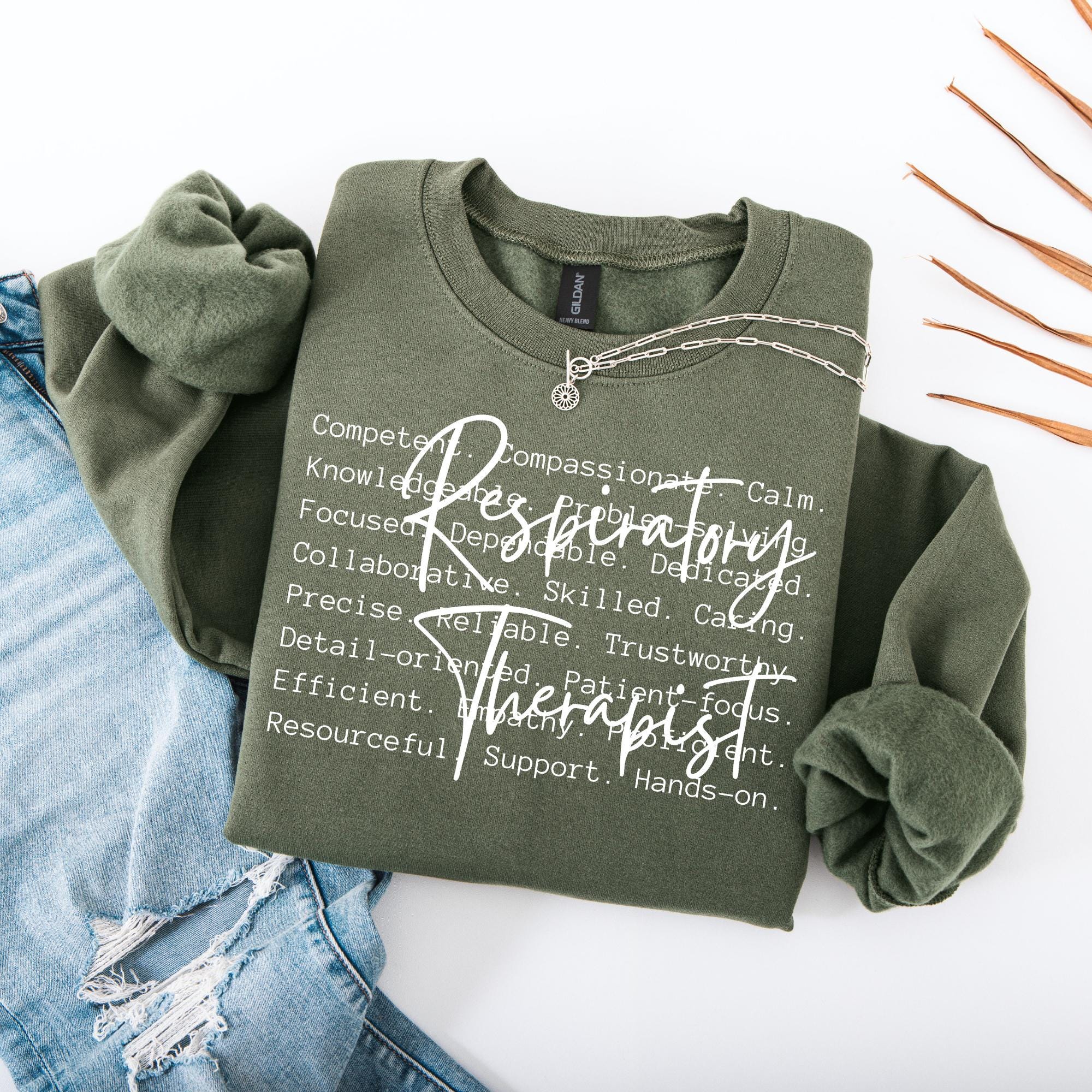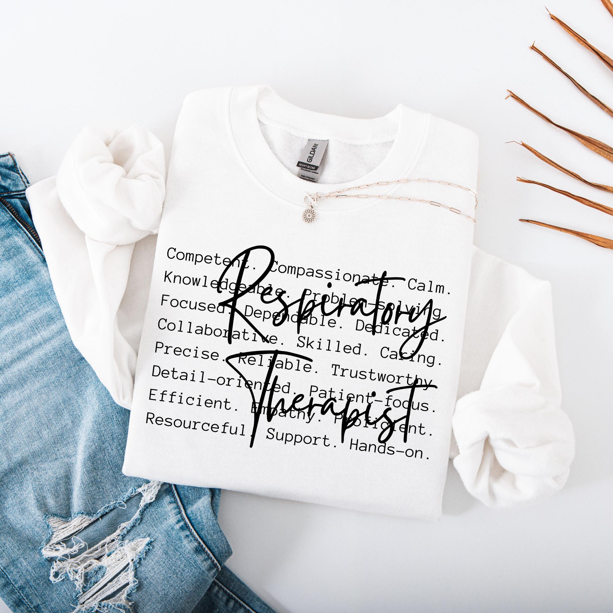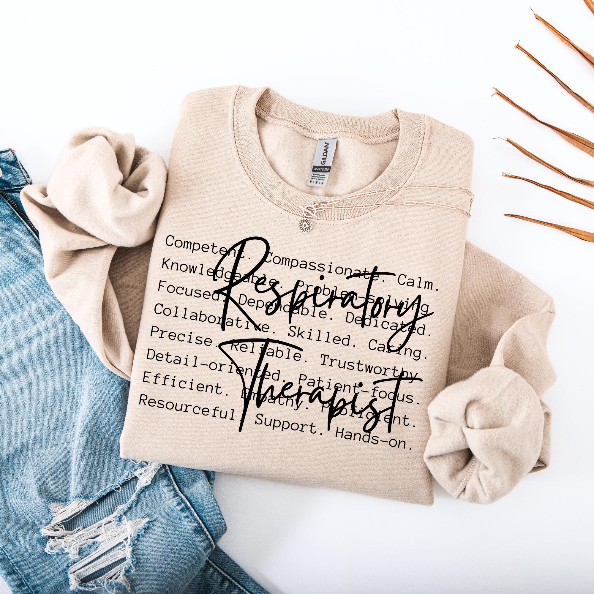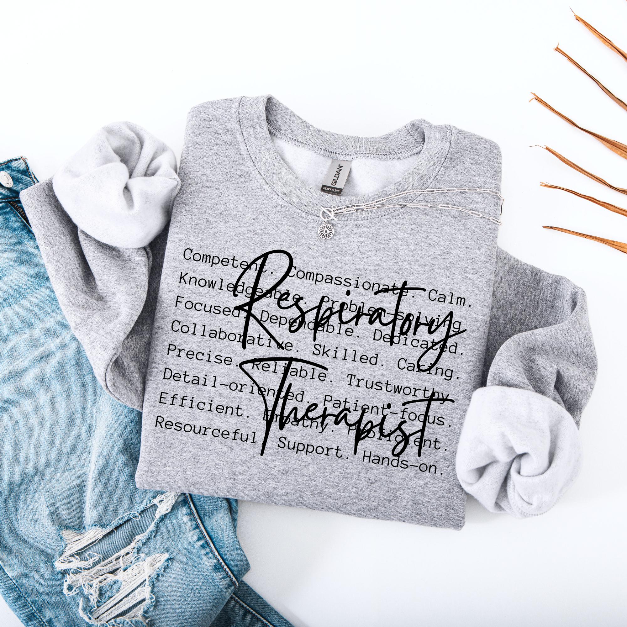 Celebrate the heart and dedication of respiratory therapists with this cozy and meaningful sweatshirt. Designed with inspiring words that describe the incredible qualities of RTs—Compassionate, Skilled, Dedicated, Patient-focused, and more—this crewneck proudly highlights the profession with the bold overlay text “Respiratory Therapist.”