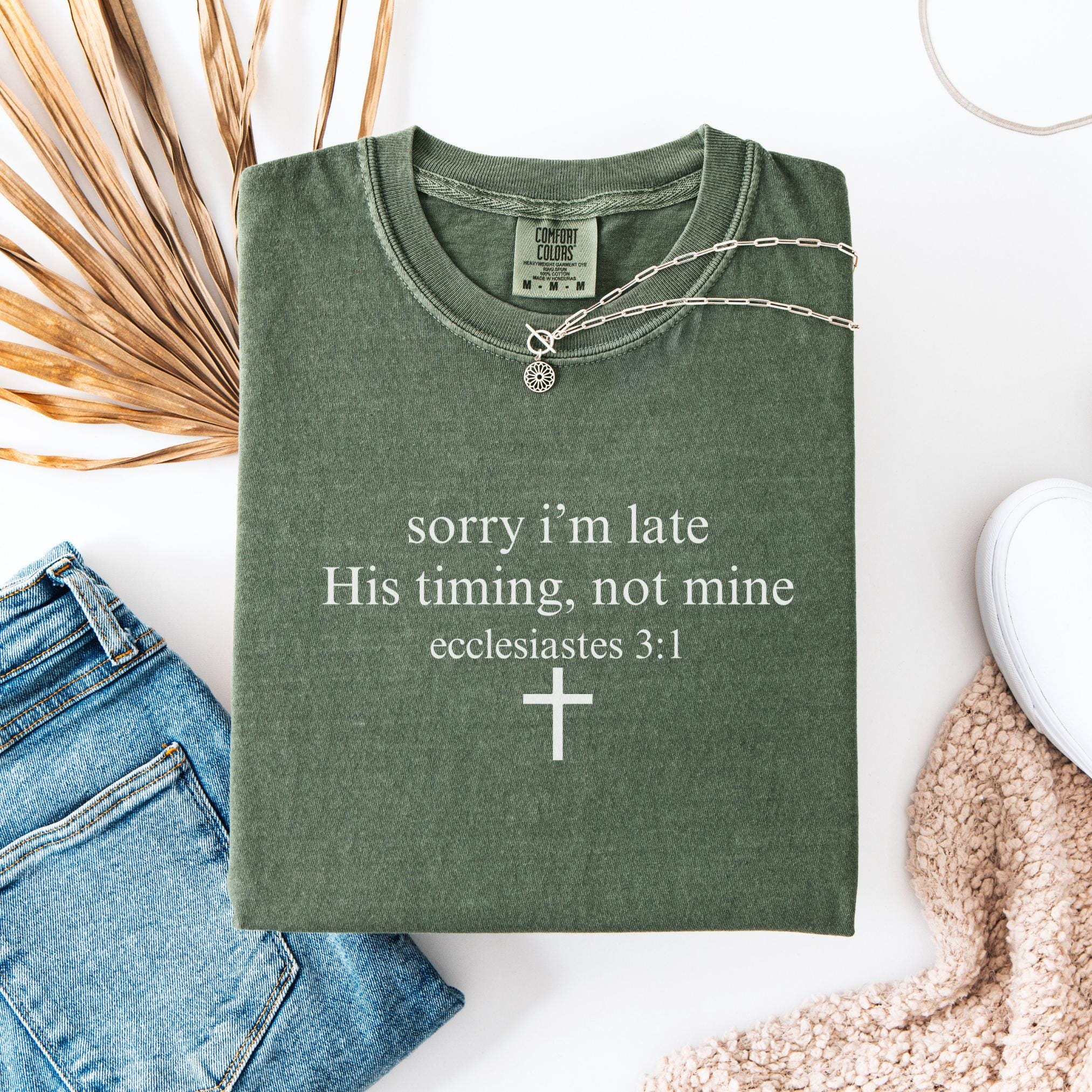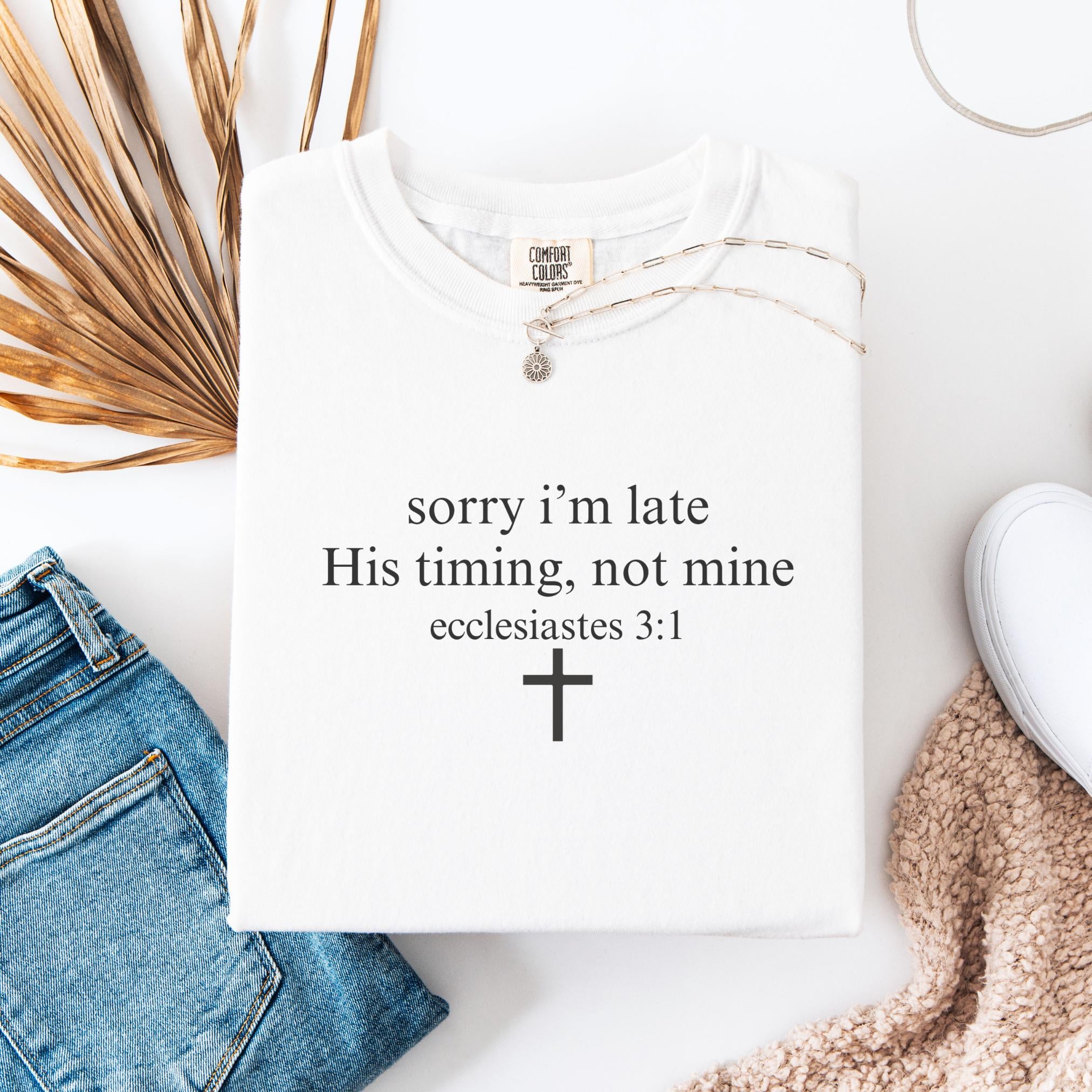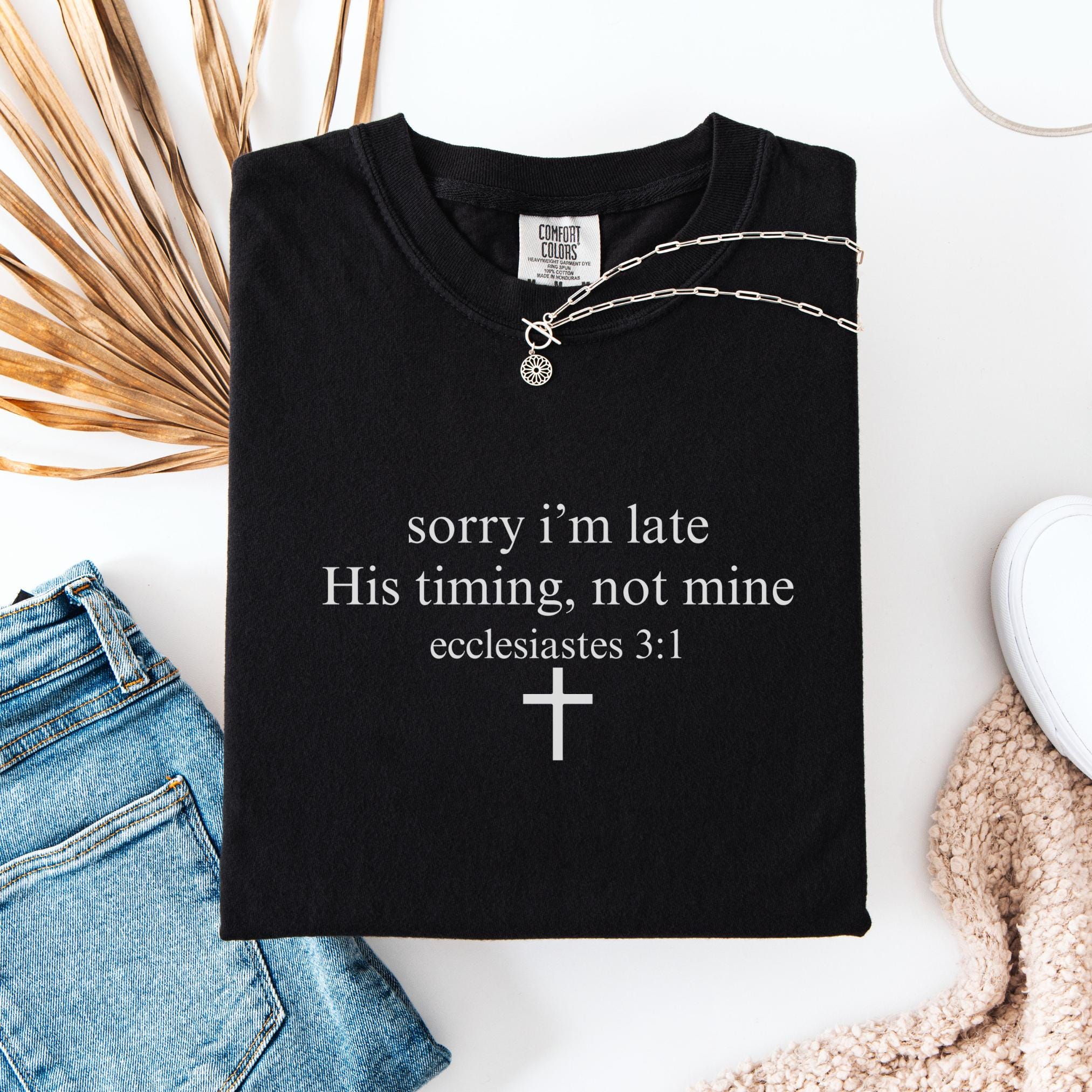 Faith meets everyday style with this “Sorry I’m Late, His Timing, Not Mine” Comfort Colors® tee. Featuring Ecclesiastes 3:1, this faith-based t-shirt is a perfect reminder that God’s timing is always greater than our own.