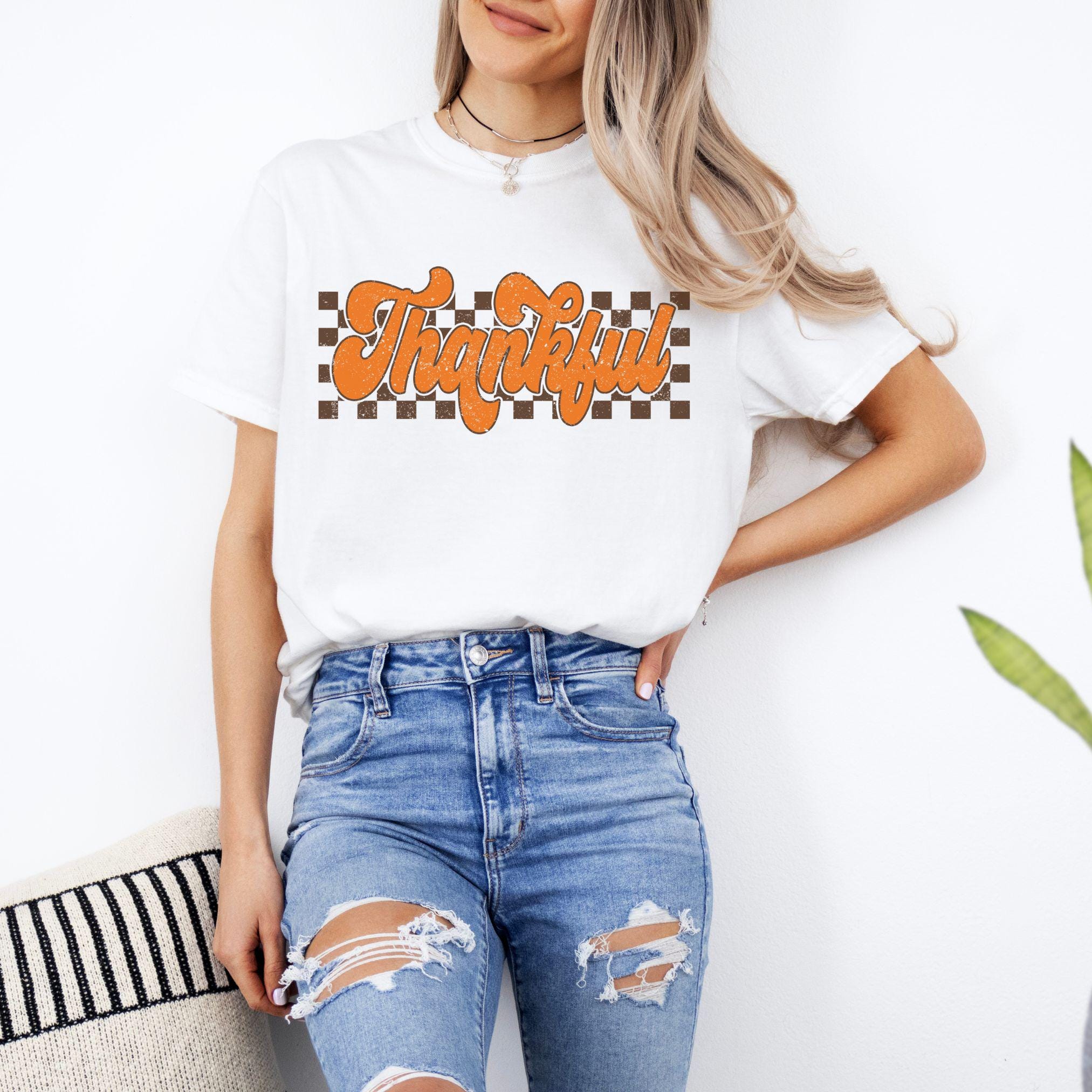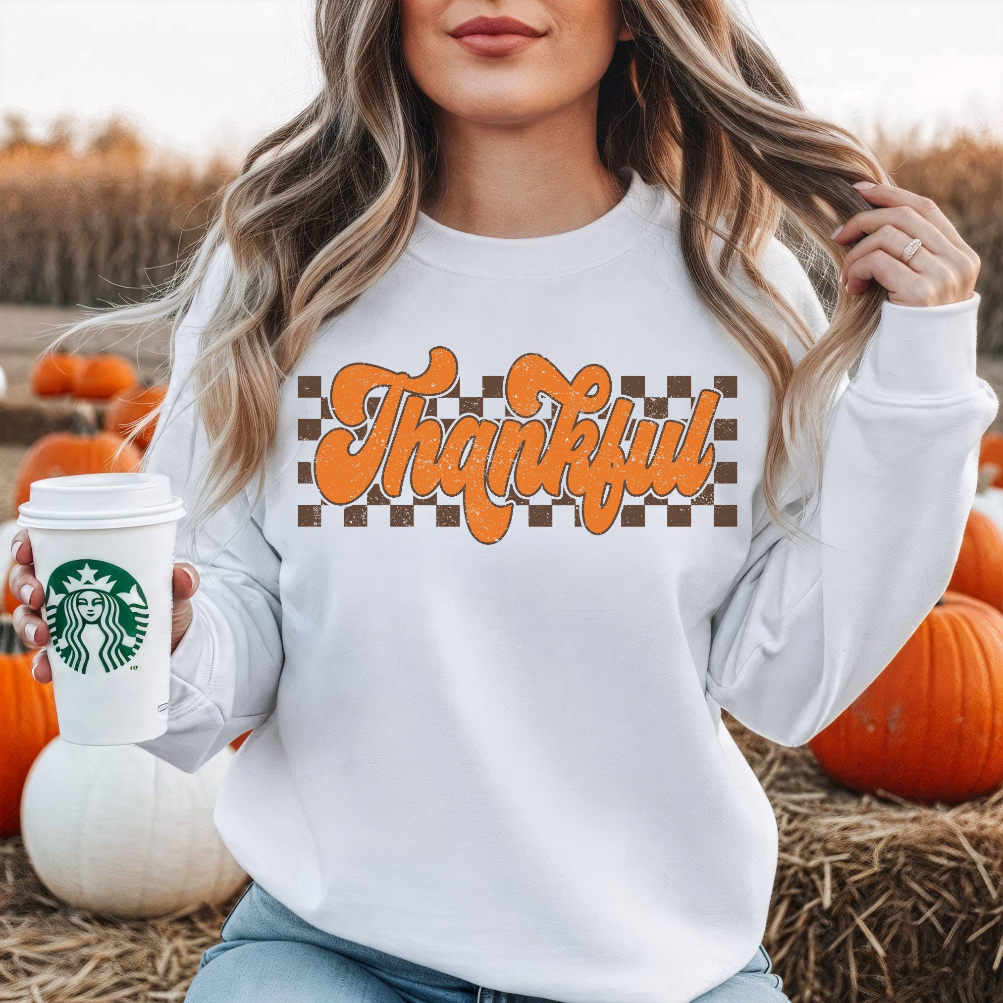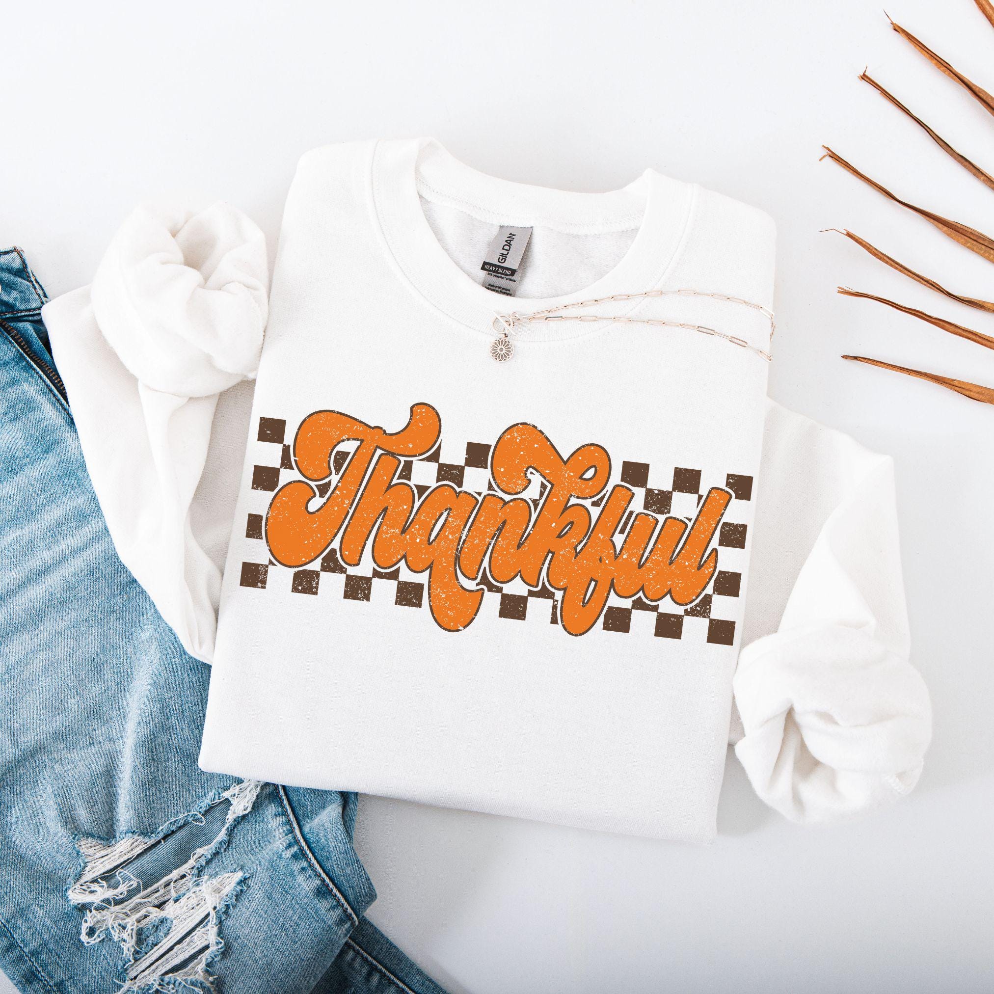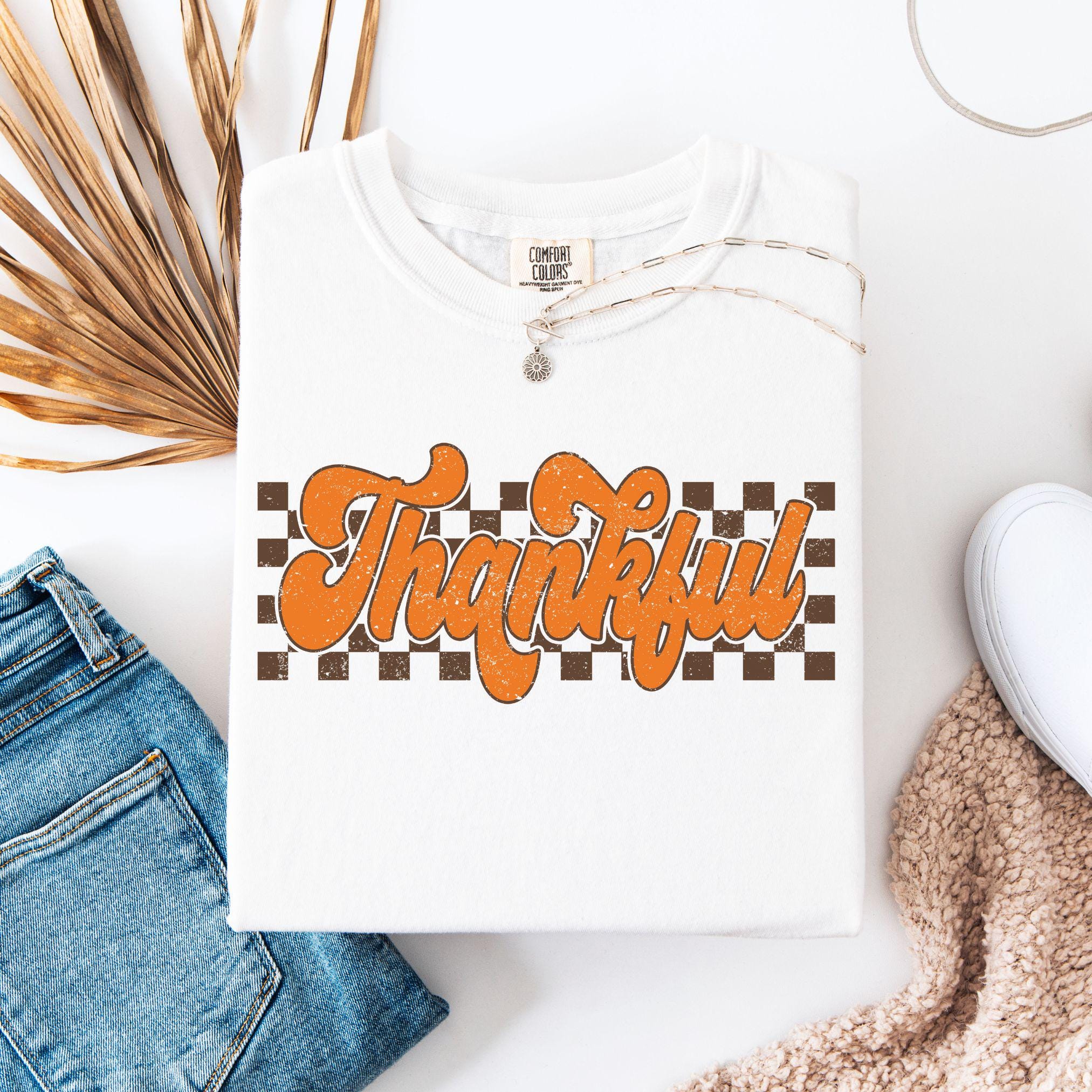 Celebrate the season of gratitude with this retro-inspired “Thankful” shirt or sweatshirt. Featuring a bold orange script font with a distressed effect and a trendy brown checkered backdrop, this design brings cozy fall vibes and a stylish edge to your autumn wardrobe.