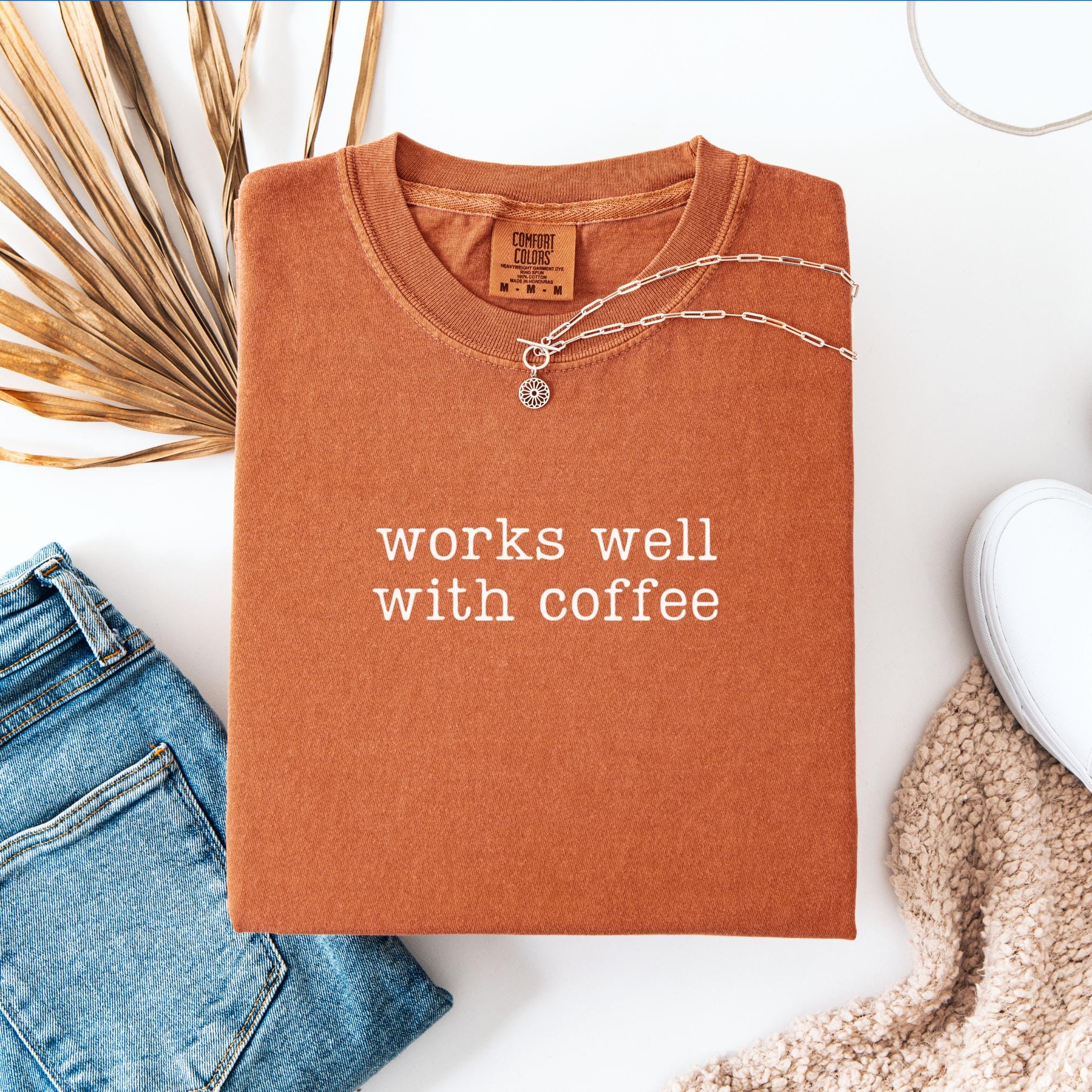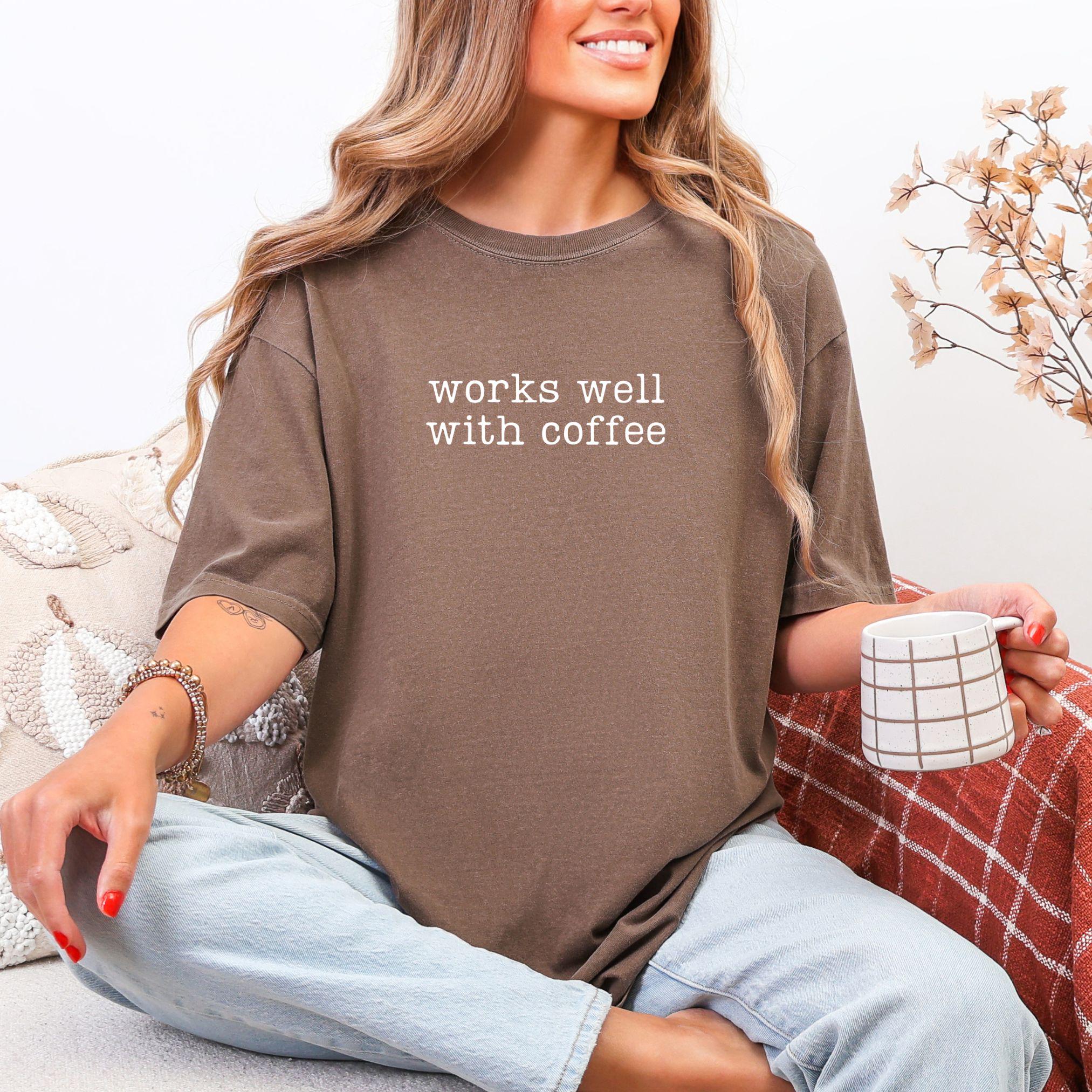 Start your day with style and humor in our Works Well With Coffee Comfort Colors Tee. Perfect for coffee lovers, this soft-washed, vintage-inspired shirt features the playful phrase “works well with coffee” printed in minimalist white text.