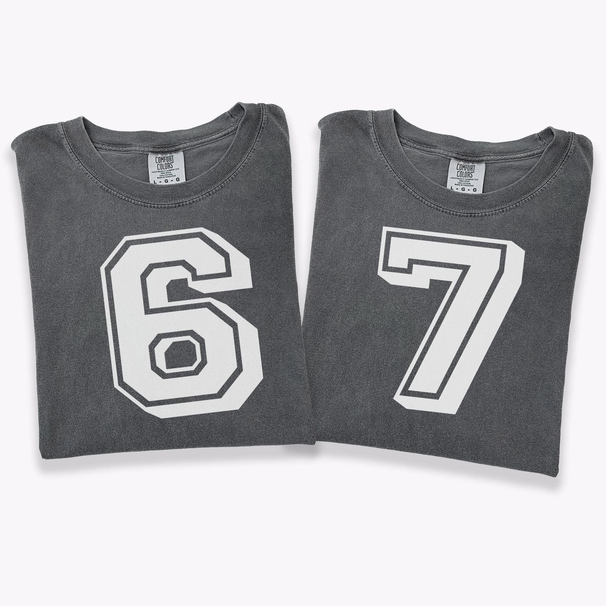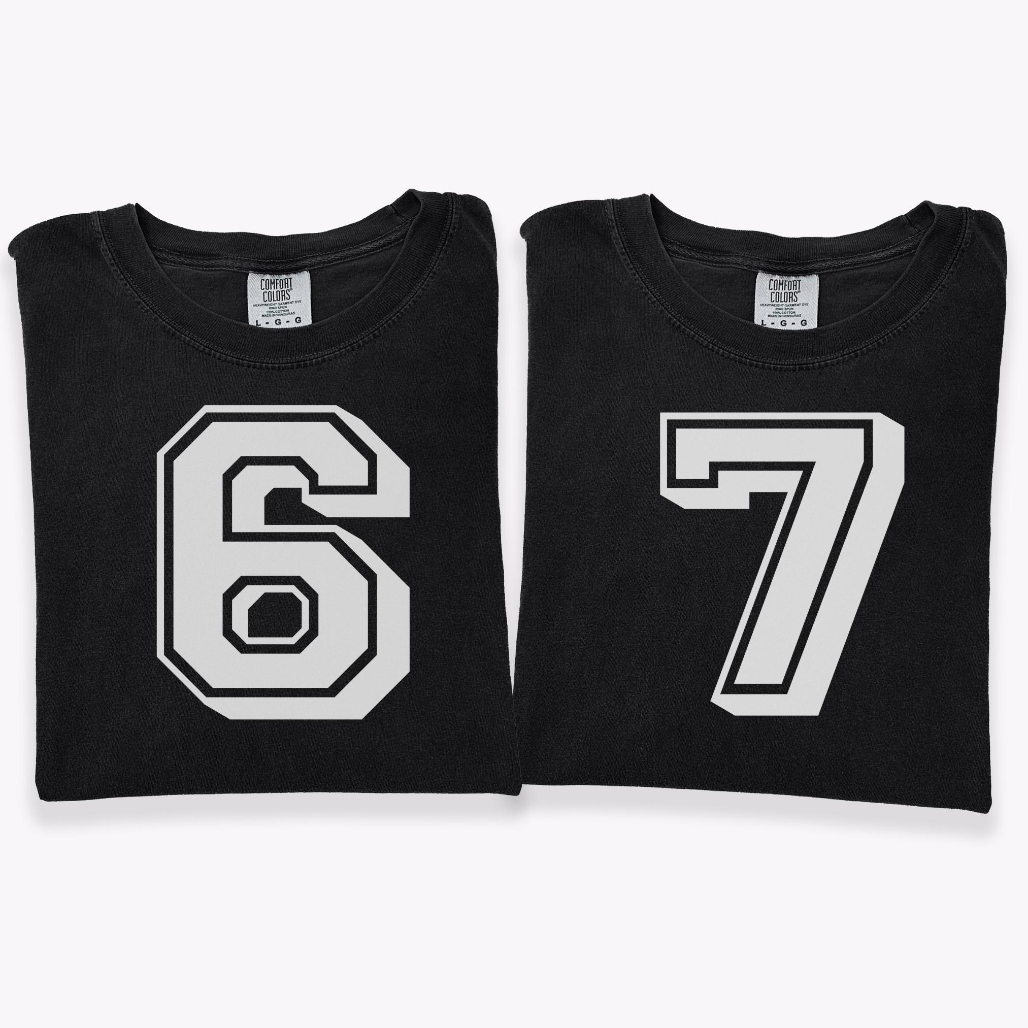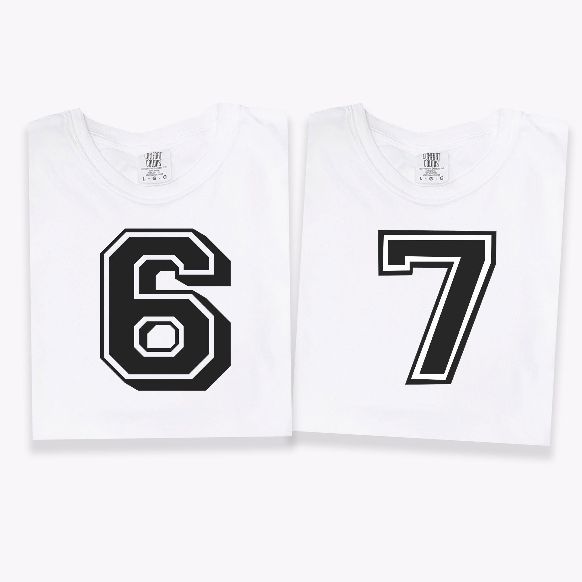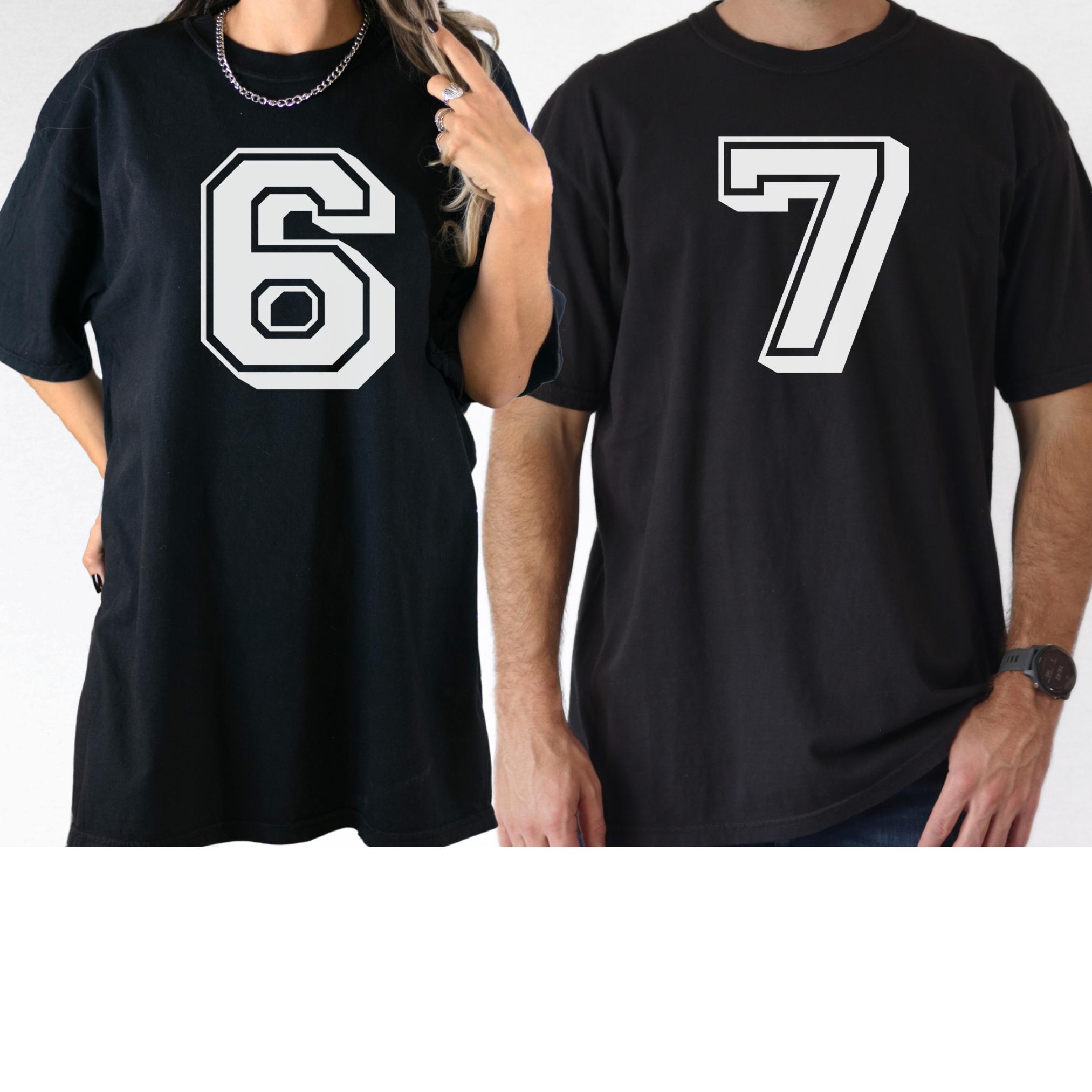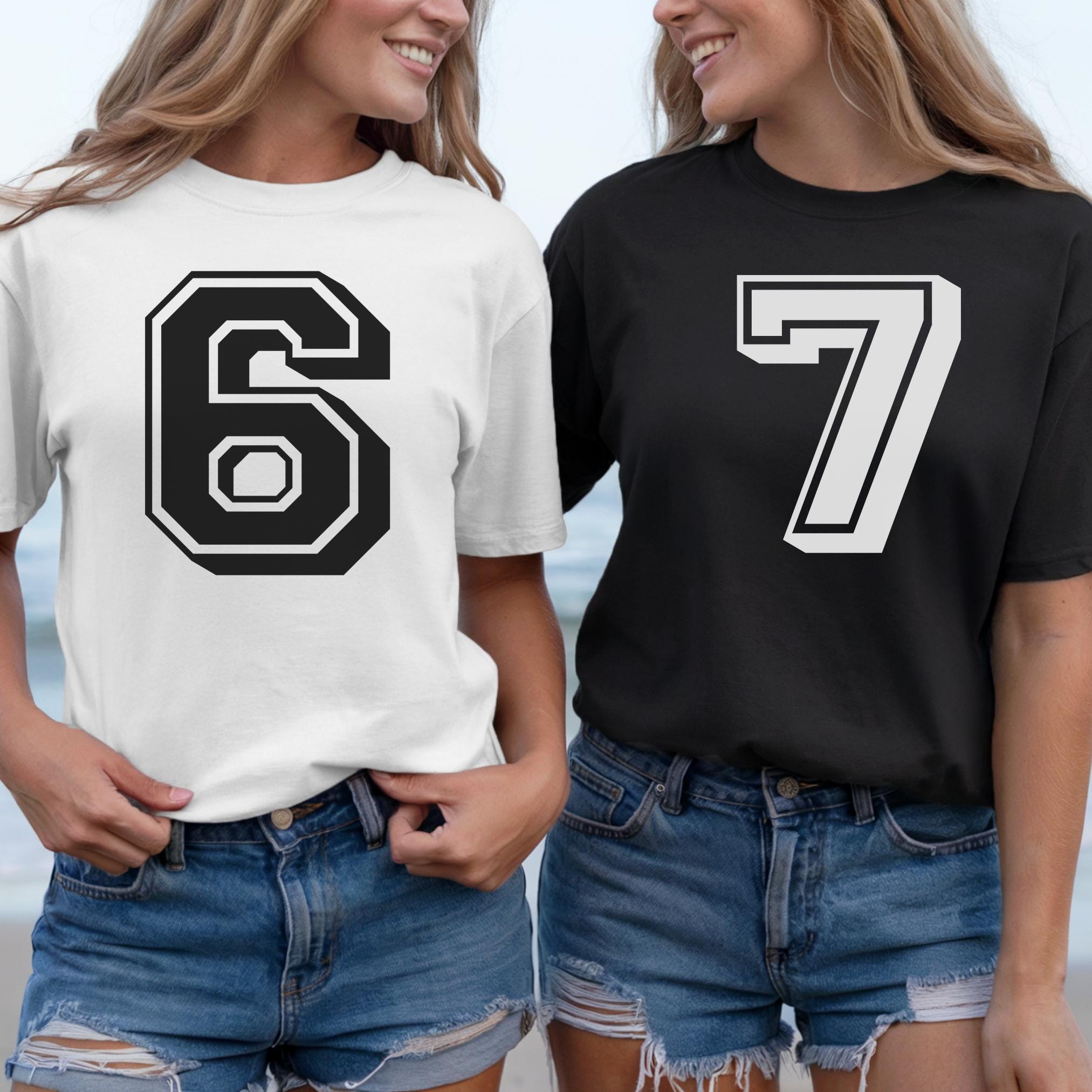 This bundle includes two unisex t-shirts—one with the number 6 in black on a white shirt, and the other with the number 7 in white on a black shirt. The simple yet eye-catching design is versatile, making them easy to style with jeans, shorts, or layered looks.