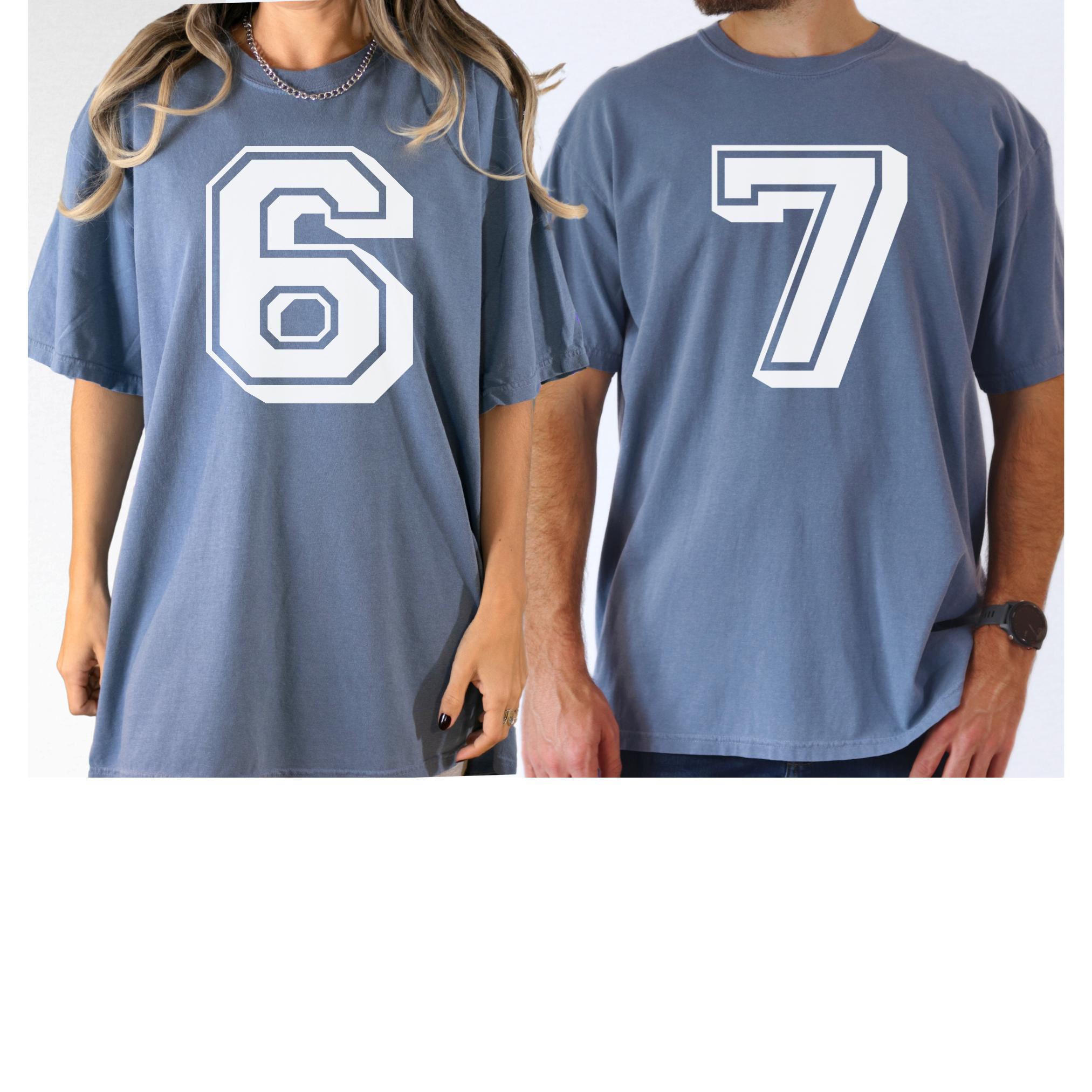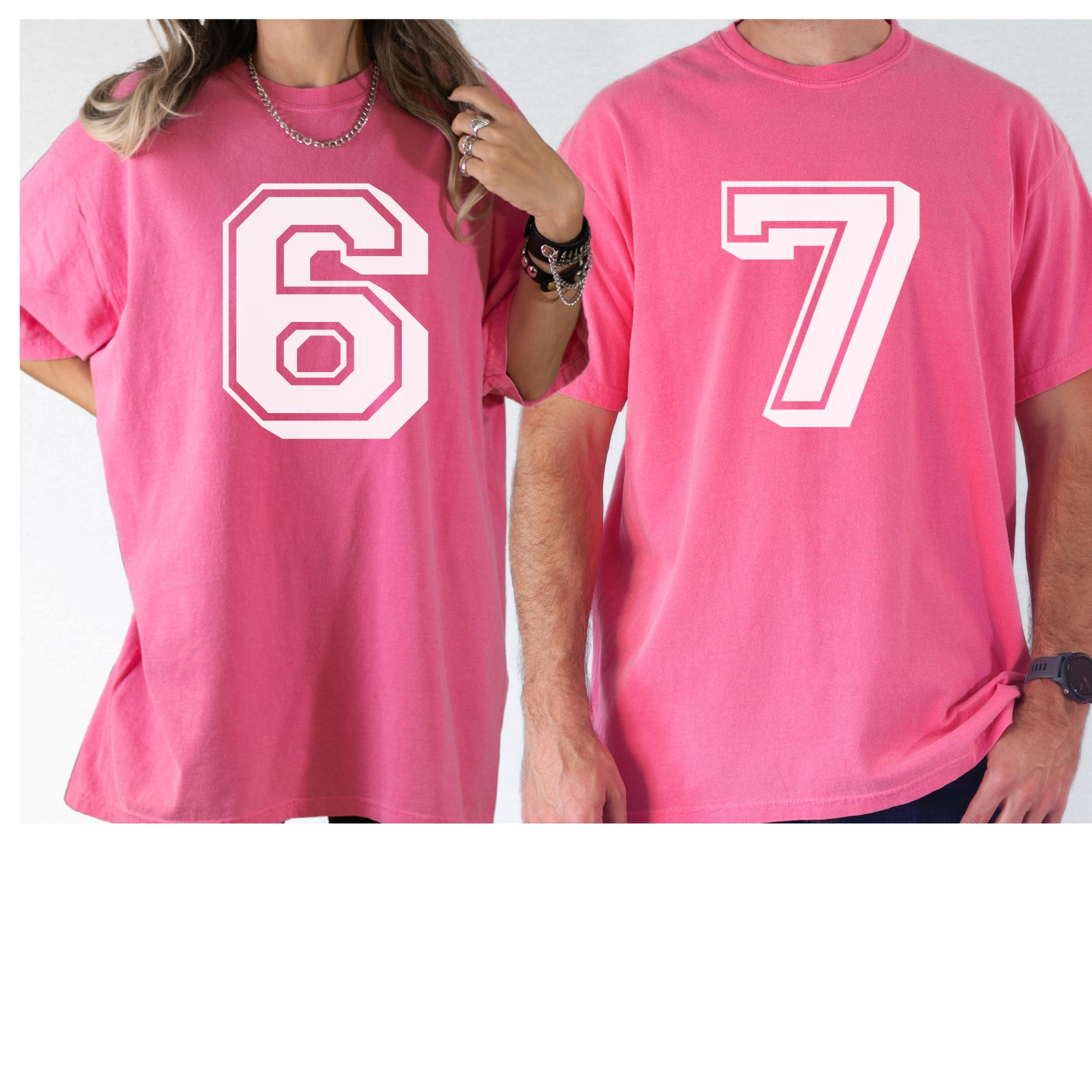 Show off your playful side with this matching 6 & 7 T-Shirt Bundle (Both shirts included)—the perfect duo set for friends, sisters, couples, or anyone who loves a good inside joke. Featuring bold varsity-style numbers on soft cotton tees, these shirts make a fun statement whether you’re headed to the beach, hanging out at a festival, or snapping photos together.