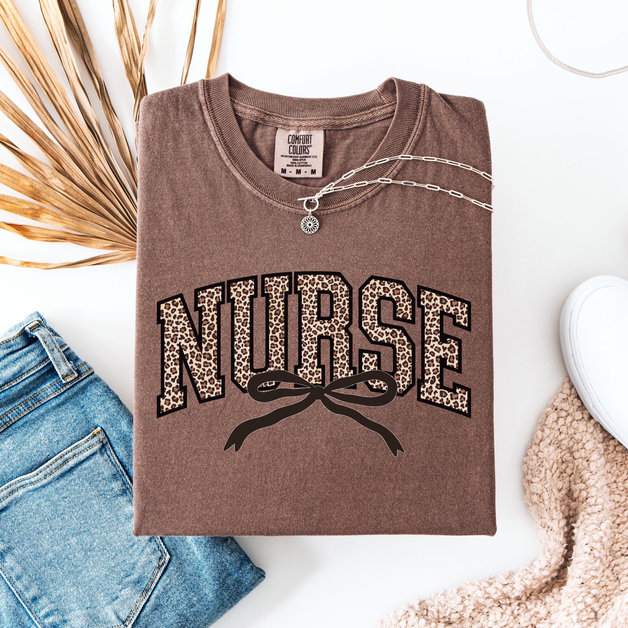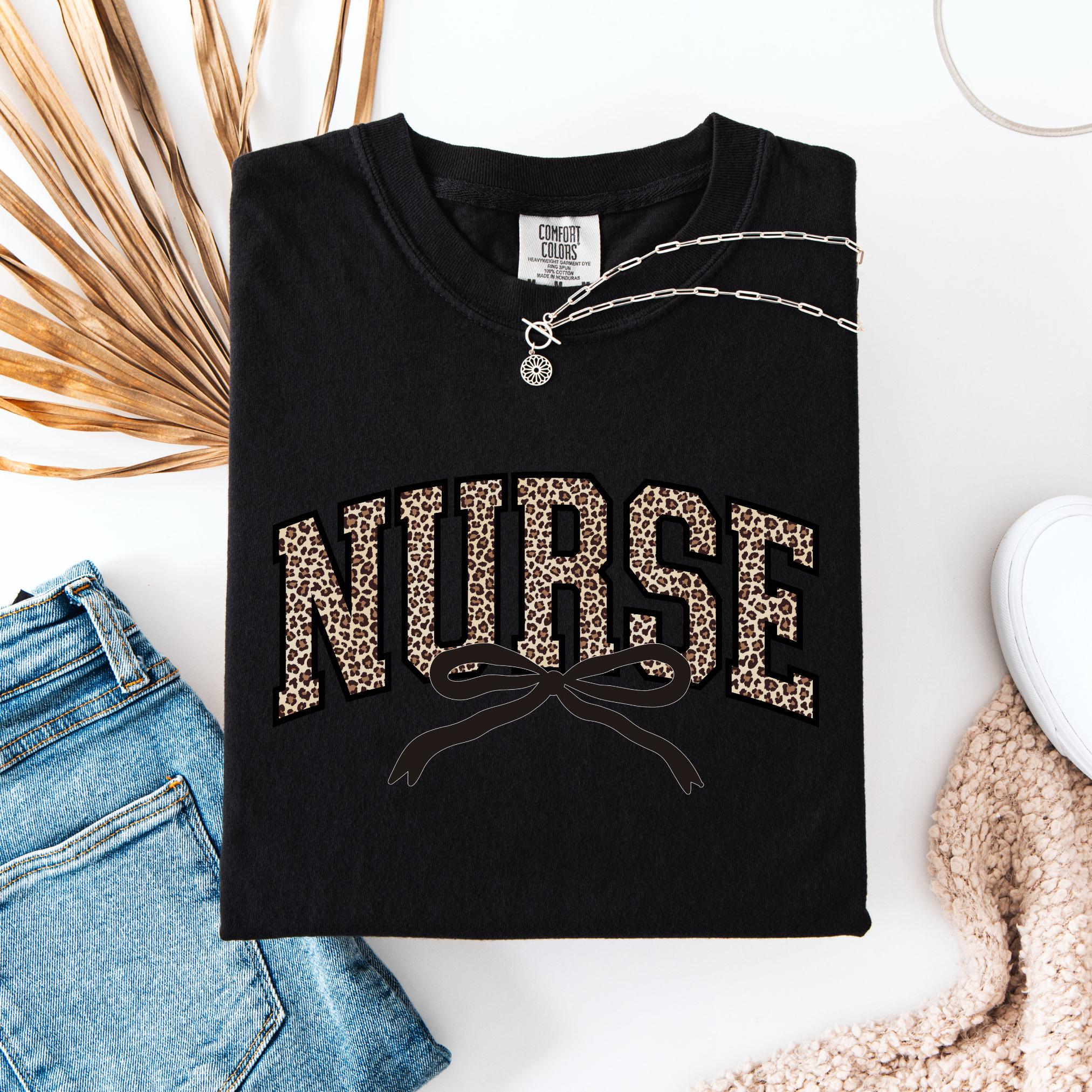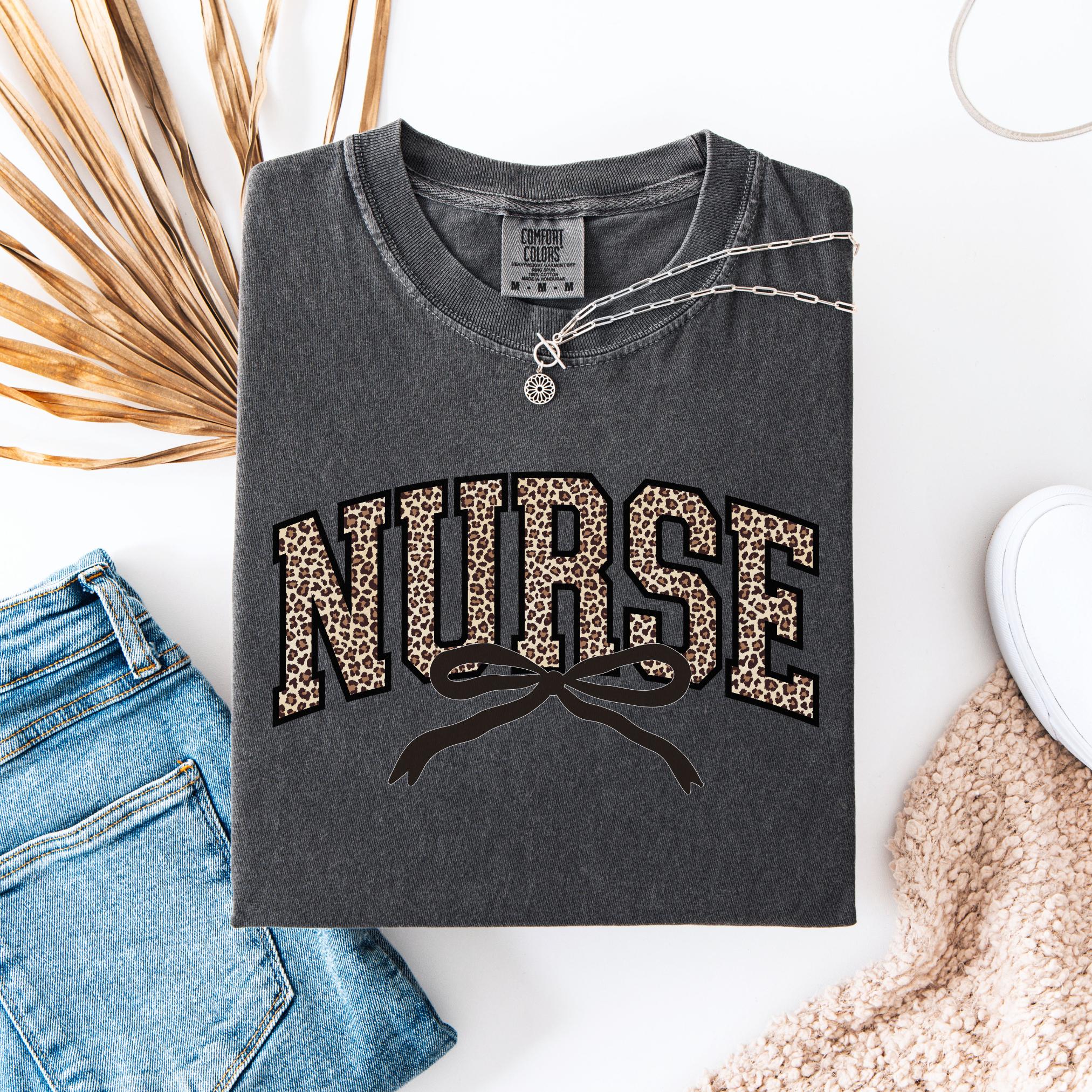 Stay cozy, chic, and confident while showing off your nurse pride with this leopard bow Comfort Colors tee—because caring for others never looked so good!
