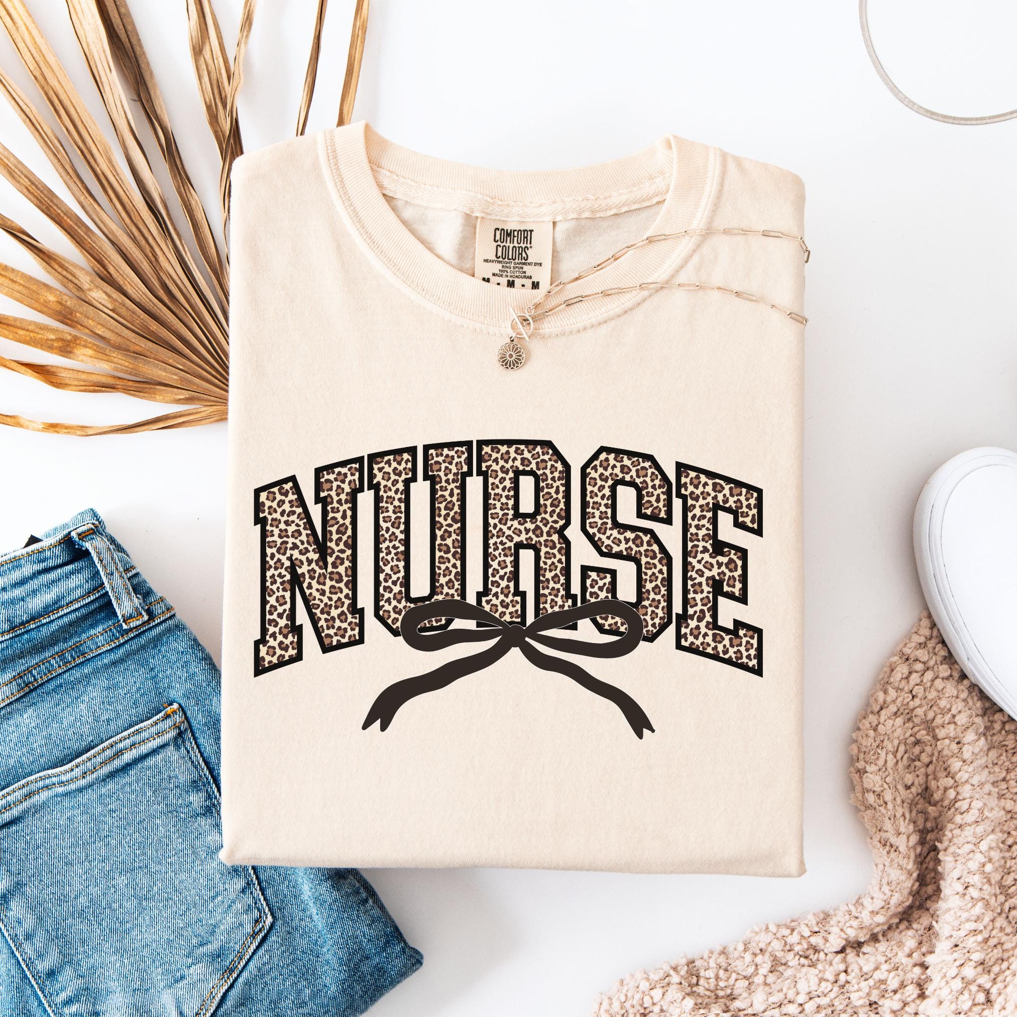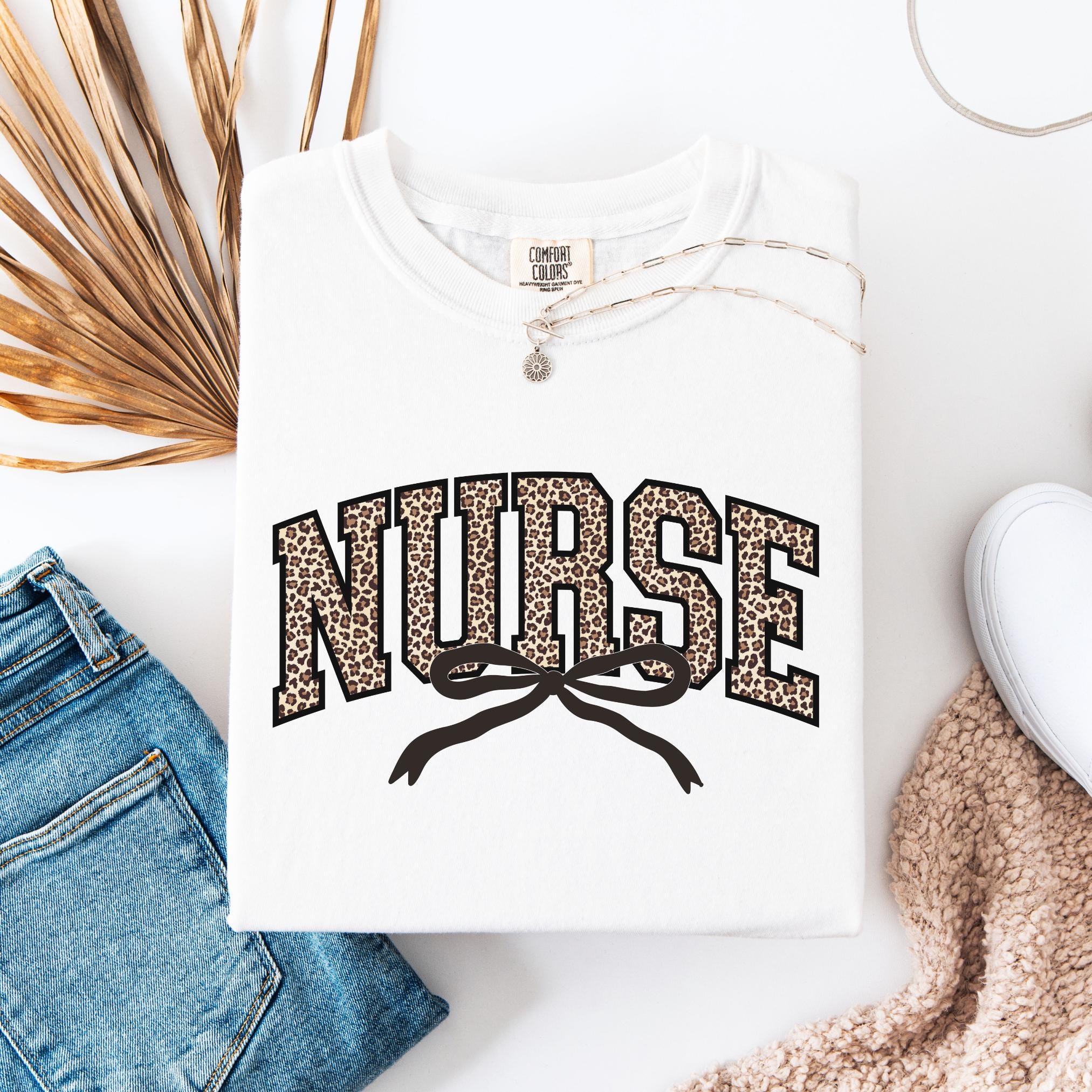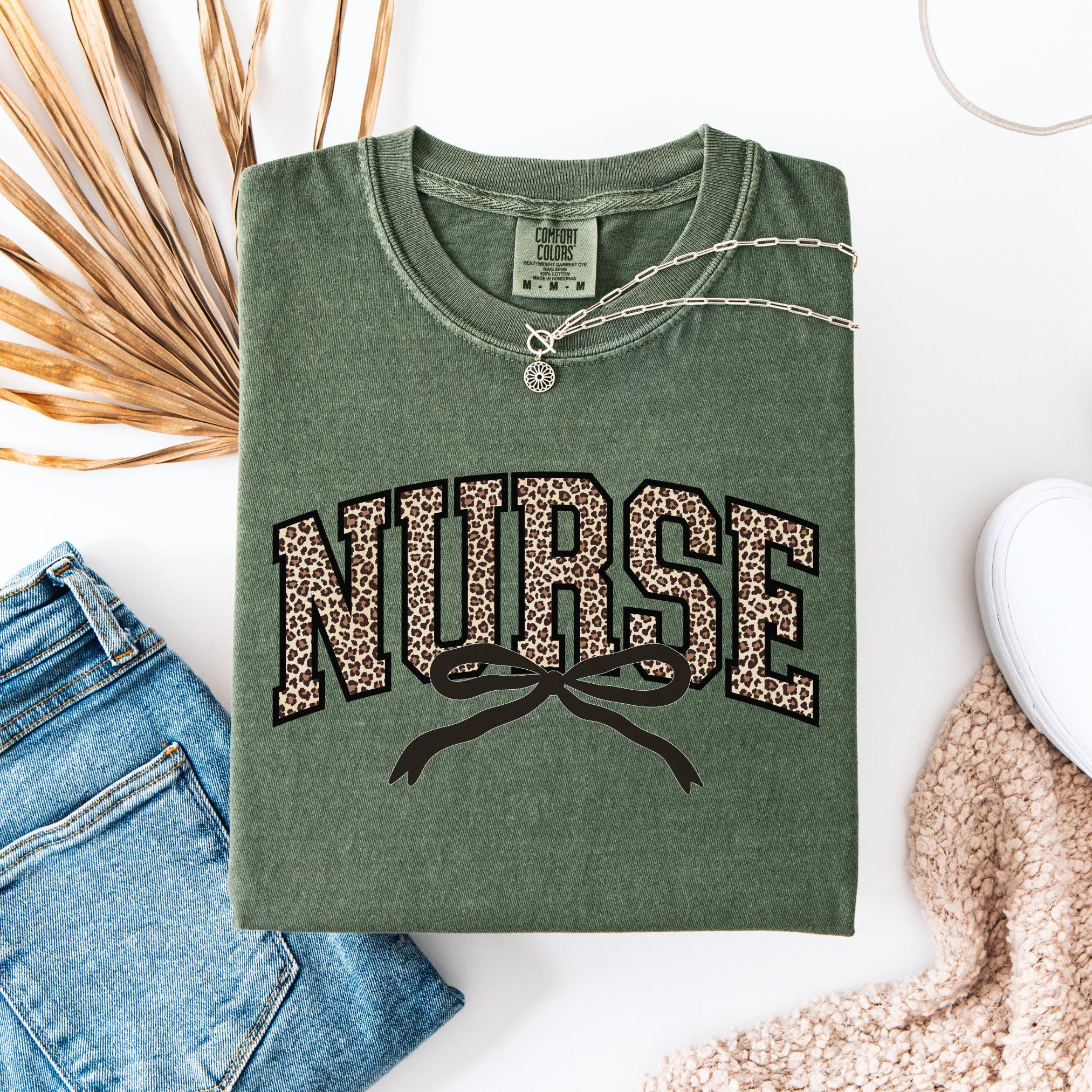 Stay cozy, chic, and confident while showing off your nurse pride with this leopard bow Comfort Colors tee—because caring for others never looked so good!
