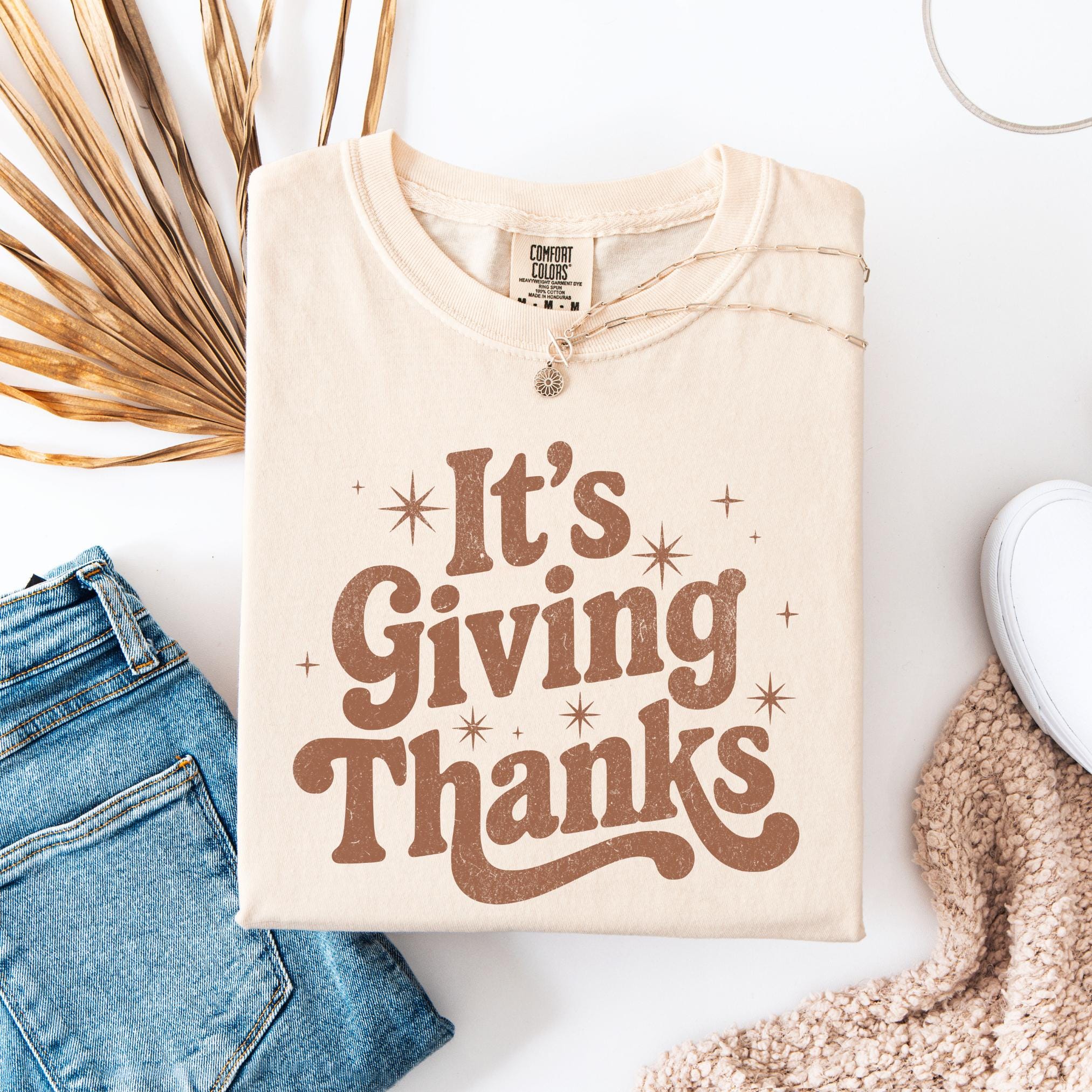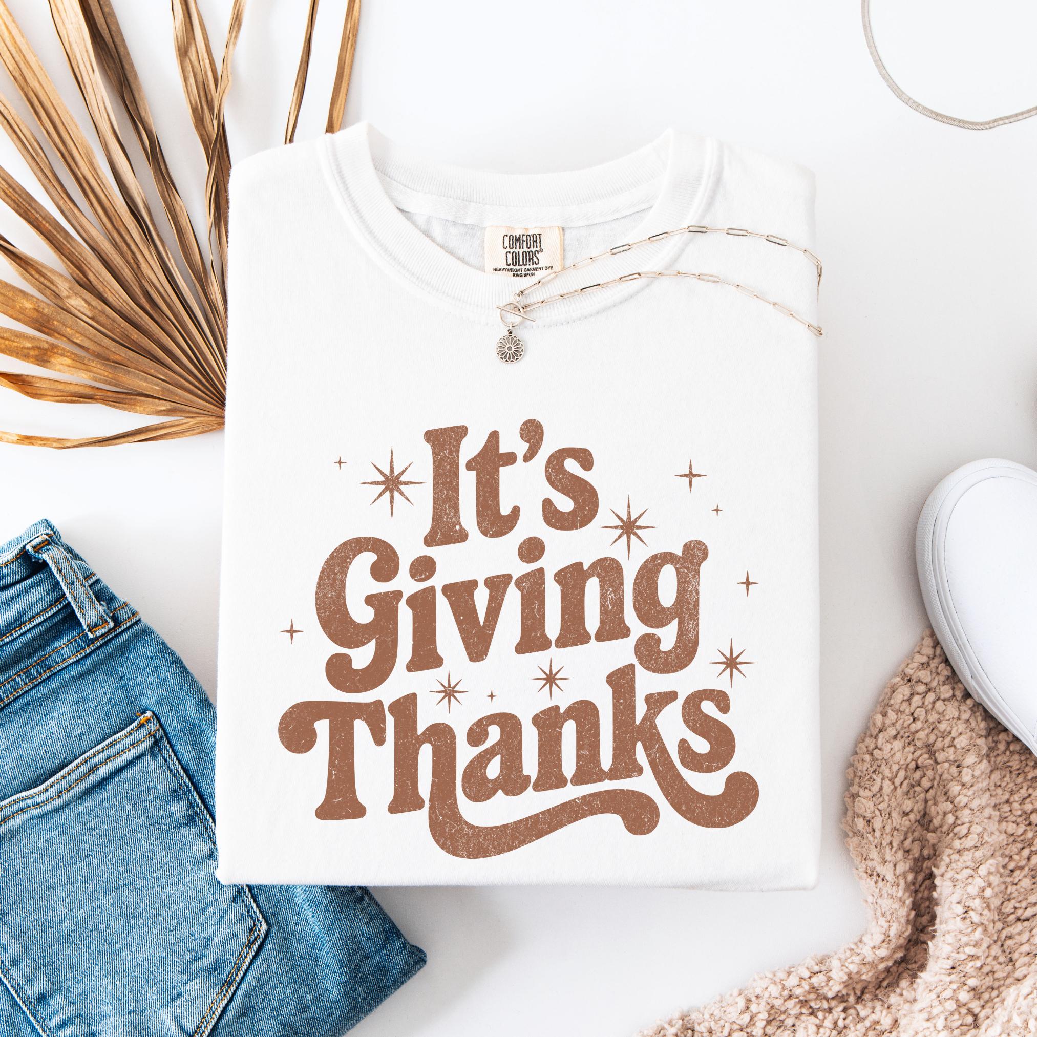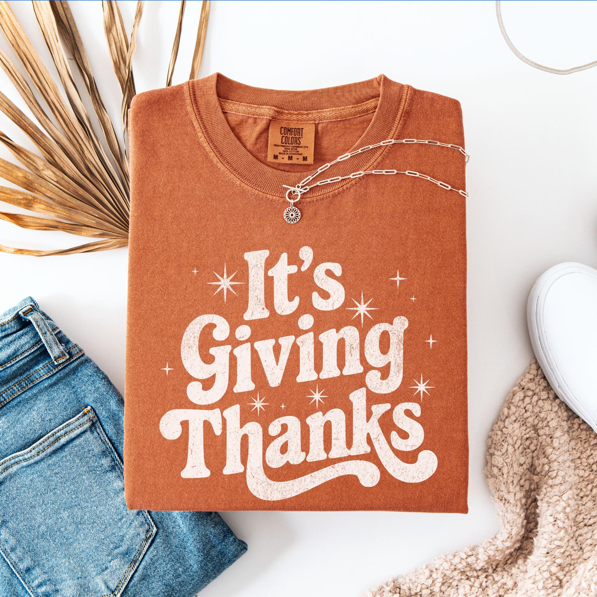 Bring cozy vibes and gratitude to your fall wardrobe with this “It’s Giving Thanks” Comfort Colors Tee. Designed with bold retro lettering and playful sparkles, this shirt is perfect for Thanksgiving gatherings, Friendsgiving parties, or just showing off your festive fall spirit.