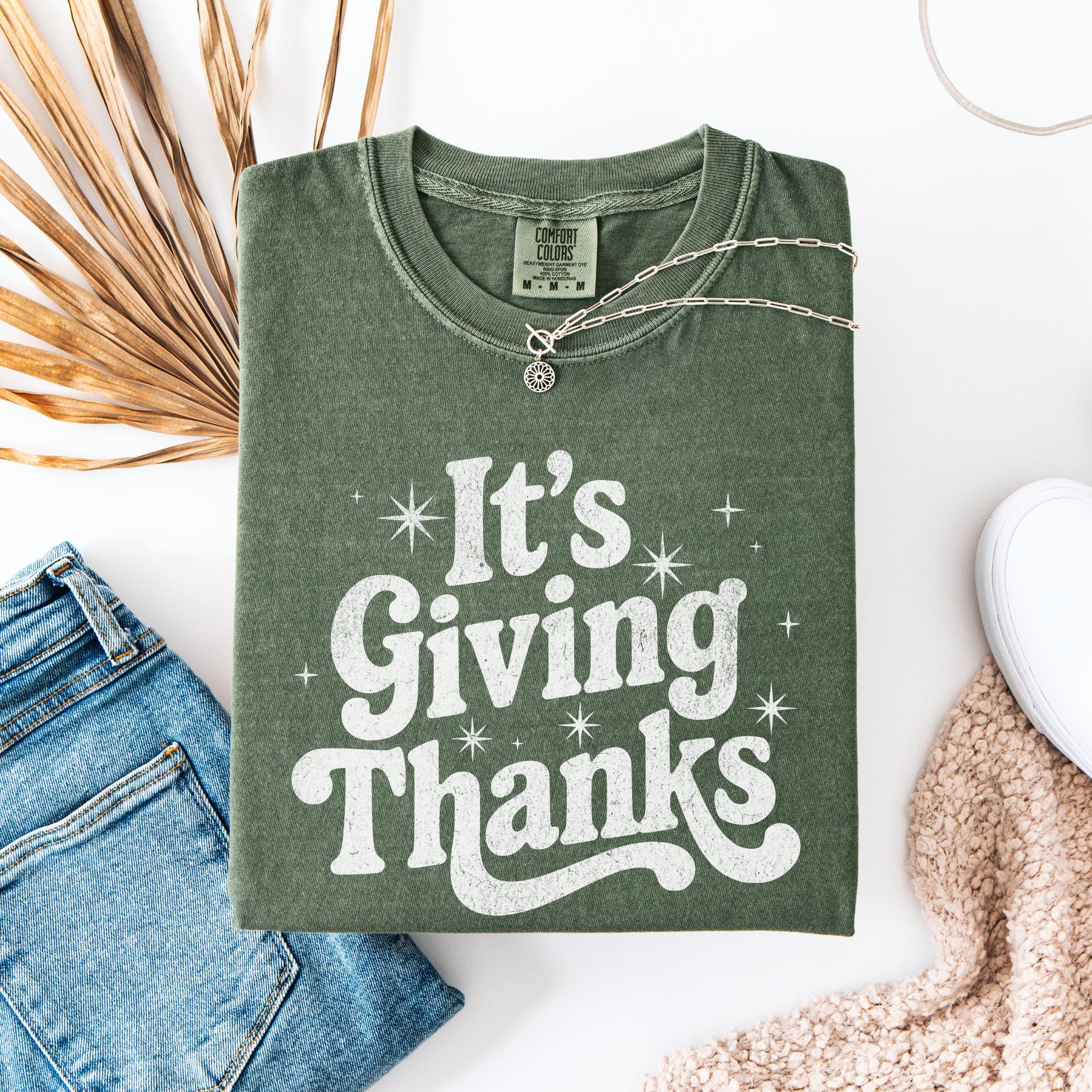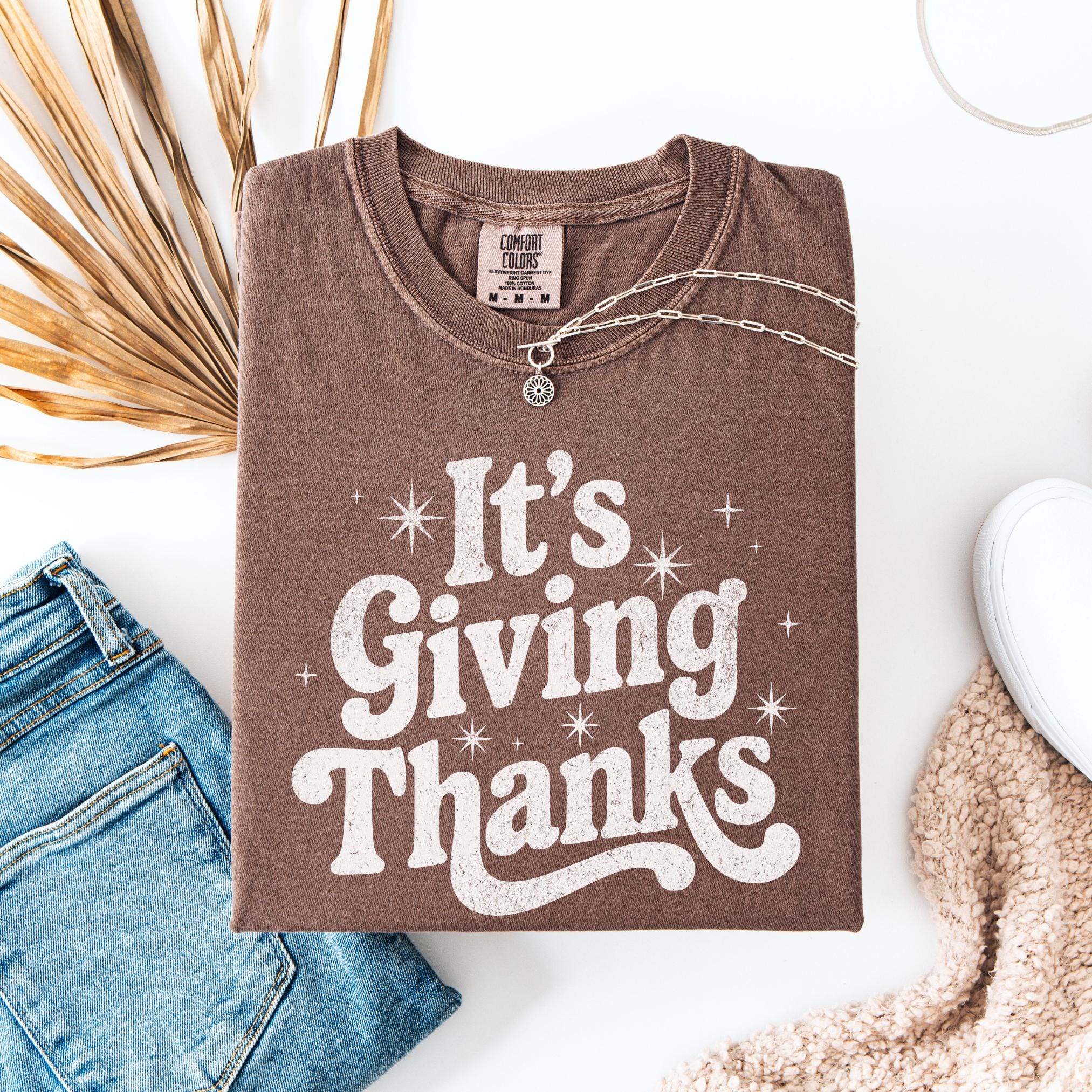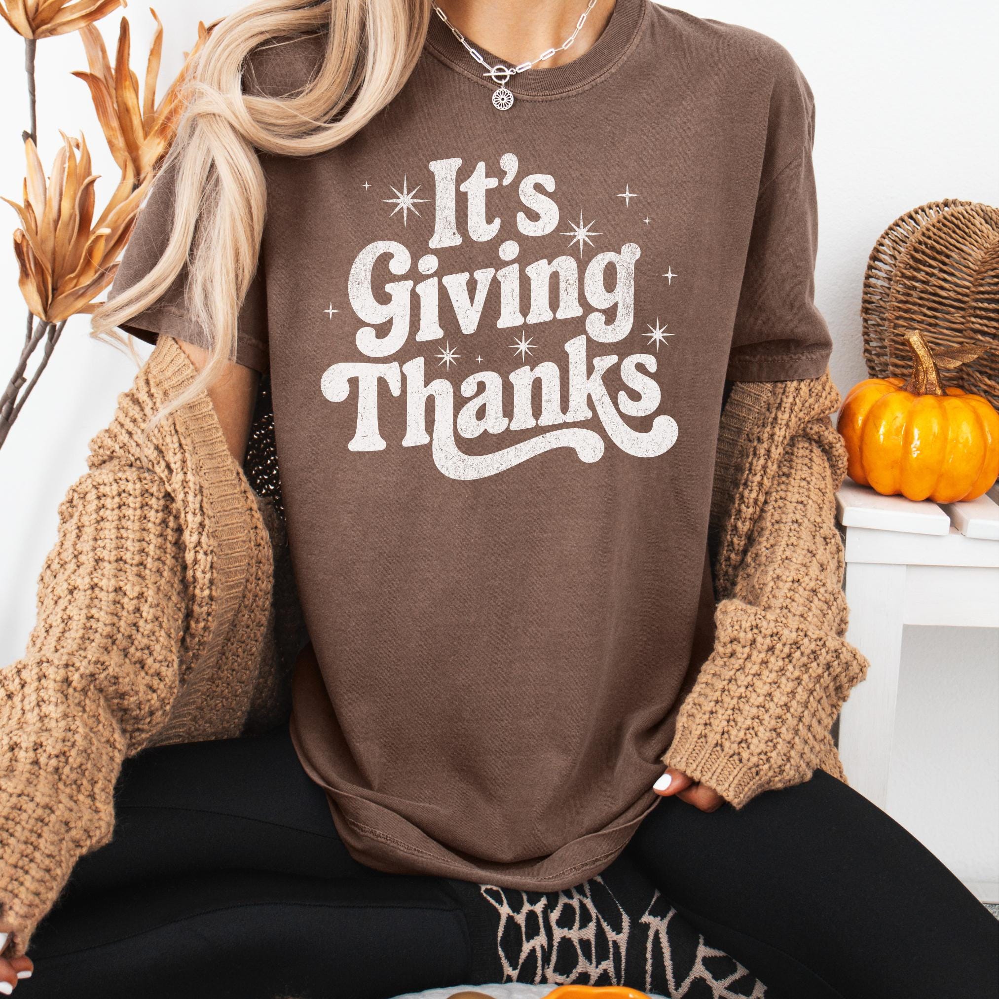 Bring cozy vibes and gratitude to your fall wardrobe with this “It’s Giving Thanks” Comfort Colors Tee. Designed with bold retro lettering and playful sparkles, this shirt is perfect for Thanksgiving gatherings, Friendsgiving parties, or just showing off your festive fall spirit.