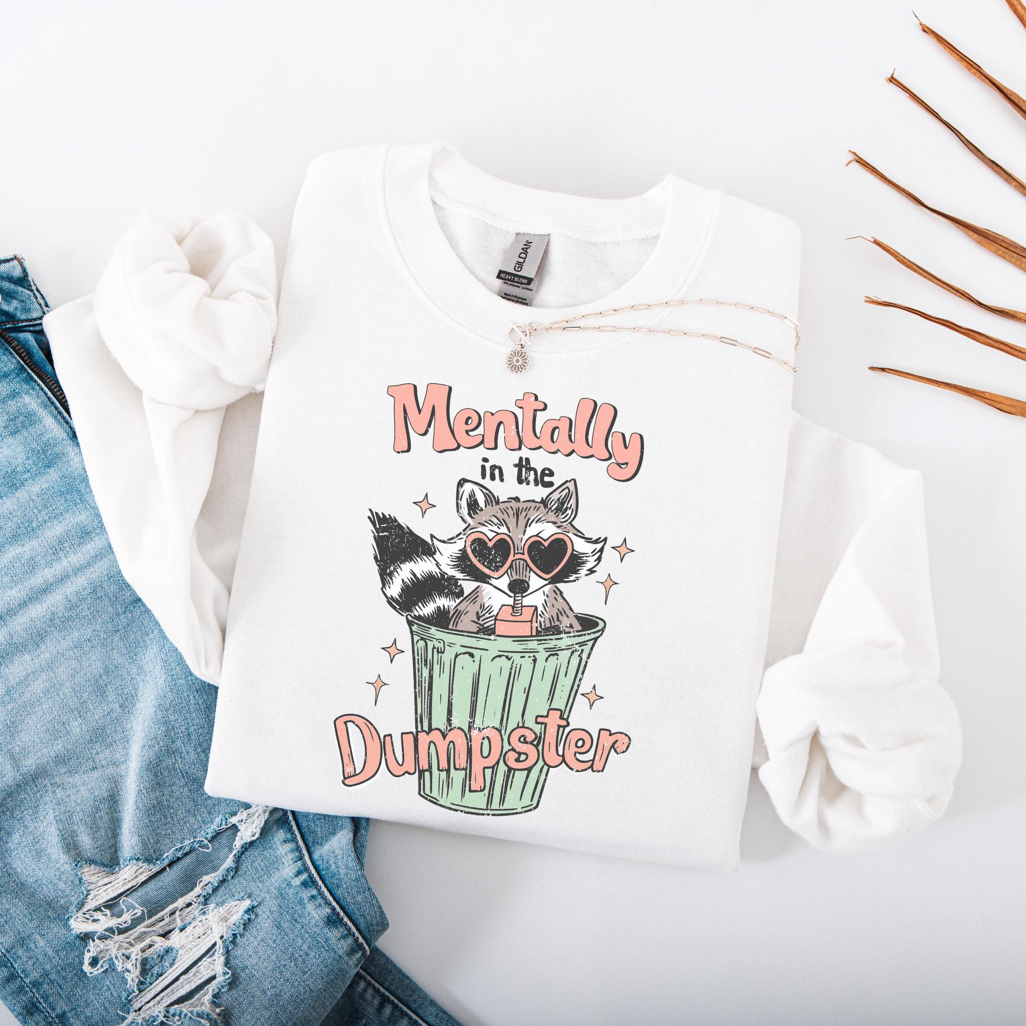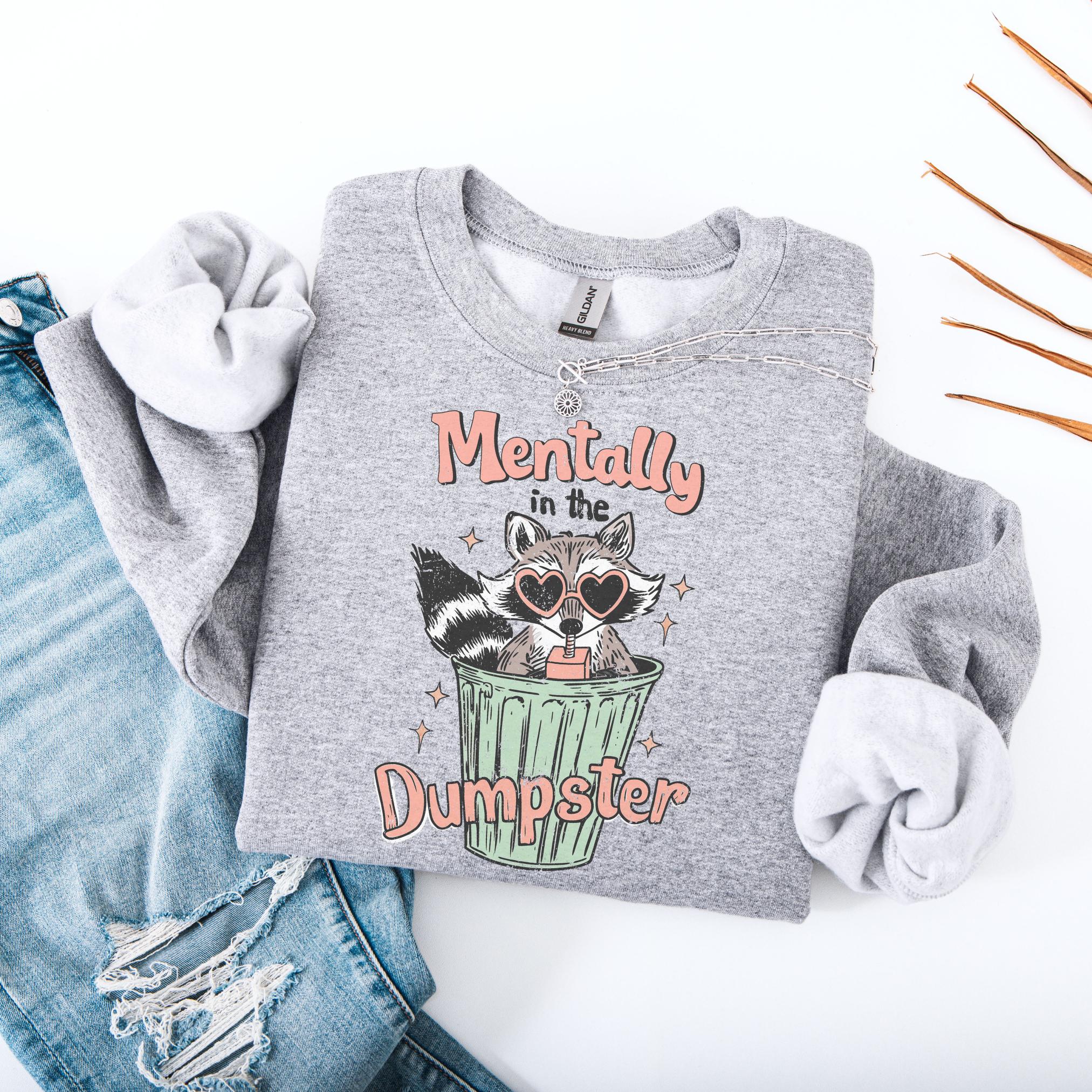 Get cozy while embracing your chaotic side with this hilarious Mentally in the Dumpster sweatshirt! Featuring an adorable raccoon sipping from a straw while chilling in a dumpster, this graphic pullover is the perfect blend of comfy and relatable.