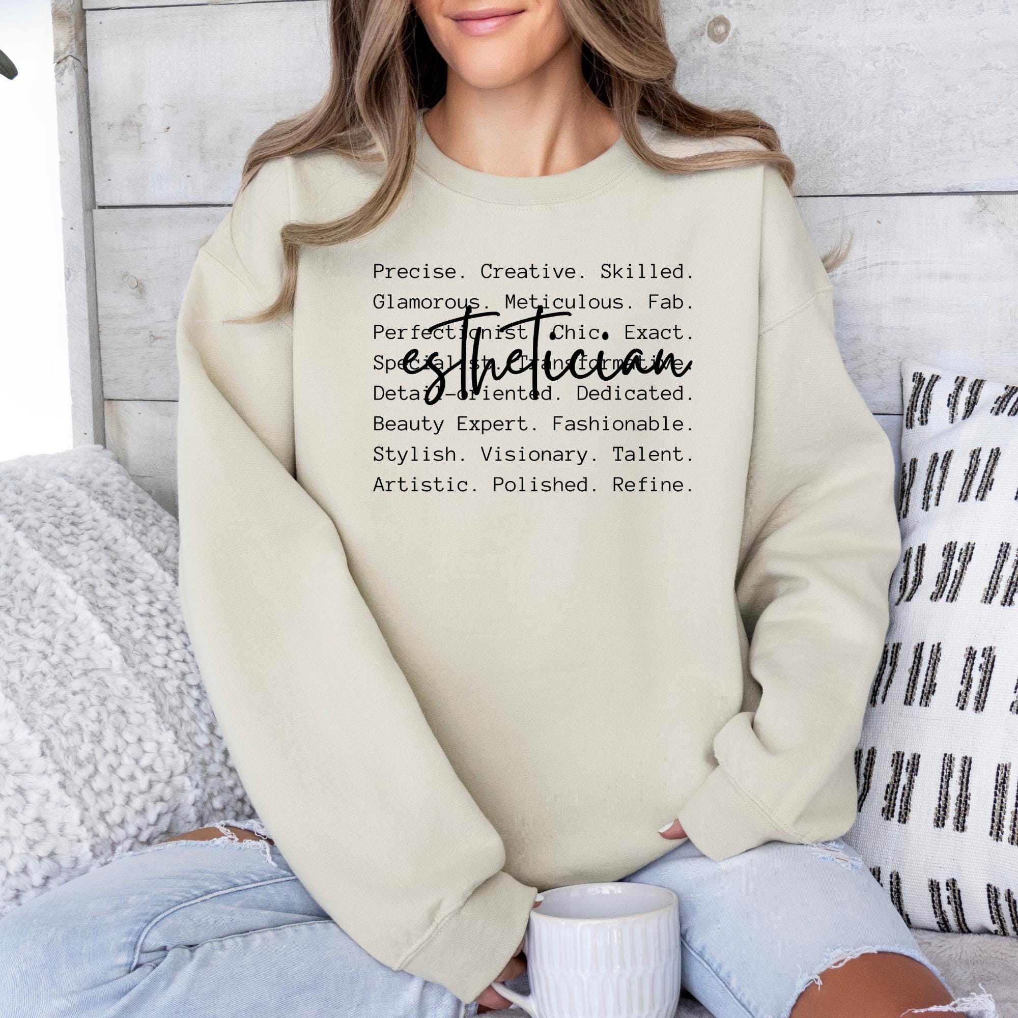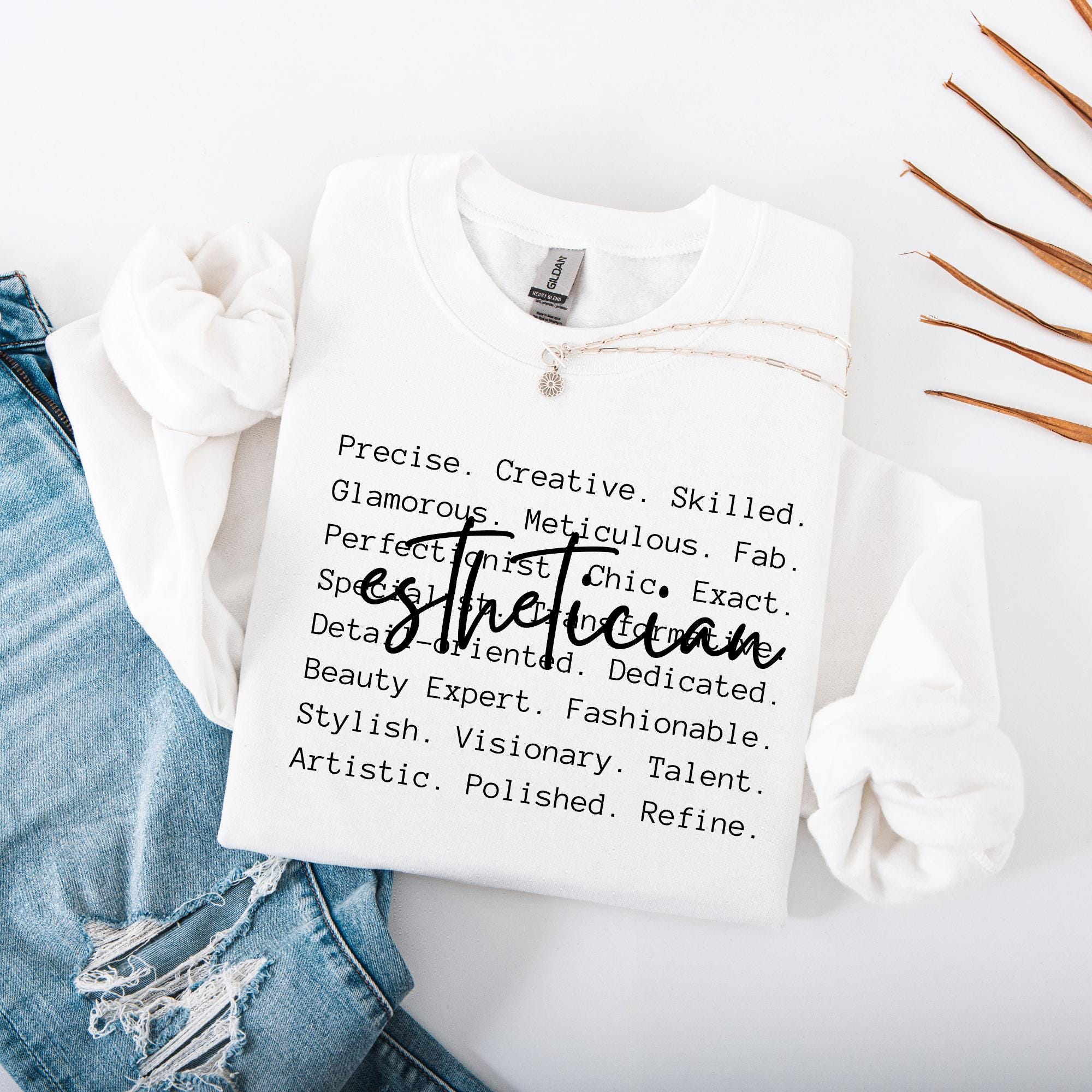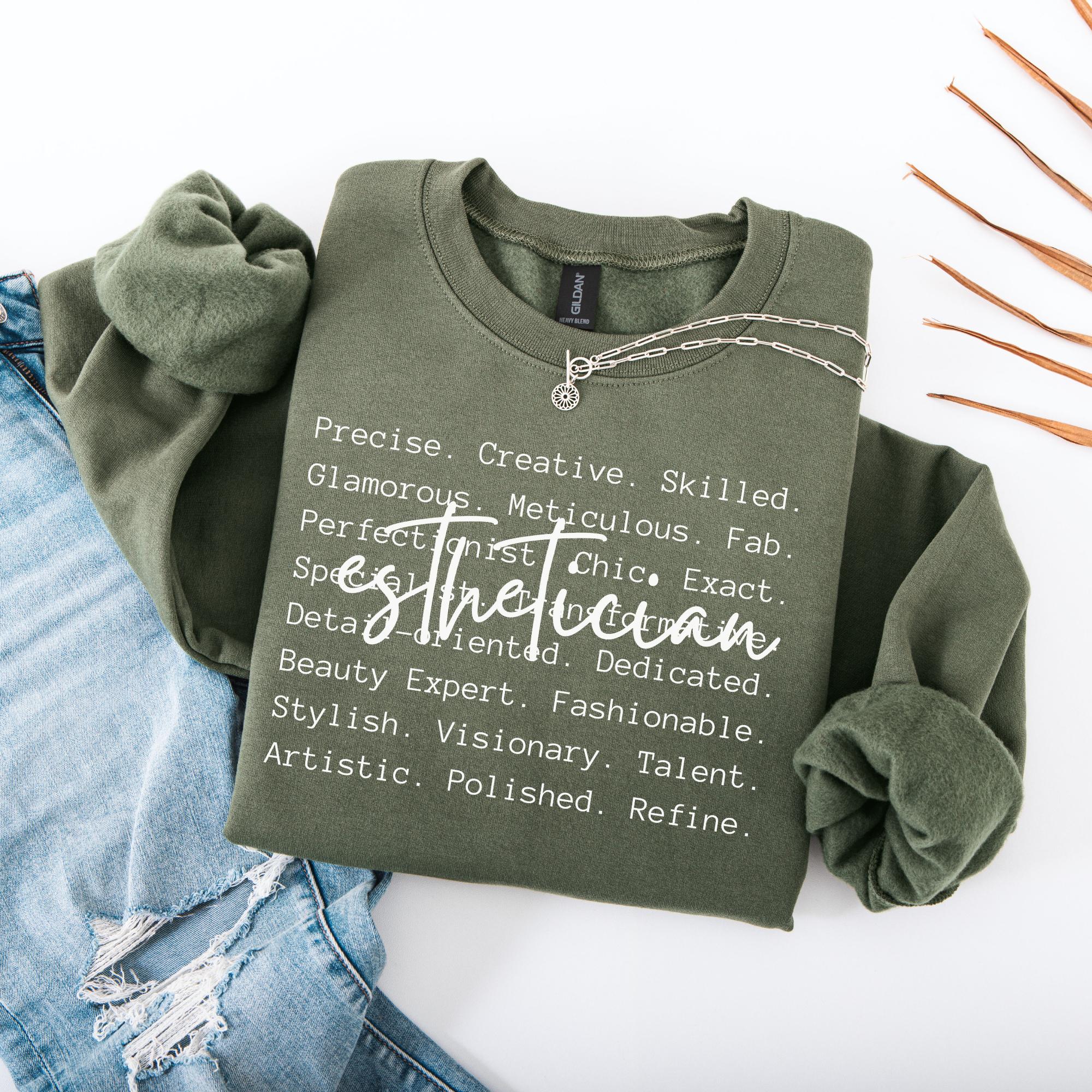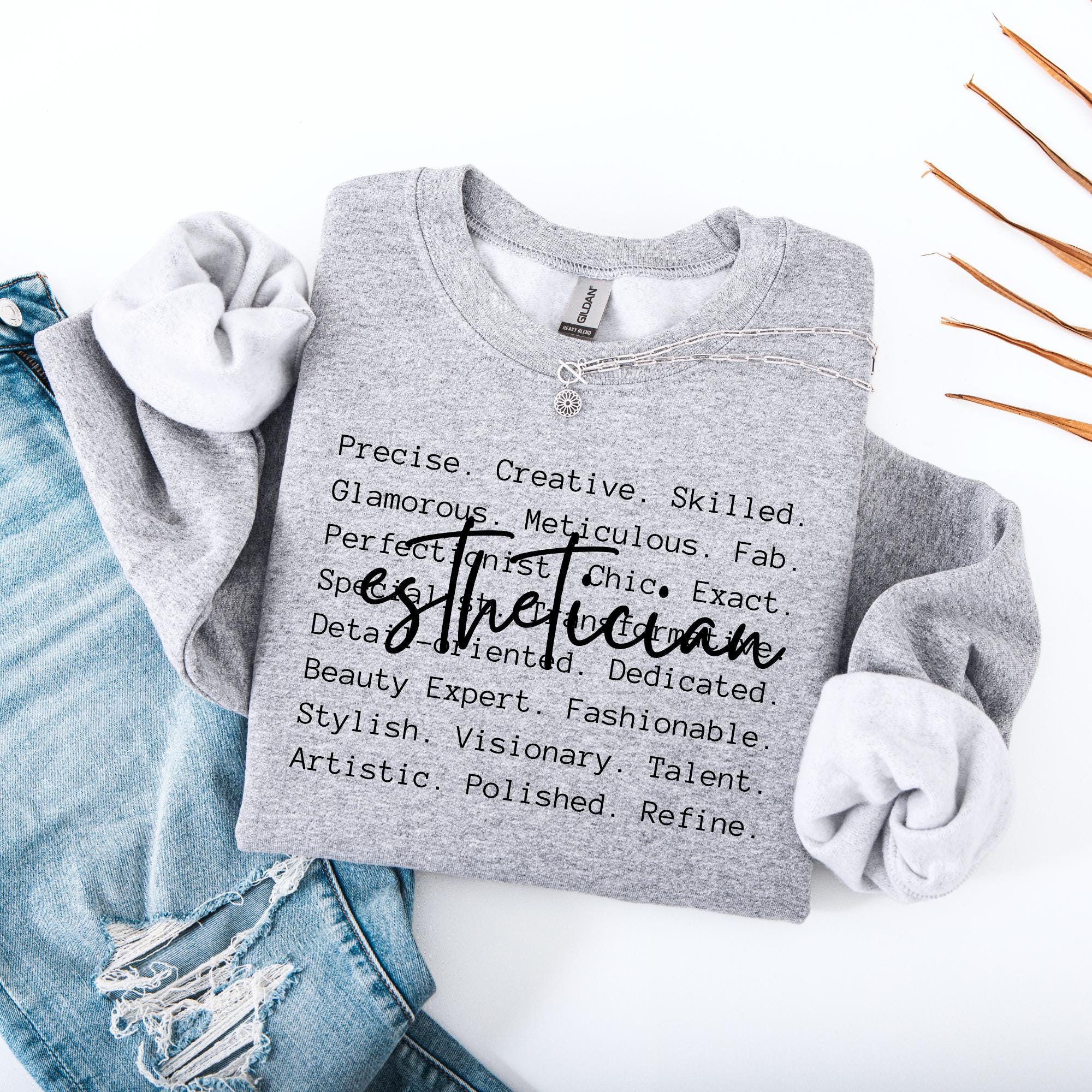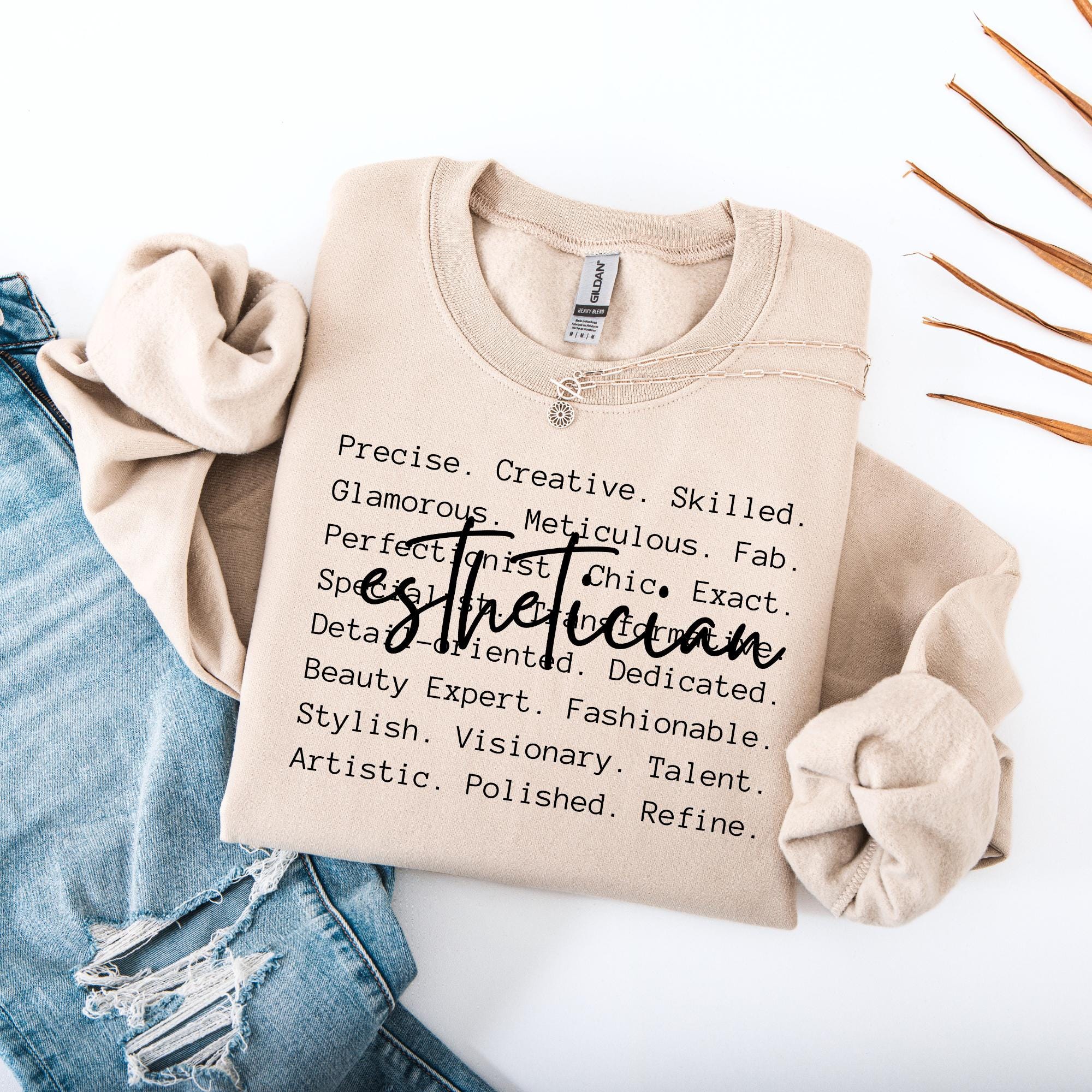 Celebrate the art of beauty and self-care with this chic Esthetician sweatshirt. Designed with empowering words like “Precise, Creative, Skilled, Visionary,” this cozy pullover makes the perfect statement piece for spa professionals, beauty school students, or anyone passionate about skincare.