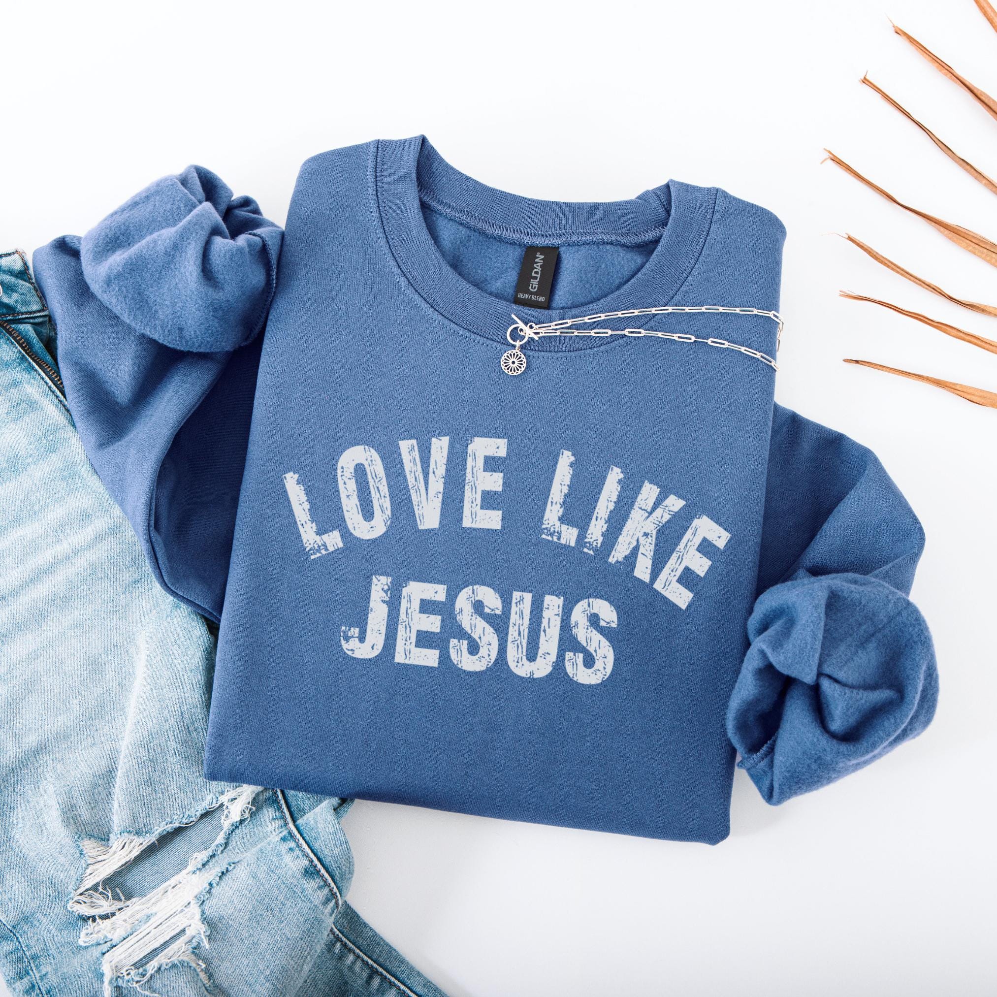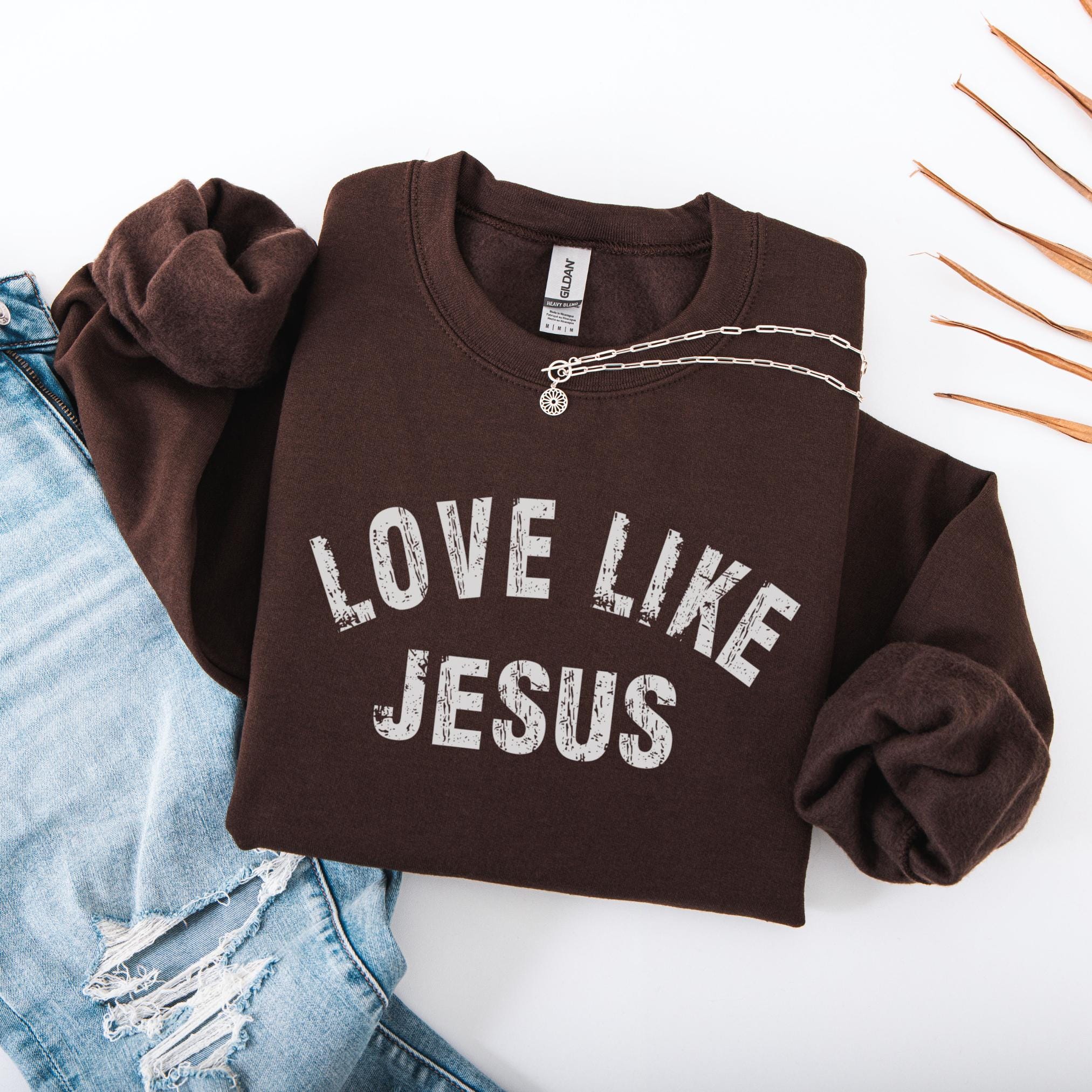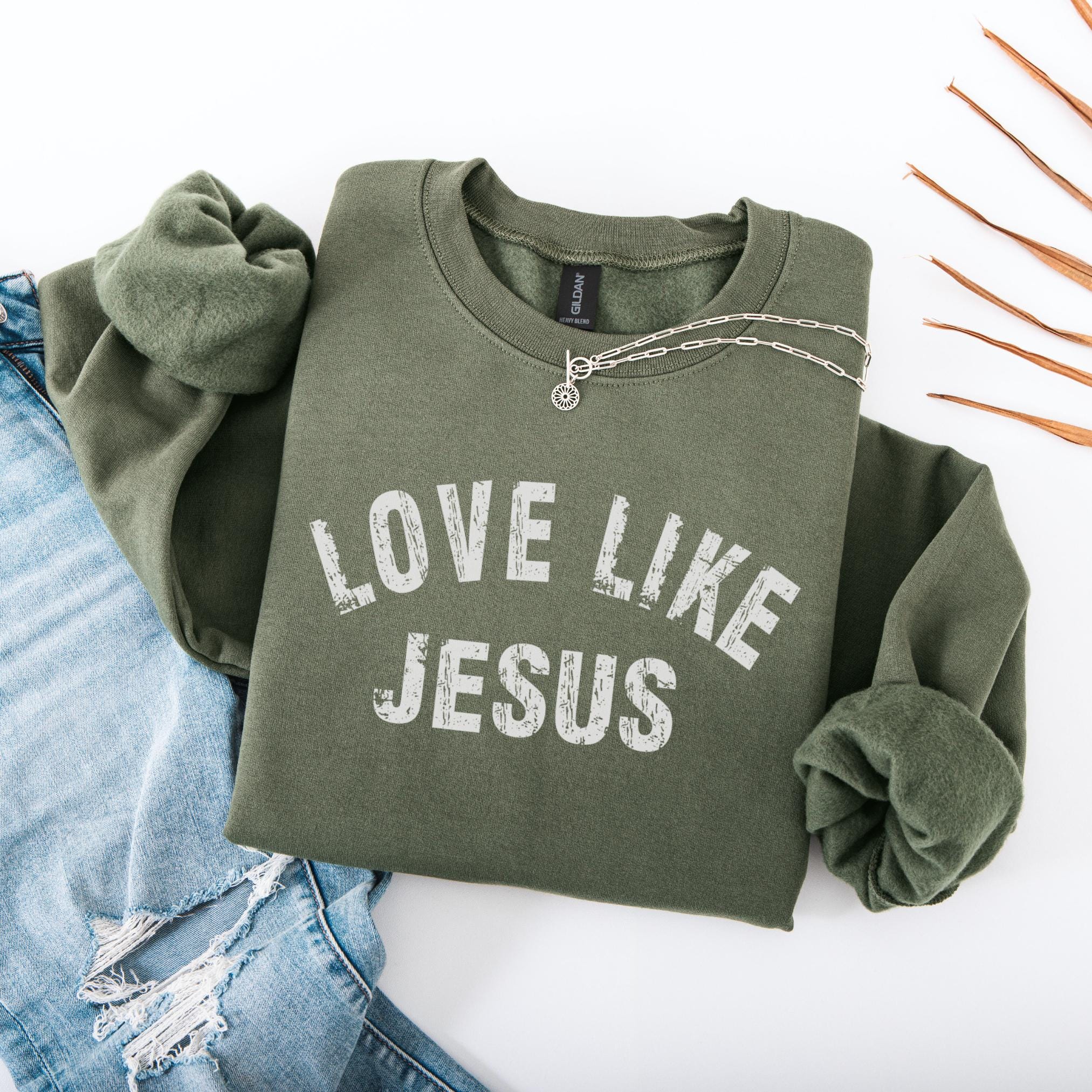 Wrap yourself in warmth and inspiration with our Love Like Jesus sweatshirt. Designed in a soft, cozy fabric and featuring a distressed white print on an earthy green crewneck, this sweatshirt is the perfect reminder to live with kindness, compassion, and love every day.