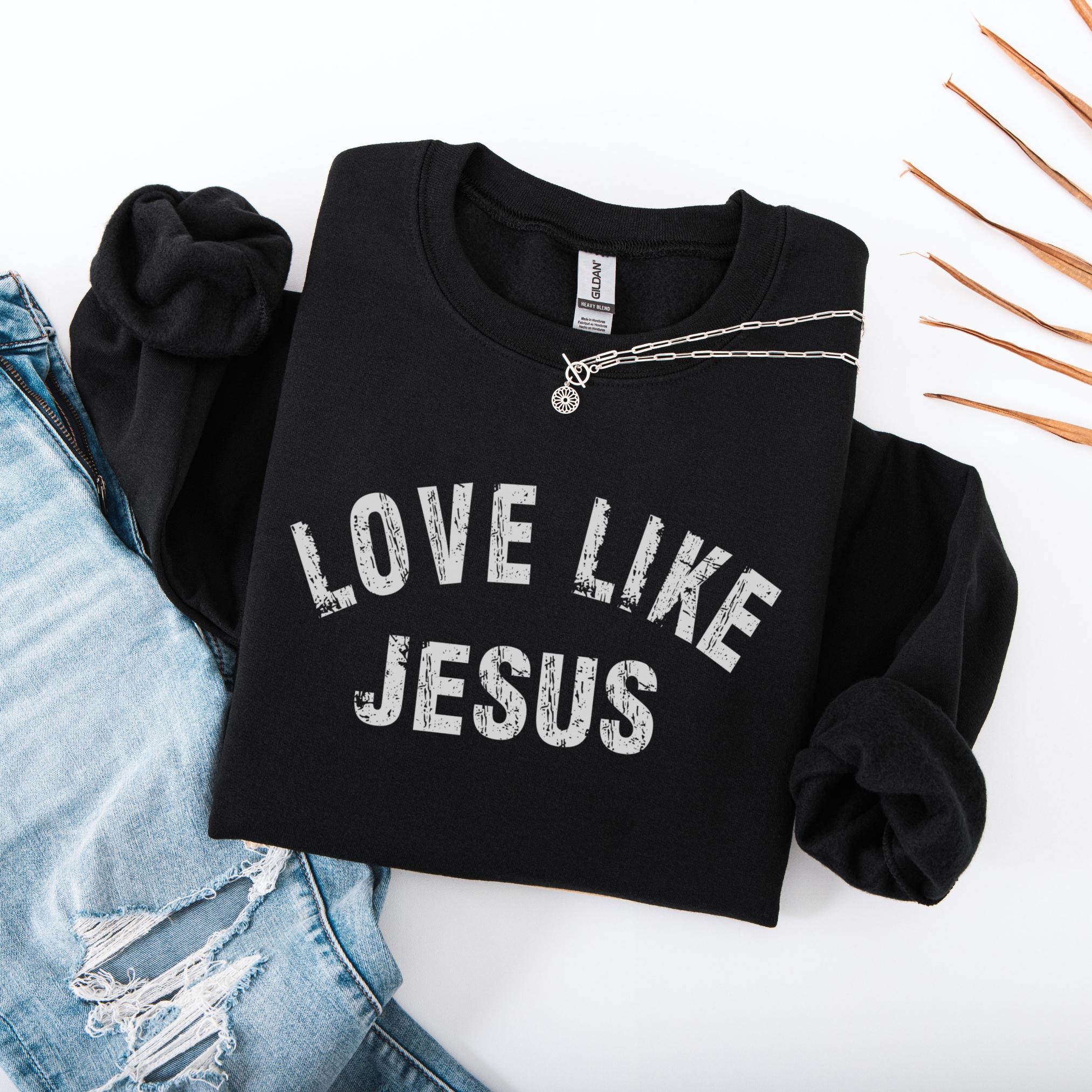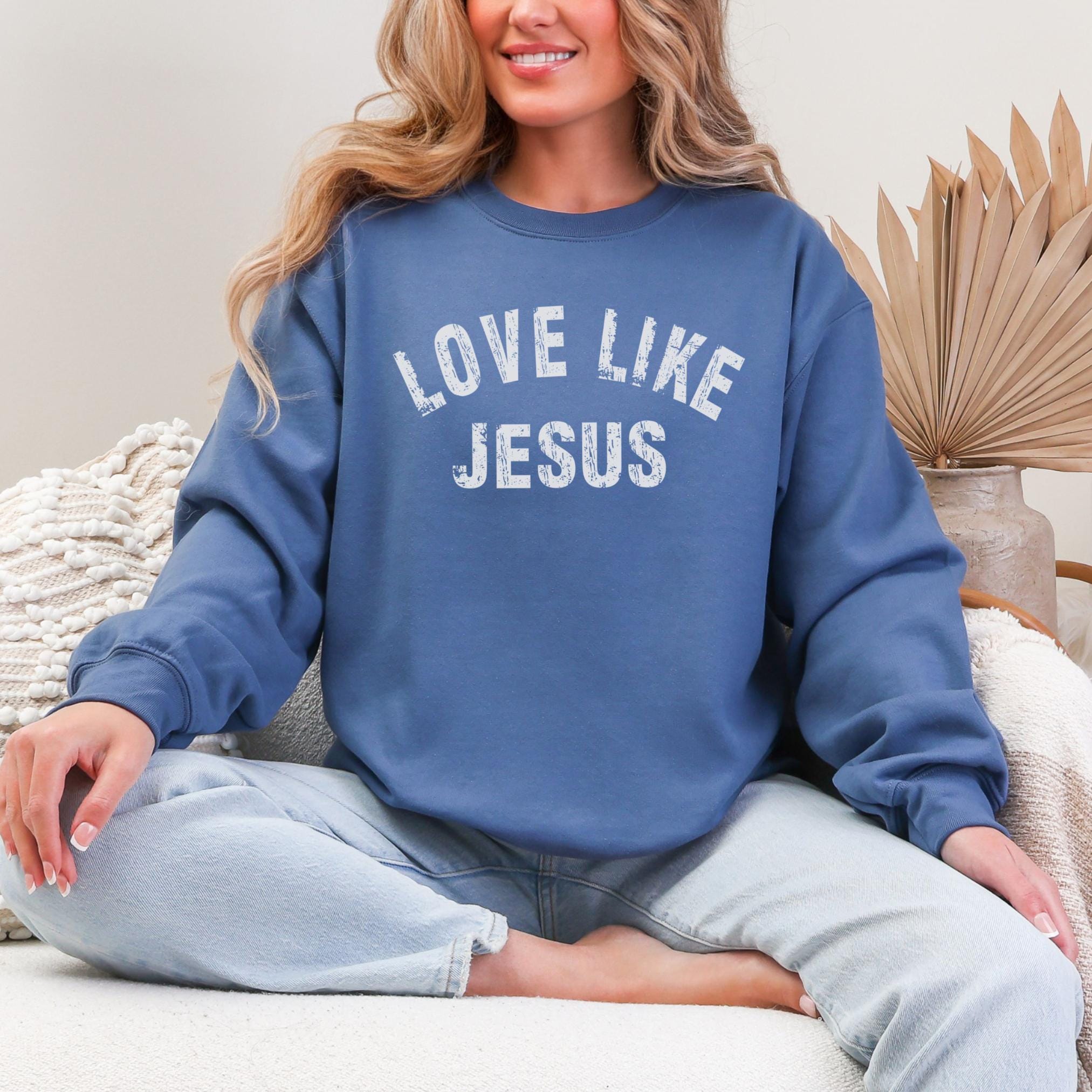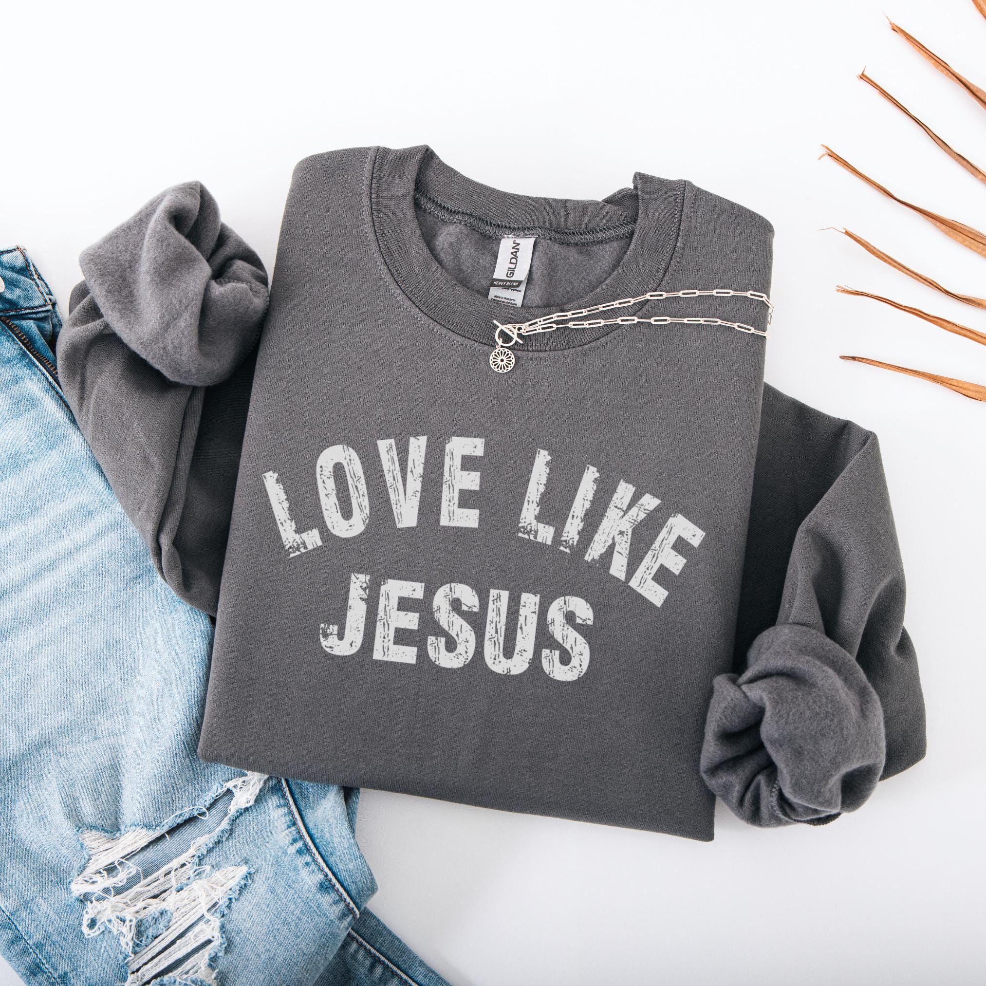 Wrap yourself in warmth and inspiration with our Love Like Jesus sweatshirt. Designed in a soft, cozy fabric and featuring a distressed white print on an earthy green crewneck, this sweatshirt is the perfect reminder to live with kindness, compassion, and love every day.