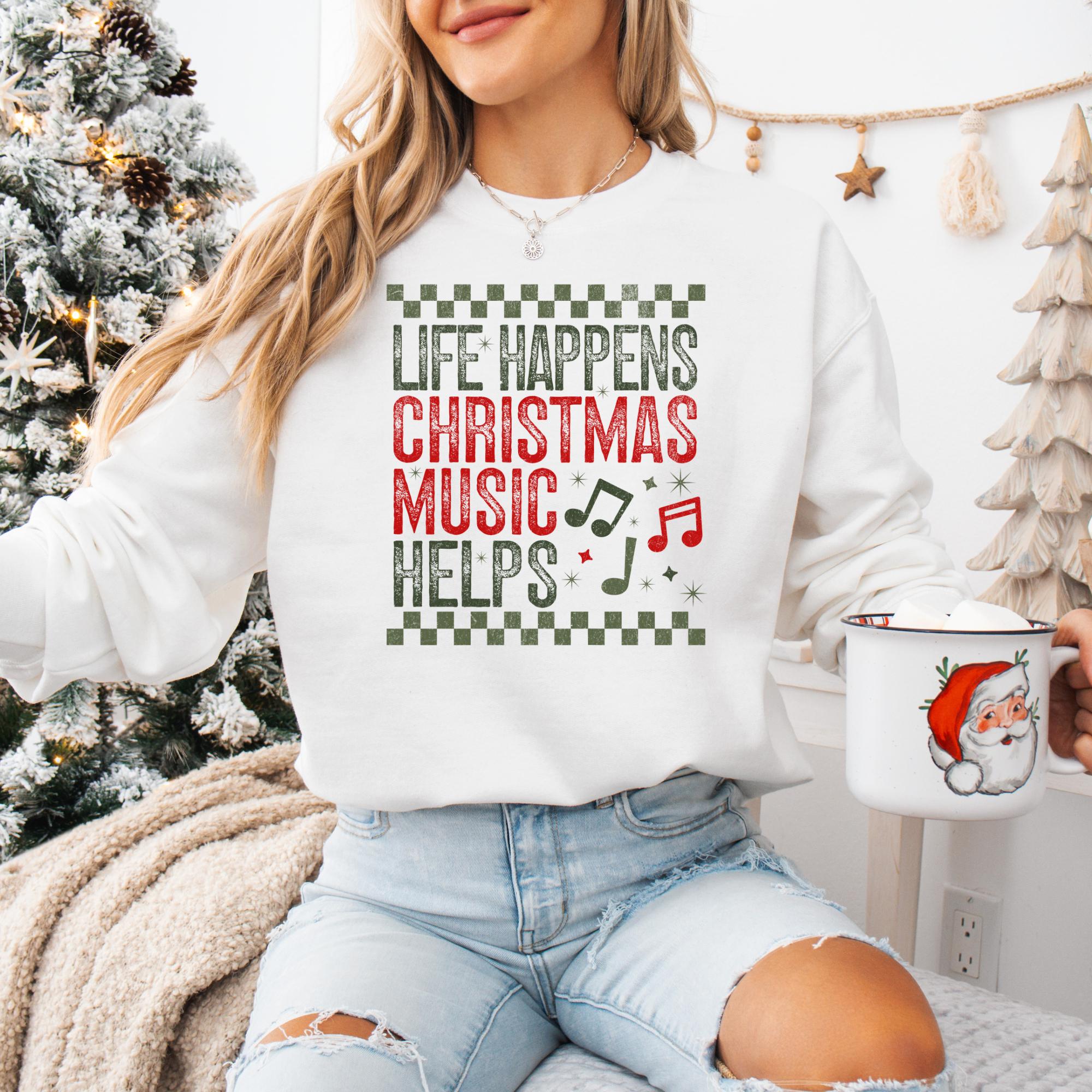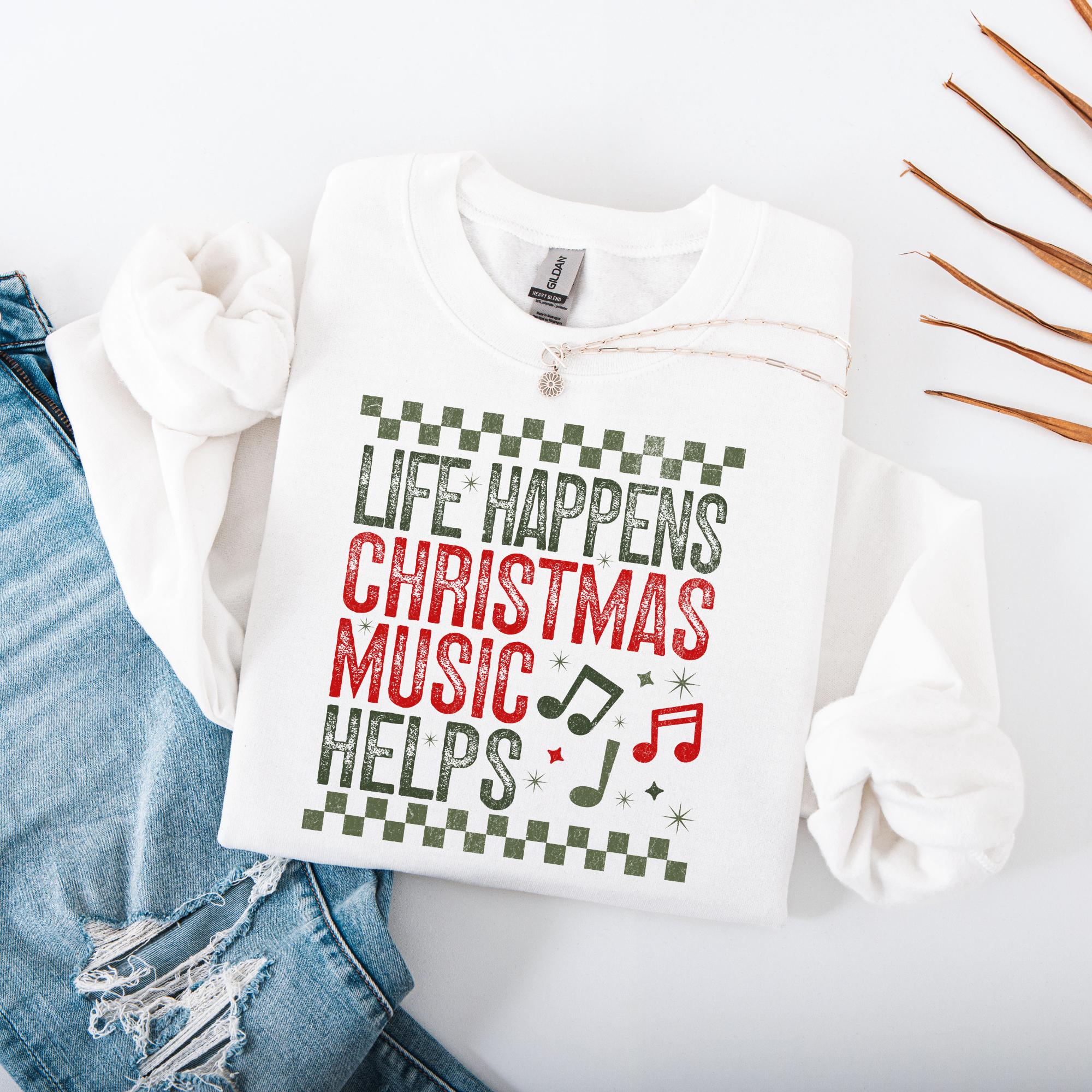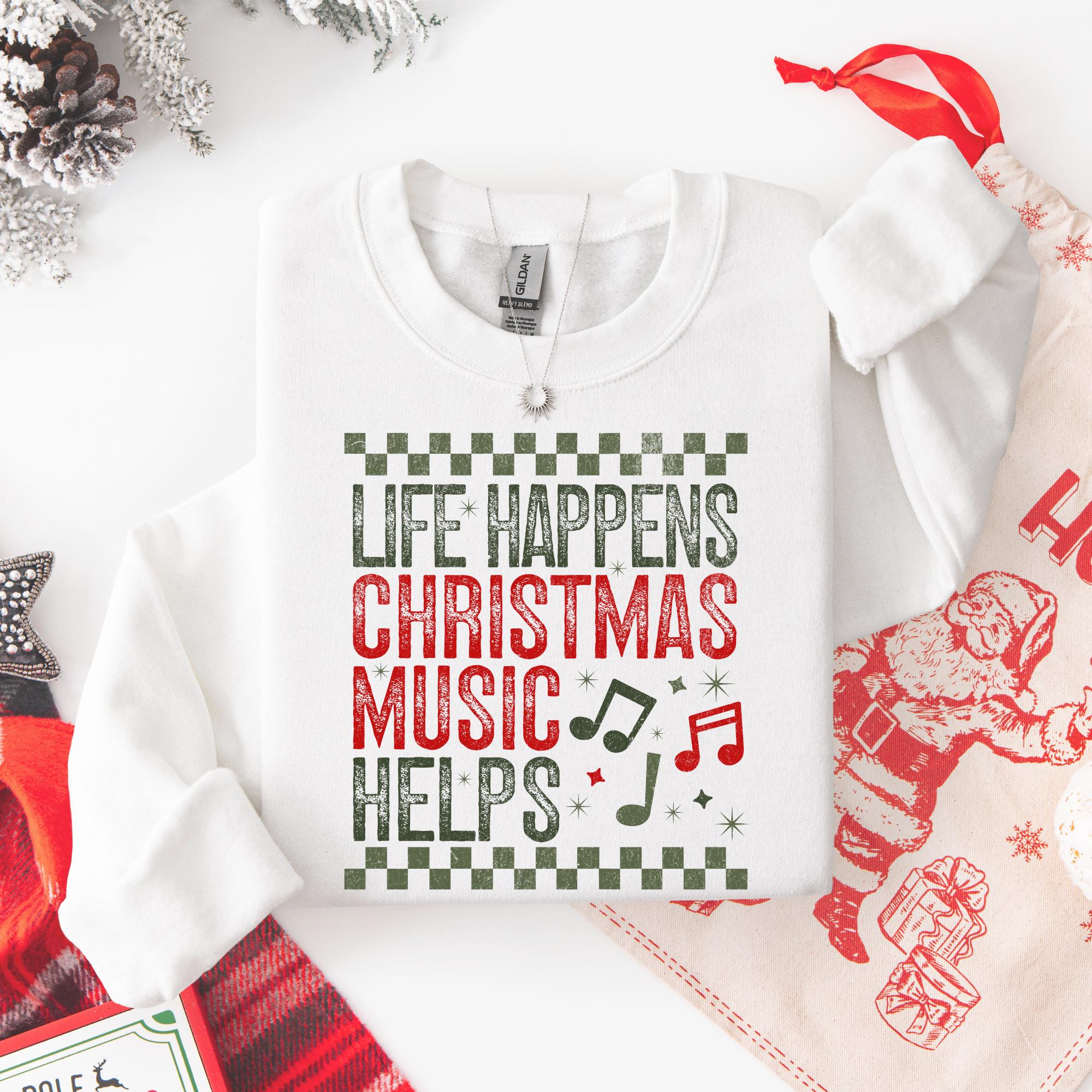Bring the holiday cheer everywhere you go with this cozy Christmas sweatshirt! Featuring the bold and festive phrase “Life Happens, Christmas Music Helps” in red and green retro lettering, this crewneck is perfect for anyone who believes holiday music is the cure for everything. 🎶✨