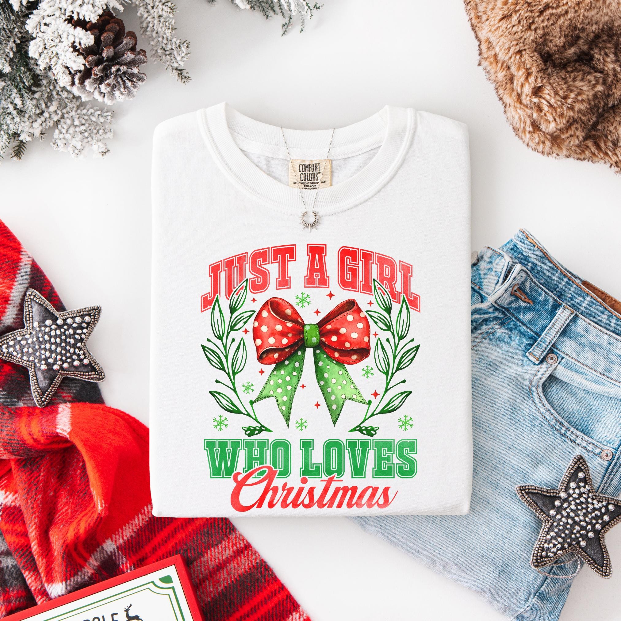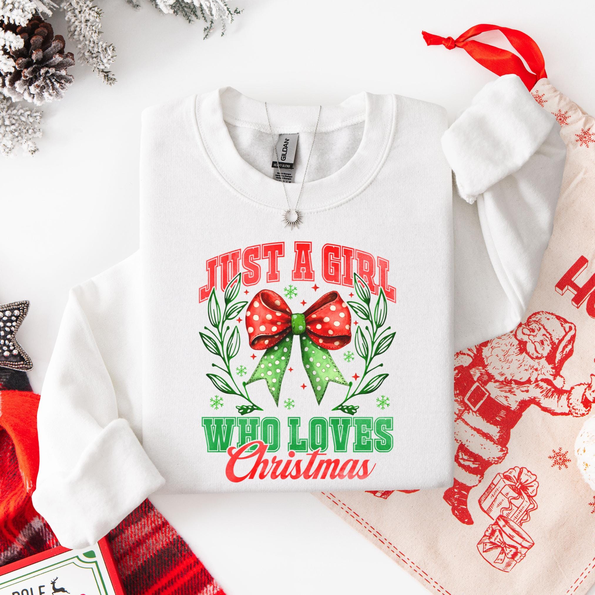 Celebrate your love for the season with our Just a Girl Who Loves Christmas sweatshirt! đ⨠This festive pullover features a cheerful red and green design with a polka-dot holiday bow surrounded by greenery and snowflakes. Itâs the perfect sweatshirt for anyone who canât get enough of Christmas magic!