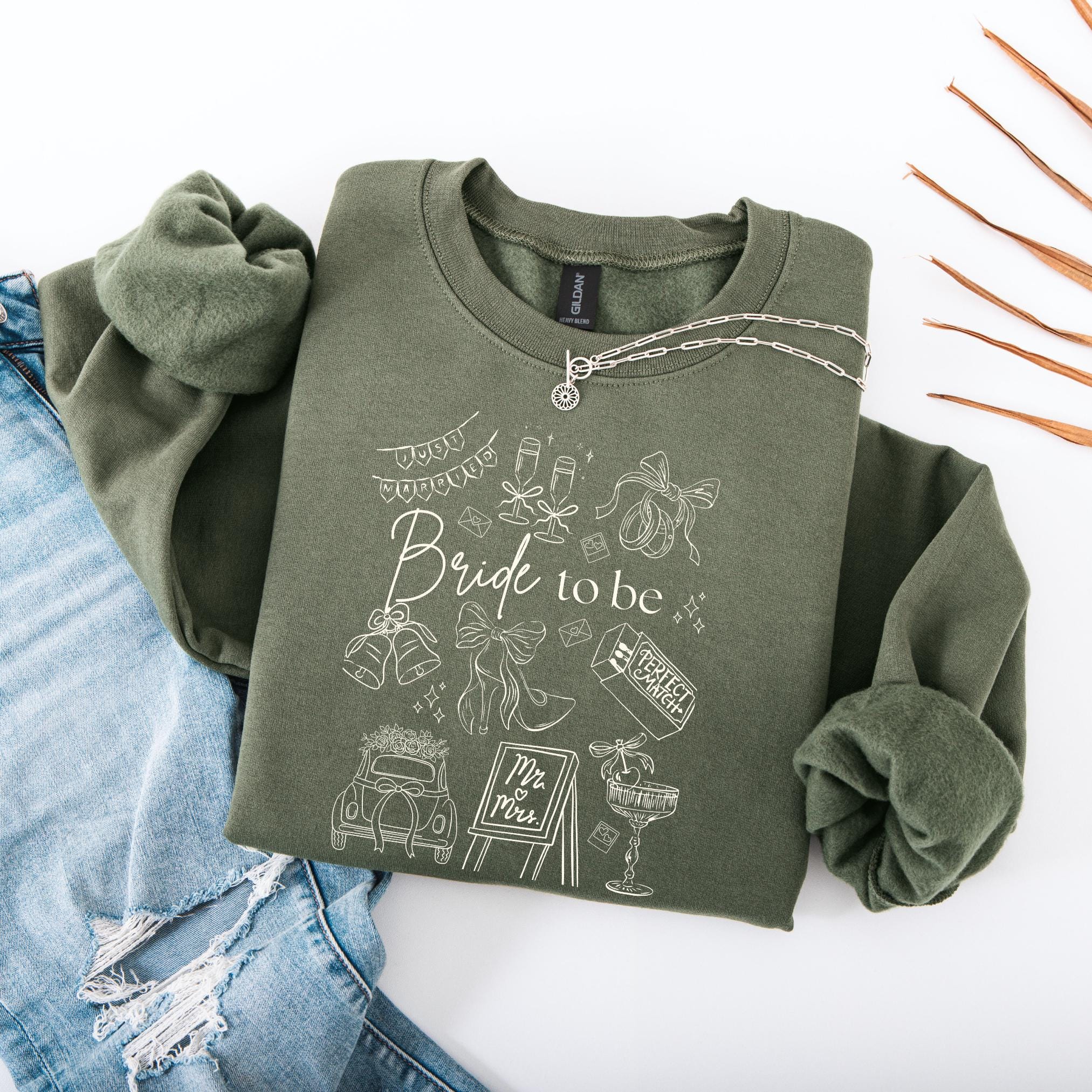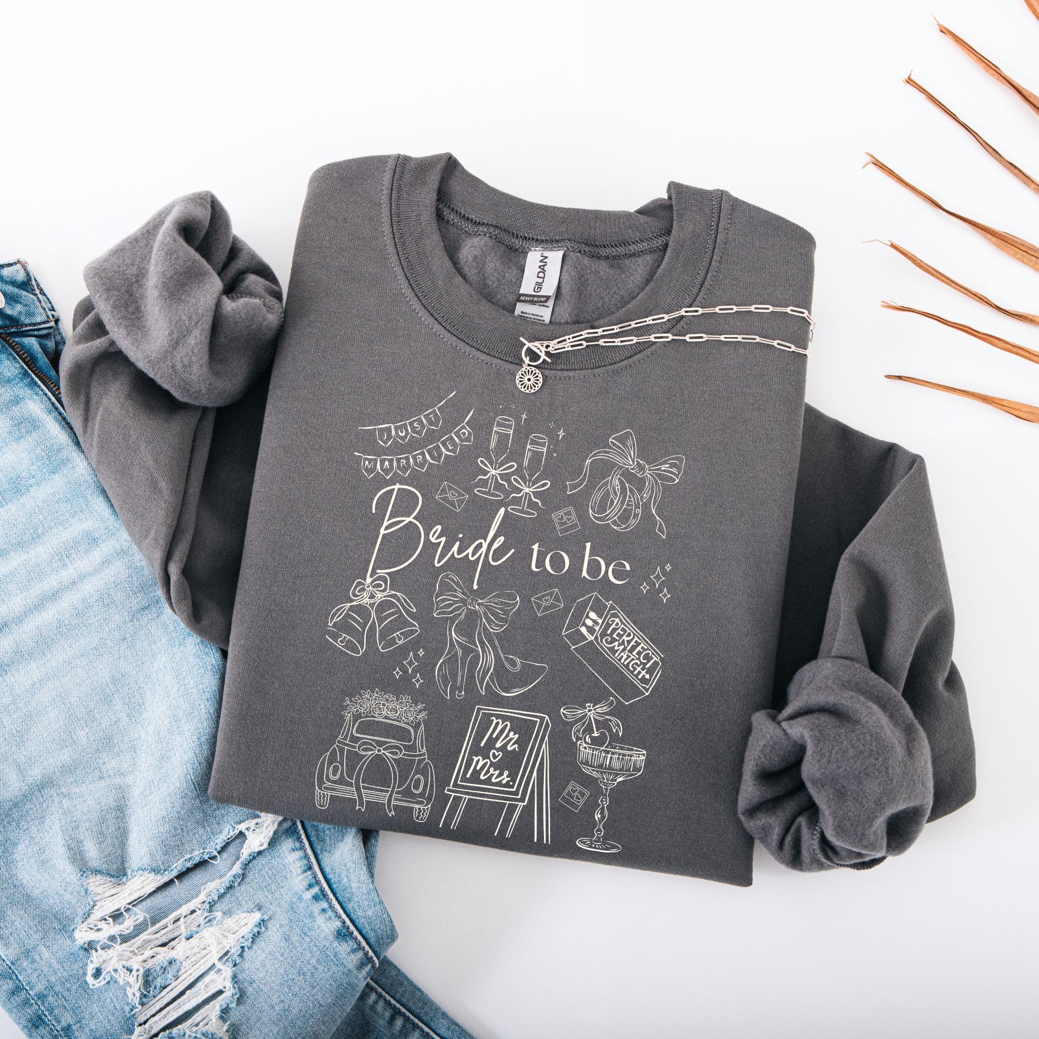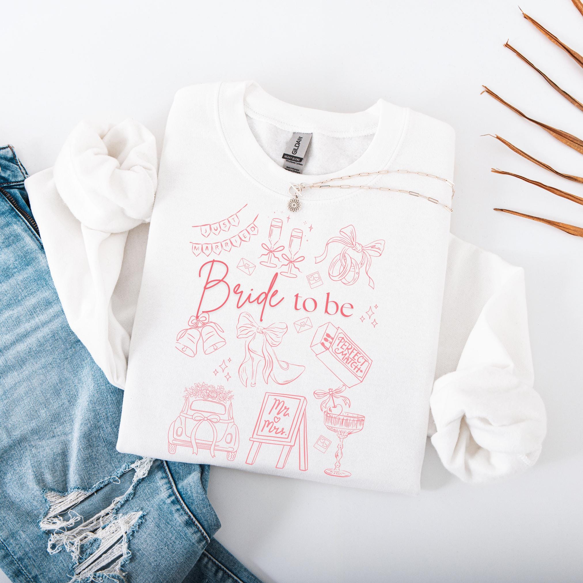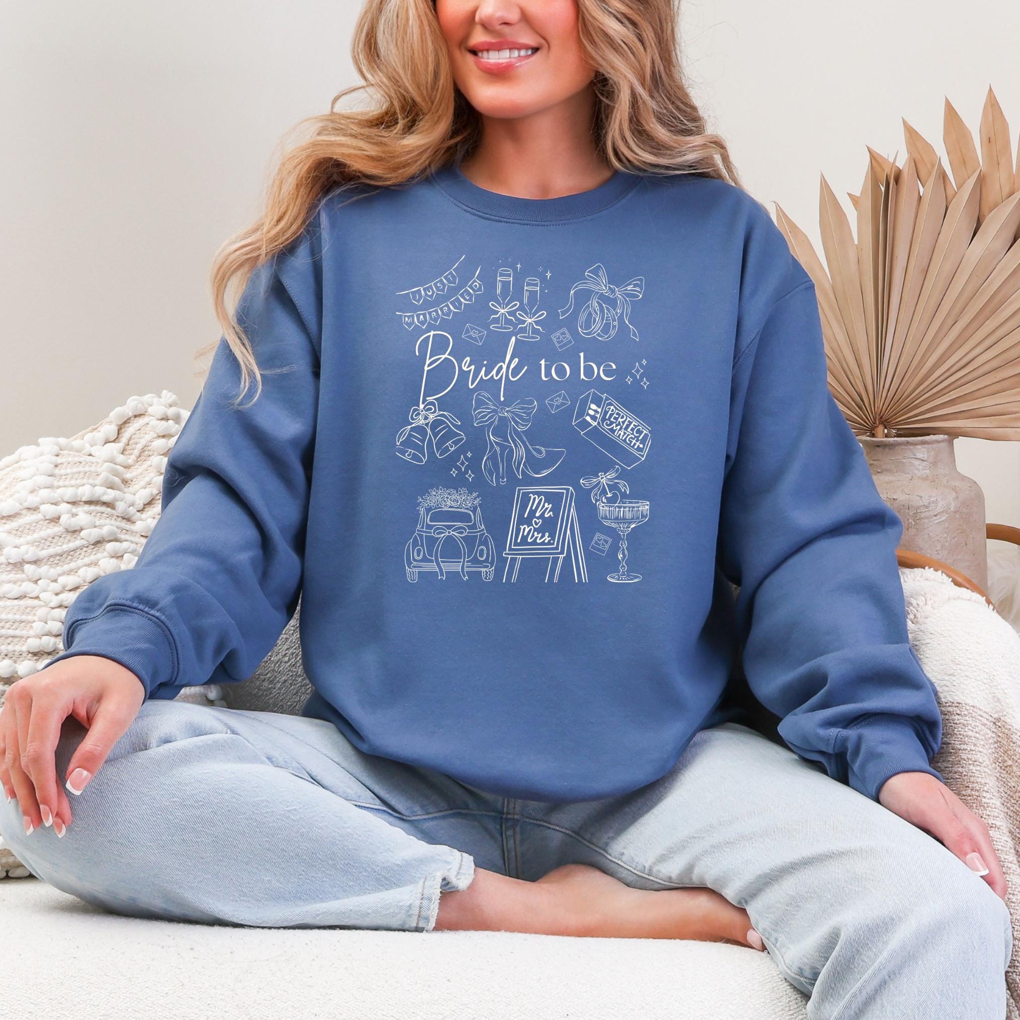 Celebrate the future Mrs. in style with this cozy Bride to Be sweatshirt! Designed with playful hand-drawn doodles like wedding bells, champagne glasses, bows, “just married” banner, and fun bridal details, this sweatshirt is the perfect piece for every bride-to-be.