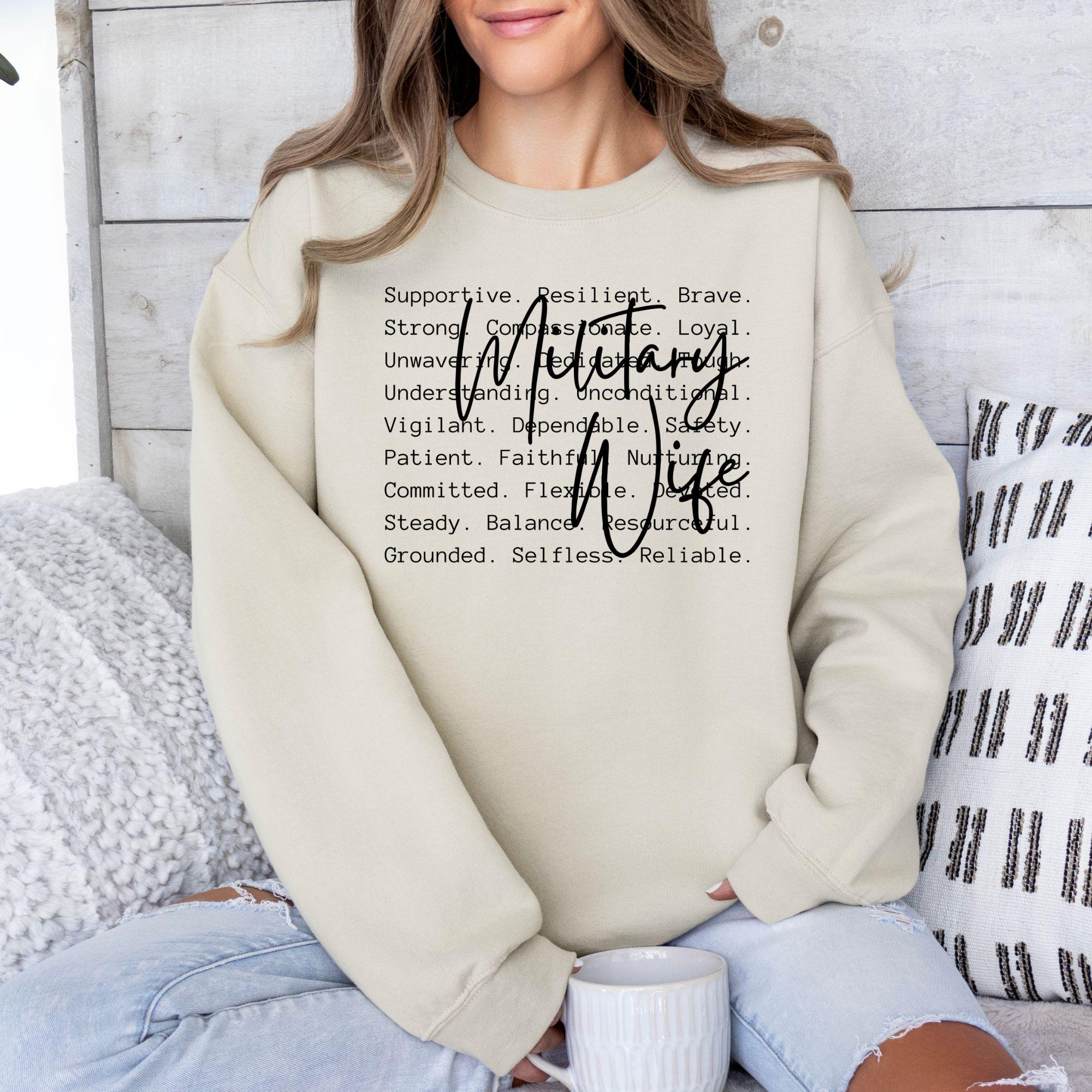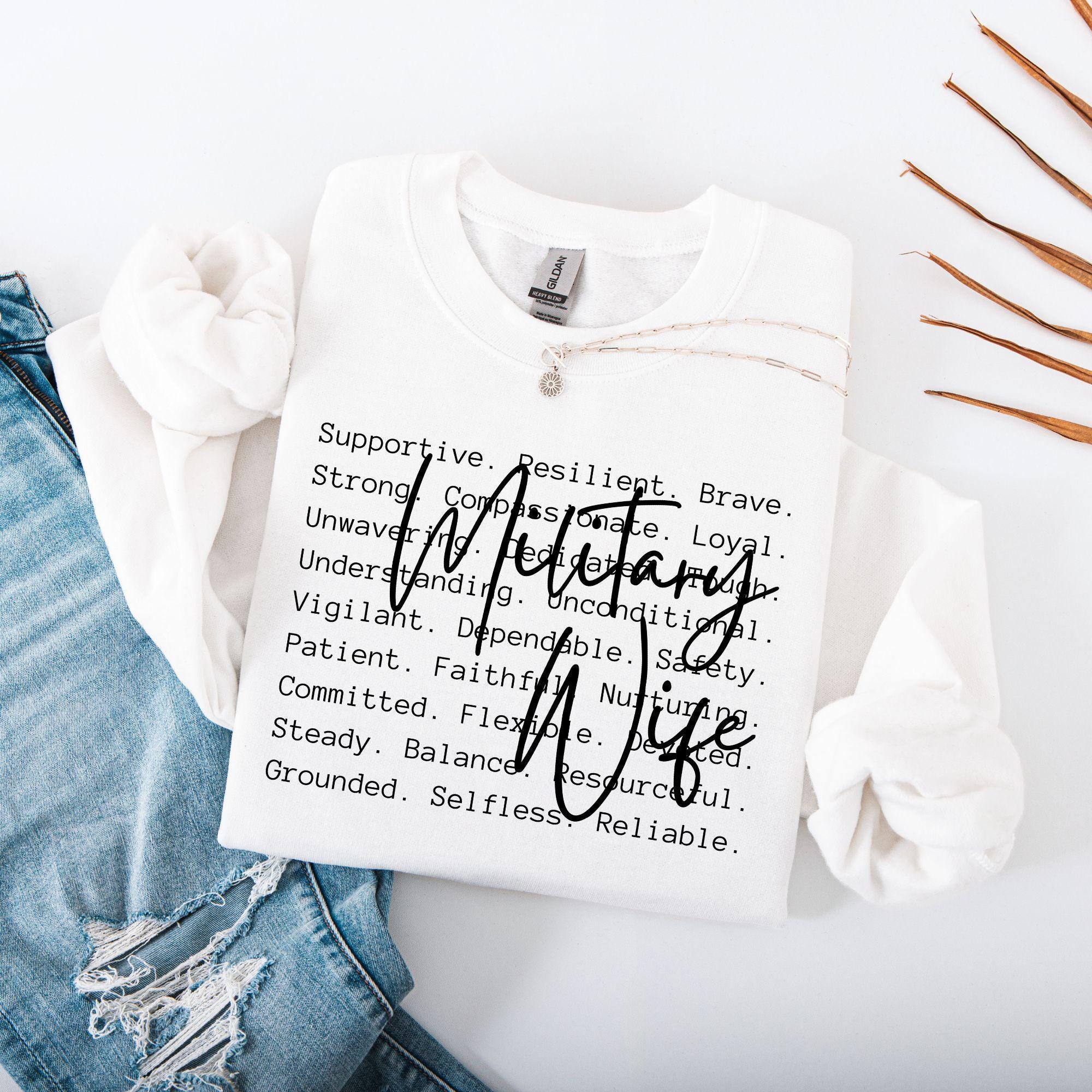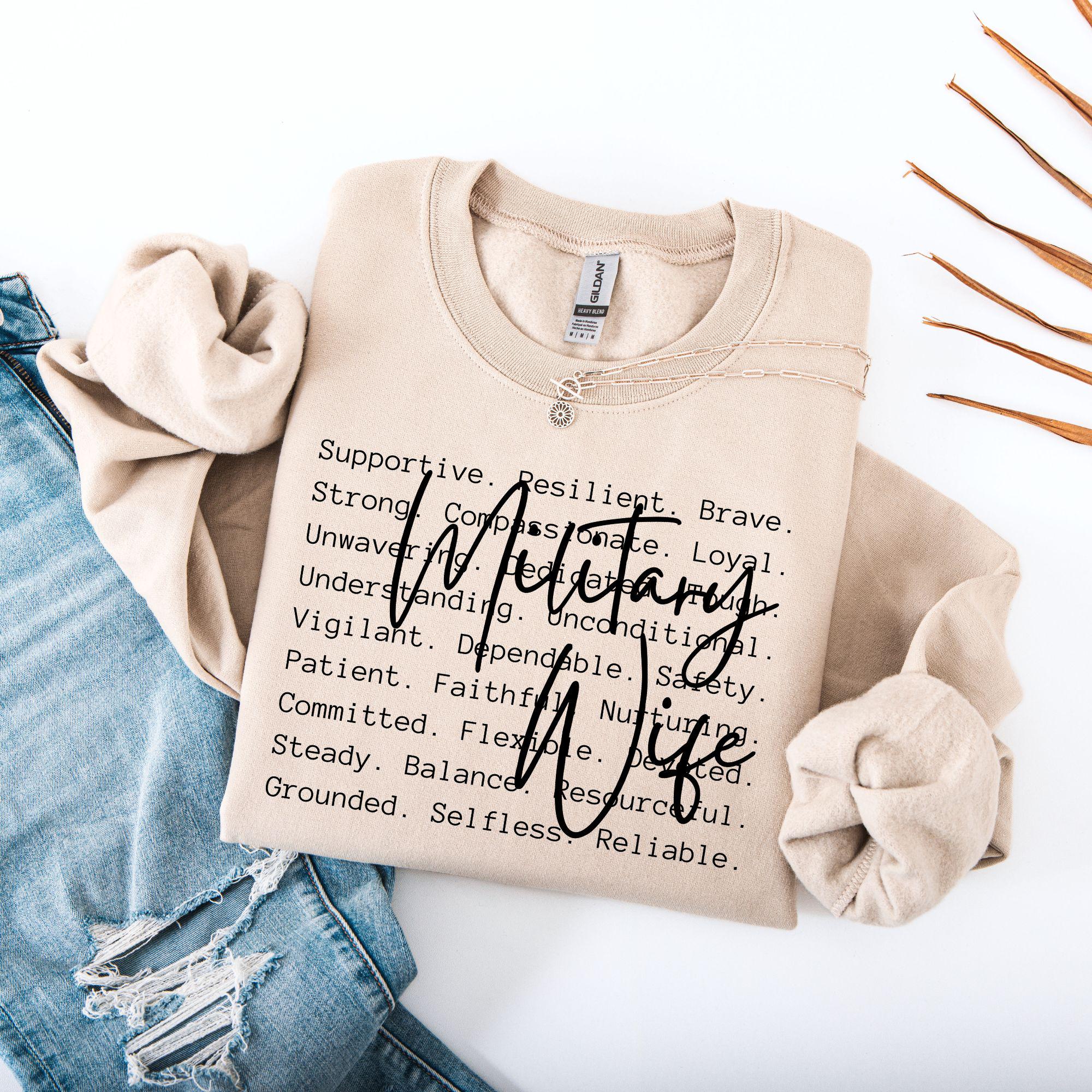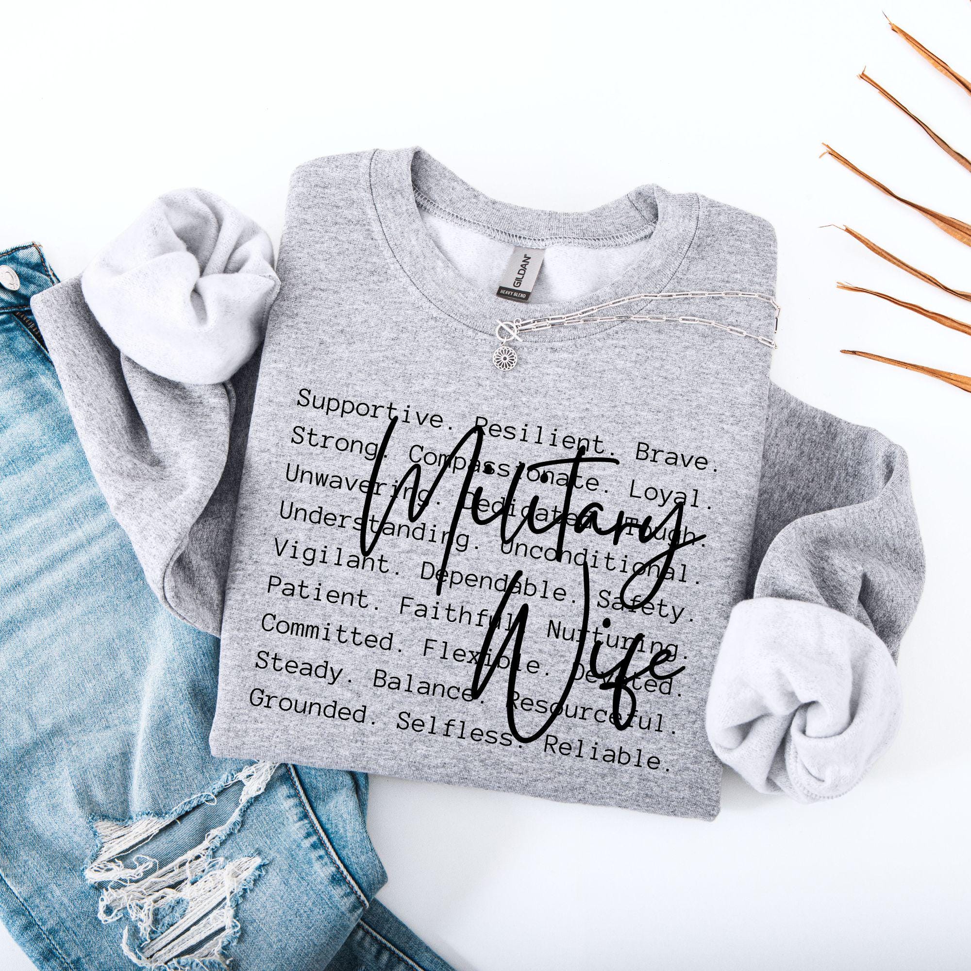 Military Wife Sweatshirt — a cozy, heartfelt tribute to the strength and love behind every service member. Featuring empowering words like Supportive. Resilient. Brave. overlaid with elegant script text reading Military Wife, this sweatshirt perfectly captures the unwavering spirit of military spouses everywhere.